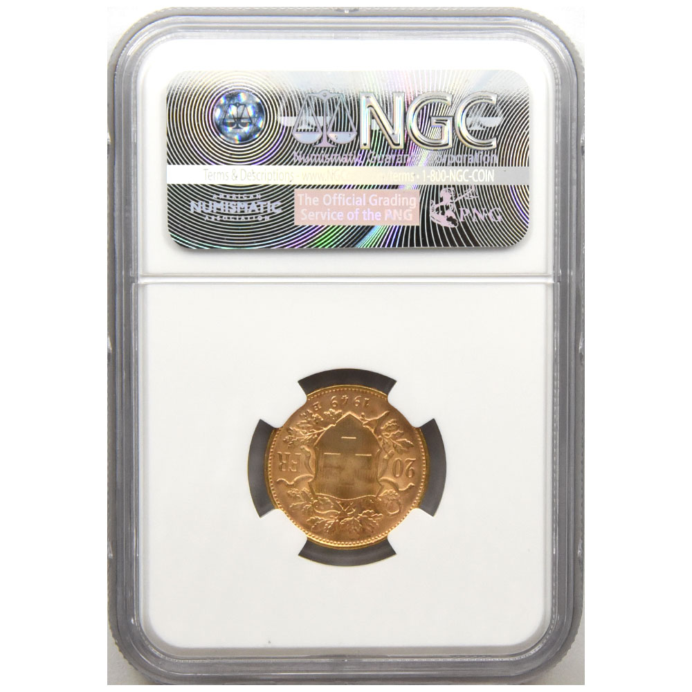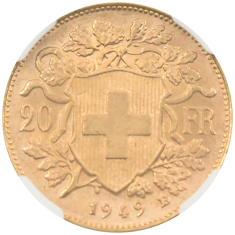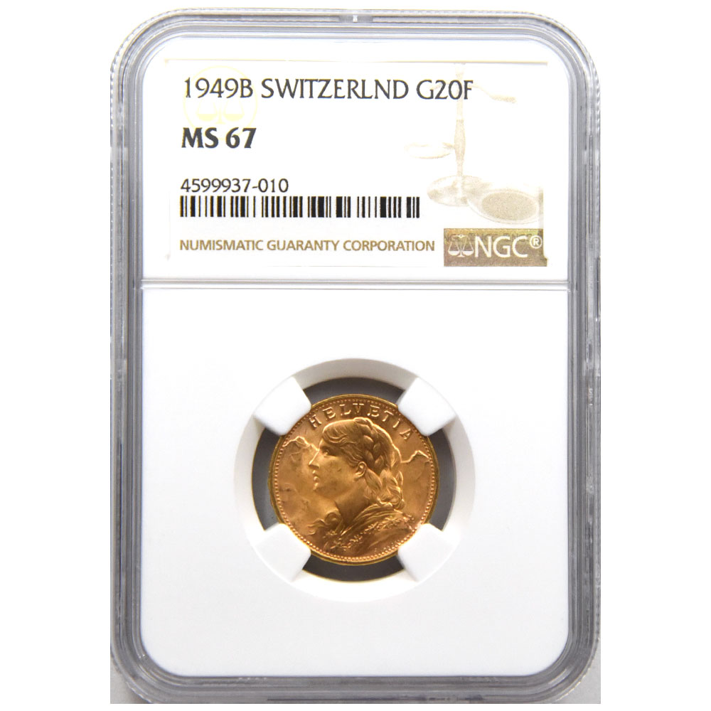 スイス 1949B 20フラン 金貨 NGC MS 67 ヘルベティア 4599937010