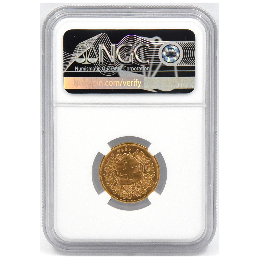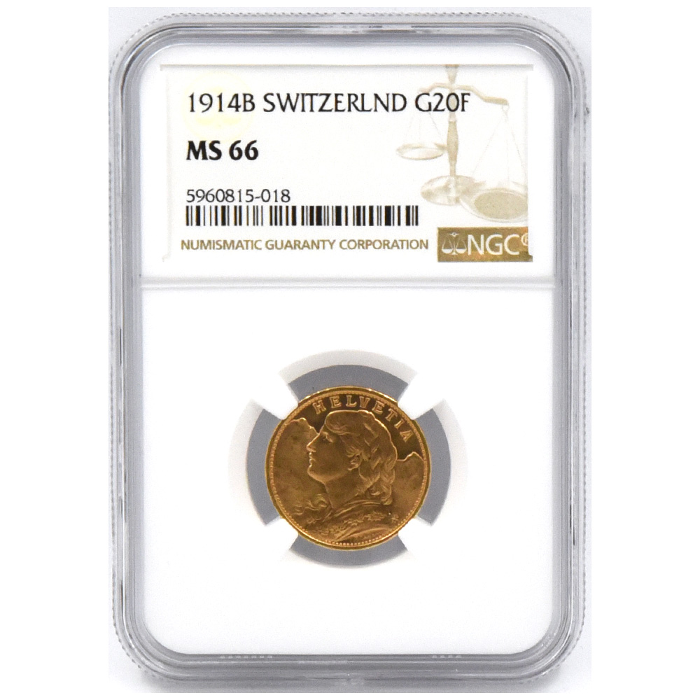 スイス 1914B 20フラン 金貨 NGC MS 66 ブレネリ 5960815018