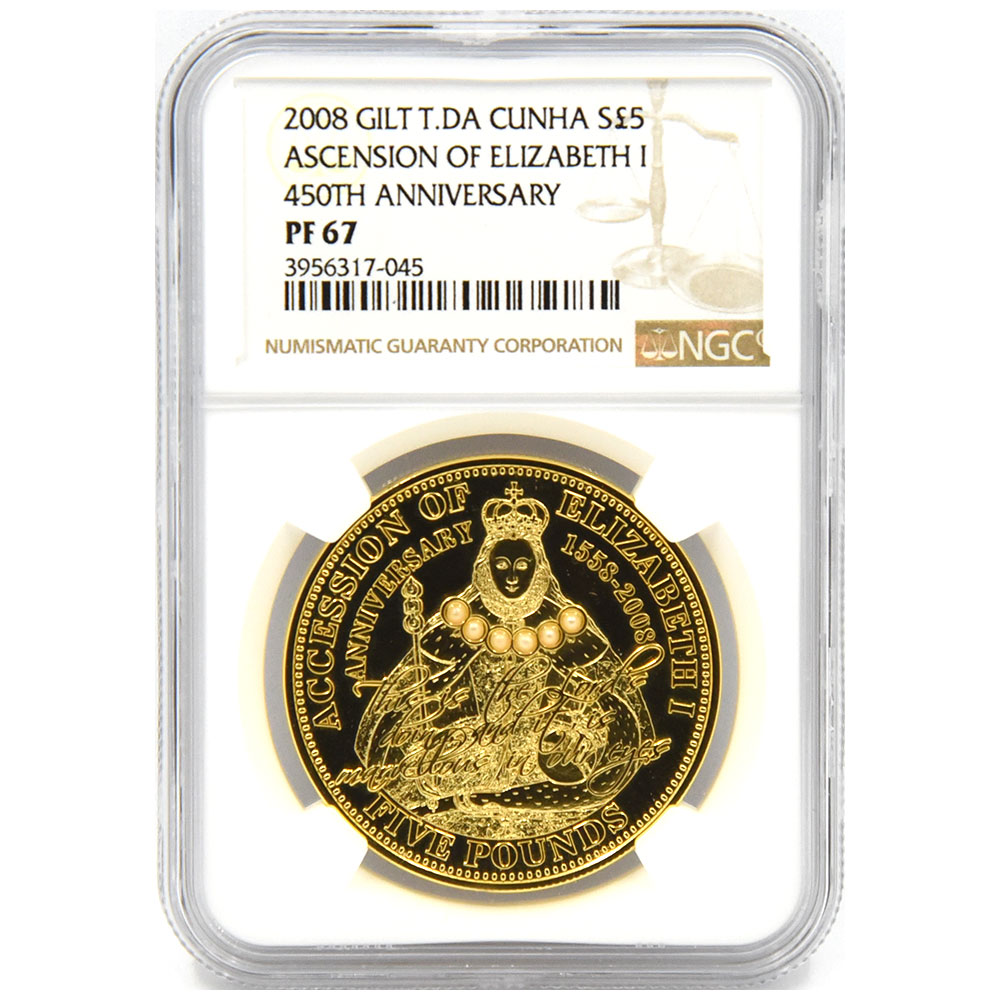トリスタン・ダ・クーニャ島 2008 エリザベス1世 5ポンド 金メッキ銀貨 NGC PF67 エリザベス1世即位450周年記念 3956317045