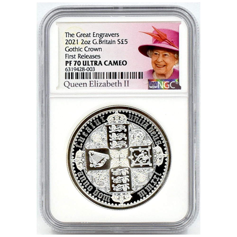 イギリス 2021 エリザベス2世 5ポンド 2オンス 銀貨 NGC PF70UC ゴチッククラウン リバースシールド 6319428003