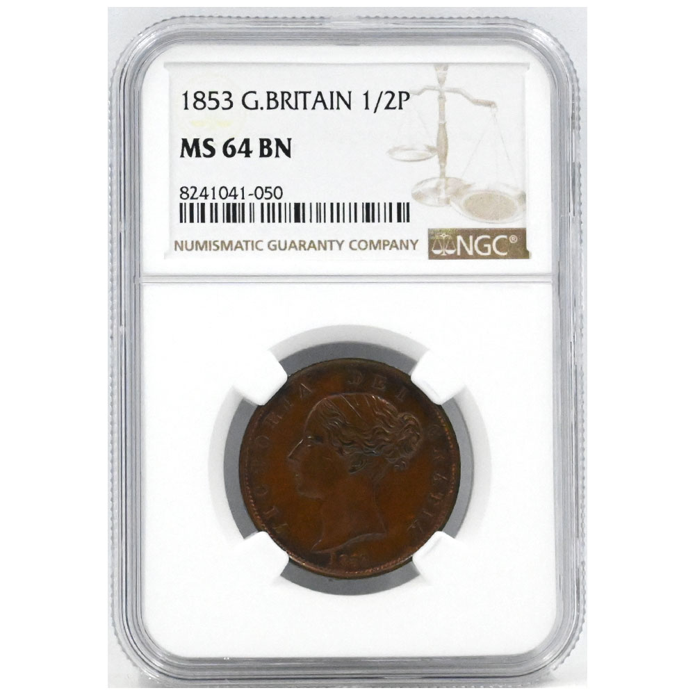 イギリス 1853 ヴィクトリア ハーフペニー 銅貨 NGC MS64BN ブリタニア 8241041050