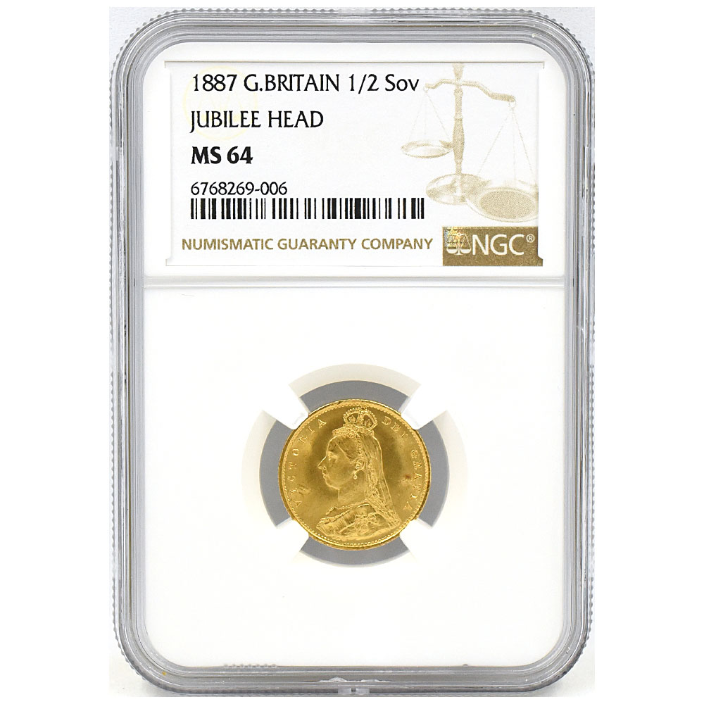 イギリス 1887 ヴィクトリア女王 1/2ソブリン 金貨 NGC MS64 ジュビリーヘッド 盾 6768269006