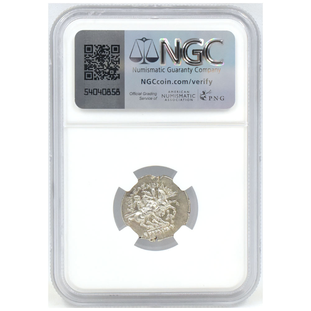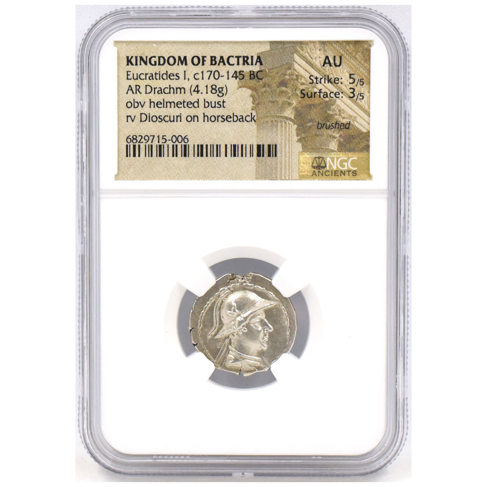 バクトリア王国 c.170–145 BC エウクラティデス1世 ドラクマ(4.18g) 銀貨 NGC AU Strike:5/5 Surface:3/5 兜を被った王の胸像 騎馬のディオスクロイ 6829715006