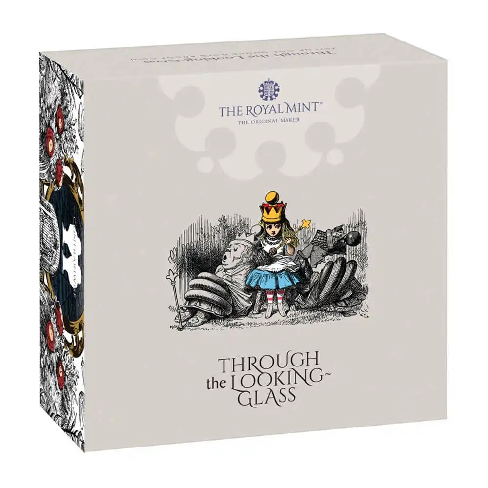 当コイン裏面にはこの神秘的な物語の中でも最も印象的な一場面が描かれています。姿かたちが似ている2人の兄弟、トゥイードルダムとトゥイードルディーがアリスと出会う感動的なシーンです。不思議かつ神秘的な物語を視覚化することがいかに重要なことであるかを、このサー・ジョン・テニエルによるオリジナル・デザインは真摯に伝えています。裏面にはロイヤルミントの俊英ジョディ―・クラークによる「エリザベス女王の第5肖像」が描かれていますが、女王自身も幼い頃、母エリザベス皇太后や祖母メアリー王妃にこの物語を読んで聞かせて貰っていたのかも知れません。親から子へ、また子から孫へと読み継がれていく永遠の価値を有する「鏡の国のアリス」は、継承される文化としての普遍的価値を併せ持つ優れた作品です。出版から150年の時を経て発行された当コインは、コインファンを謎と神秘に包まれた「鏡の国」へと誘います。