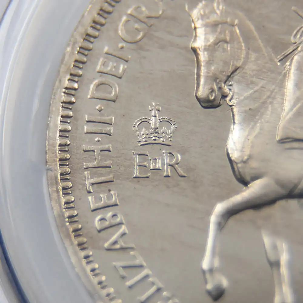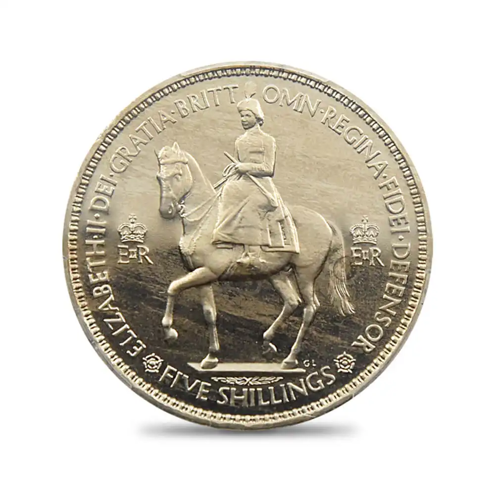 ©トゥルーピング・ザ・カラー式典でのエリザベス2世 1951 pinterest 1953年、エリザベス2世の世紀の戴冠式の年に発行された当5シリング貨は、若き日の女王の気品と今は無き戴冠式当時の古き良き英国の面影をノスタルジックに表現する最も古い時代に属するモダンコインの佳作です。