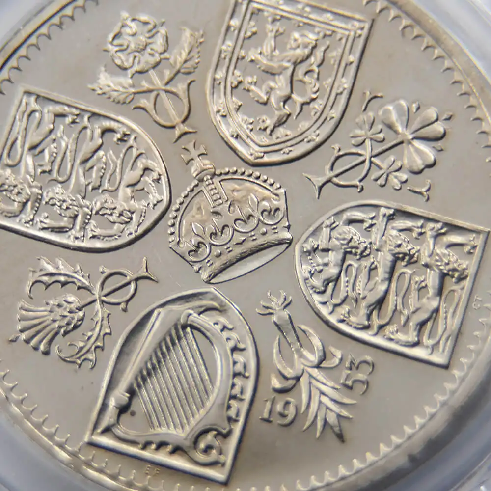 そしてコイン裏面にはイギリス連邦に属する4カ国の国章と共に、それぞれの国家を象徴する花が描かれ、中央に英国王位を示す王冠、さらにコイン下部には戴冠式の年を示す1953の数字が刻まれています。新女王の戴冠式を寿ぐ祝祭感で満たされた当5シリング貨は、その後半世紀以上にわたって英国民を導き、齢を重ねて存在感を増す英国女王の若き日の栄光の軌跡を永遠に刻むアニバーサリーコインの極致です。