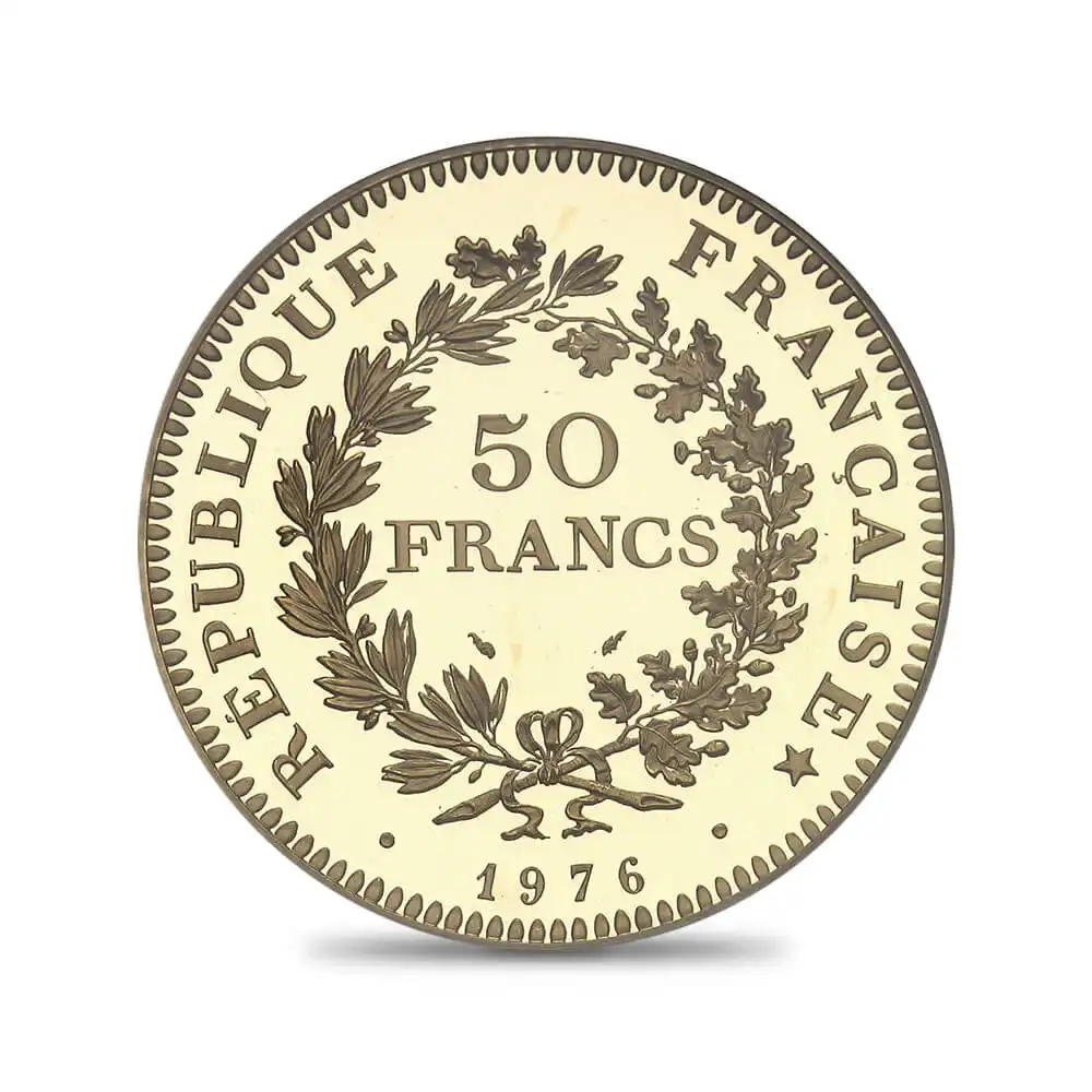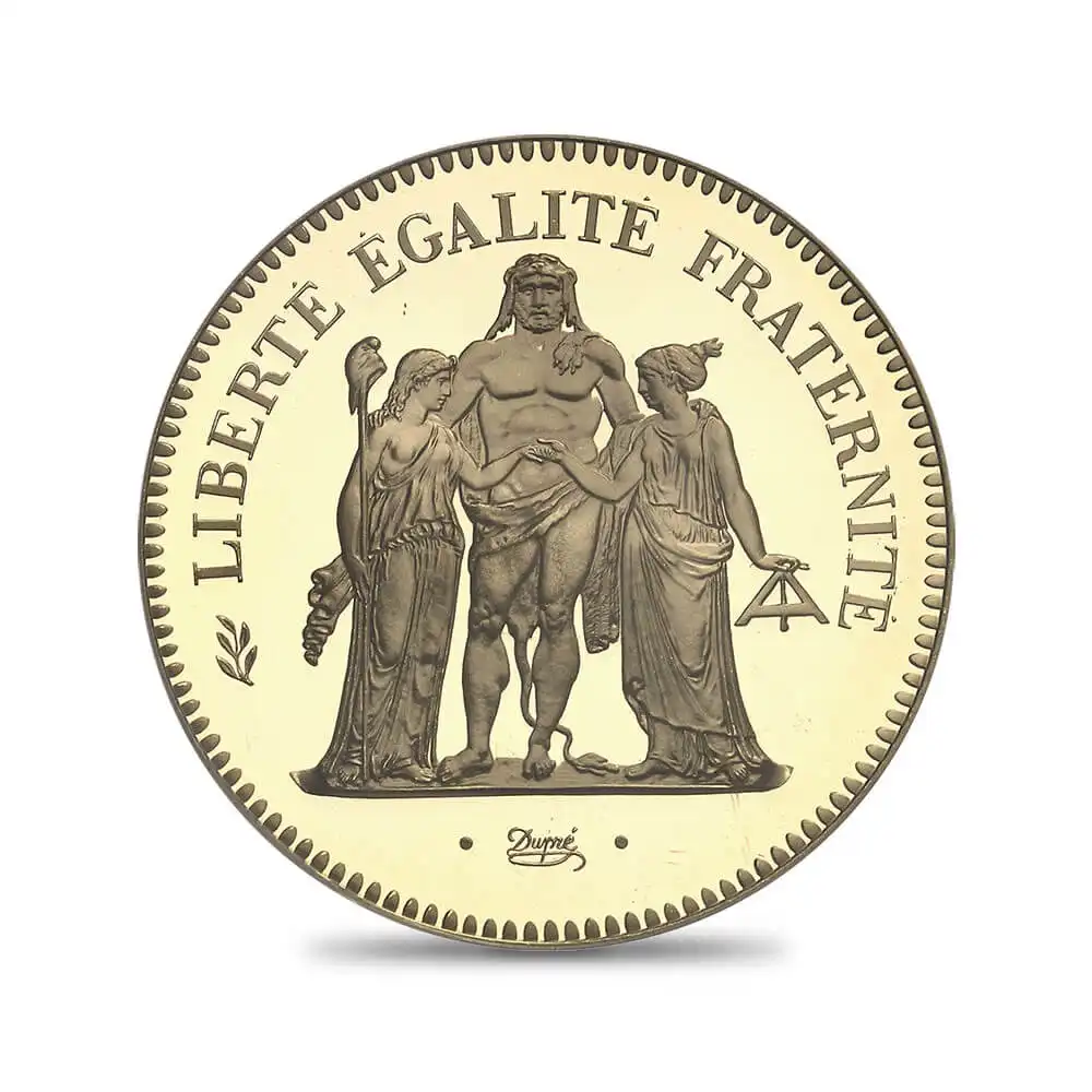 フランス共和国が国家の威信を賭けて世界に贈る歴史的名貨のご紹介です。その威厳ある秀逸なデザインは、発行後40年以上を経た現在においても未だ衰えぬ人気と圧倒的存在感を誇ります。コイン表面中央にはギリシャ神話最大の英雄ヘラクレスの立像、向かって左には古代フリュギア風のキャップを載せた棒を掲げる自由を象徴する女神、そして右には天秤を持った平等を象徴する女神の三神が描かれ、現在のフランス共和国のモットーである自由、平等、博愛をそれぞれ暗示しています。この標語の起源は18世紀のフランス革命期に遡り、革命のスローガンの一つとして取り挙げられたのが始まりですが、実際にフランスの公式な標語として採用されることになるのは19世紀末の第三共和政を待たなければなりませんでした。ちなみに「博愛」と日本語訳されるFraternite=フラテルニテは、どちらかというと兄弟愛、もしくは同志愛に近いニュアンスを持つ言葉です。裏面には2種の若木の枝から成る冠が中央に掲げられており、「フランス共和国」の国名と共に、過去のフランスの栄光の歴史を華麗に彩っています。ヘラクレスはギリシャ神話に登場する英雄で、同神話の数多くの半神半人の英雄の中で最も重要な存在として描写され、後にオリュンポスの神として崇められるようになります。古代ギリシャ各地において神として祀られたヘラクレスは、古代ローマ帝国においても信仰の対象とされていました。「あまねく強者」を意味するギリシャ神話に登場する王エウリュステウスは、その部下であるヘラクレスに対し「十二の功業」の遂行を命じたとされています。この逸話から、「ヘラクレスの選択」と言えば、敢えて苦難の道を突き進むことを意味するようになります。この象徴的なデザインがコインの主題として最初に紹介されるのは王政廃止が宣言された1792年9月21日から、ナポレオン1世による帝政が宣言された1804年5月18日まで存続していた第一共和政下においてでした。しかし、長い空白期間を経てこのデザインが再びフランス・コインの意匠として輝かしい復活を果たすのは1970年のことで、同年から5フラン白銅貨の発行が開始されたことを記念して、同じデザインのピエフォータイプ(厚打ち)の金貨・銀貨・プラチナ貨がリリースされ、70年代のフランス貨幣界を大いに賑わせました。当ピエフォー金貨は海外のオークションでも出品される度にその完成されたデザインゆえに話題となる人気の高いコインで、100gを超える重量のため金の質感を生々しく感じることのできる感動的な傑作コインです。