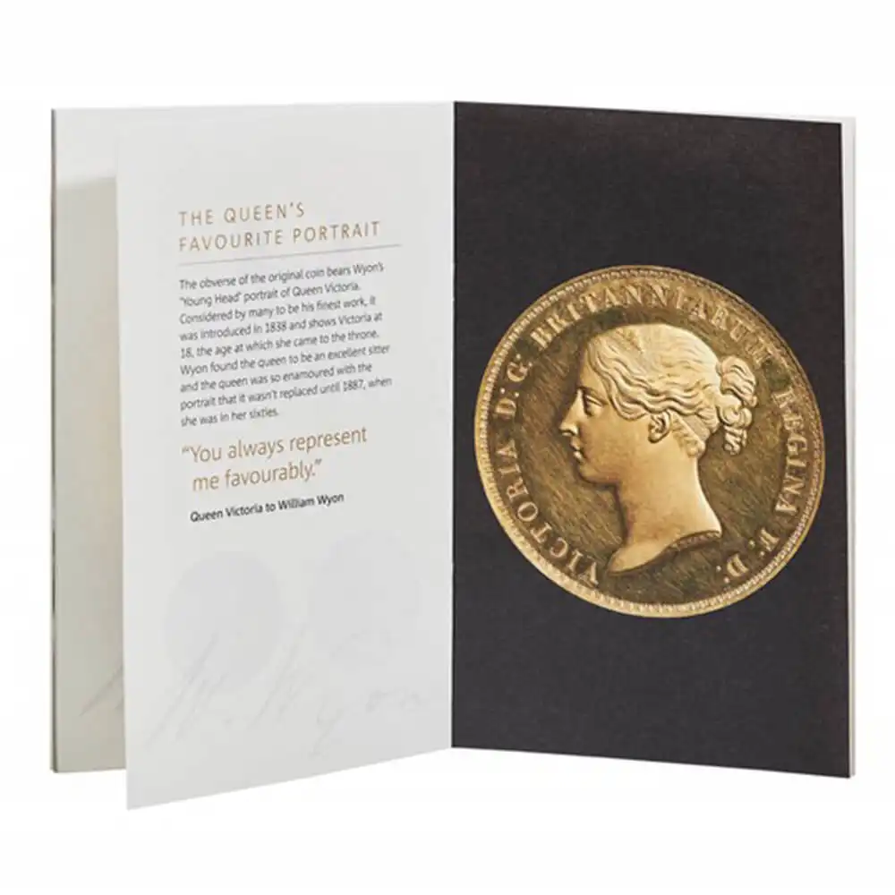 女王が即位した1837年から間もない1839年に発行され、その裏側にはエドマンド・スペンサーの叙事詩、「妖精の女王」の登場人物ウナをヴィクトリア女王と、