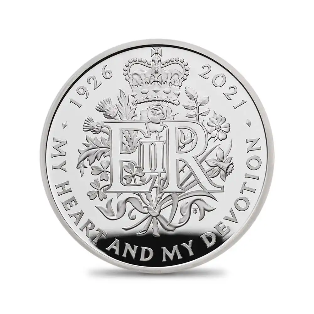 待望の英女王の生誕95周年を祝う当ピエフォー銀貨は、厚みを持つ銀貨ならではの重厚感がこの歓喜を倍増させます。裏面の碑文は「わが心と我が献身」を意味し、王冠と連合王国各国の国花と共に、いかにこの95周年が尊い貴重な瞬間であるかを万人に伝えています。
