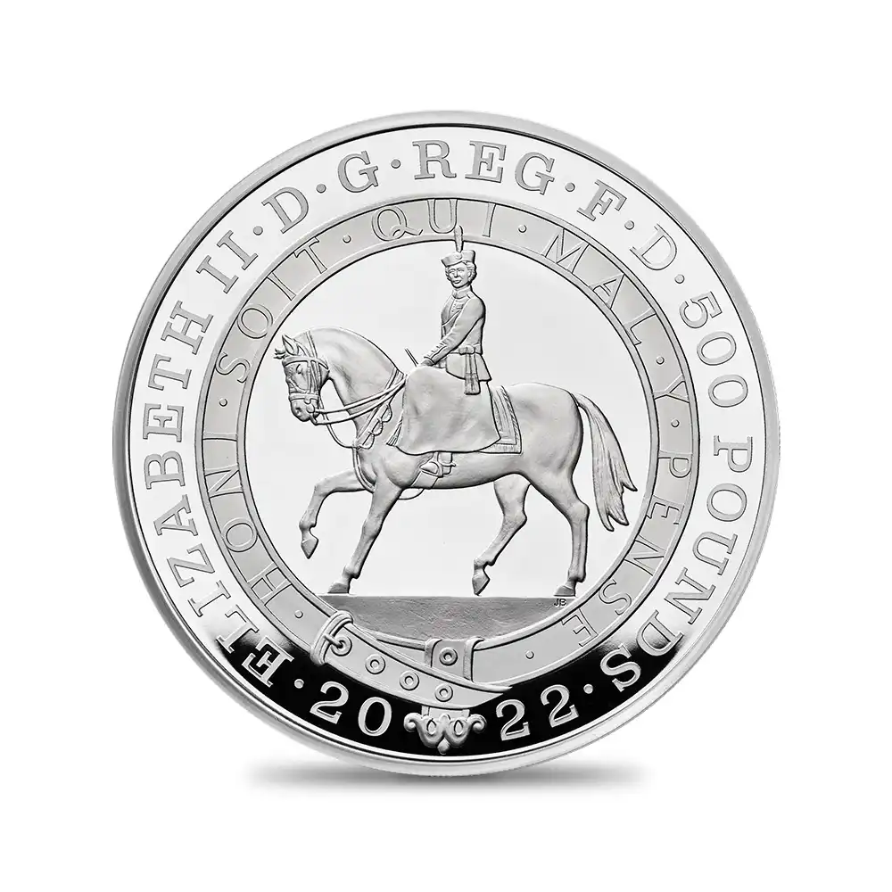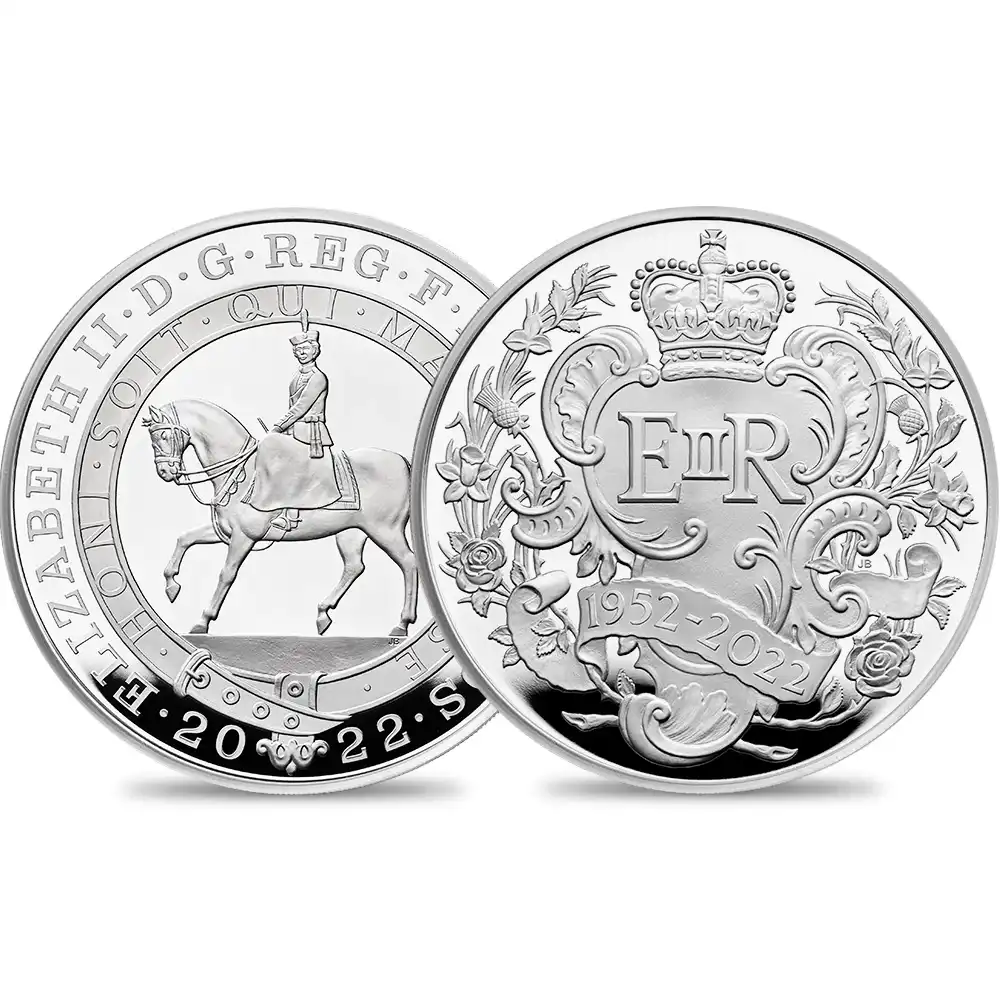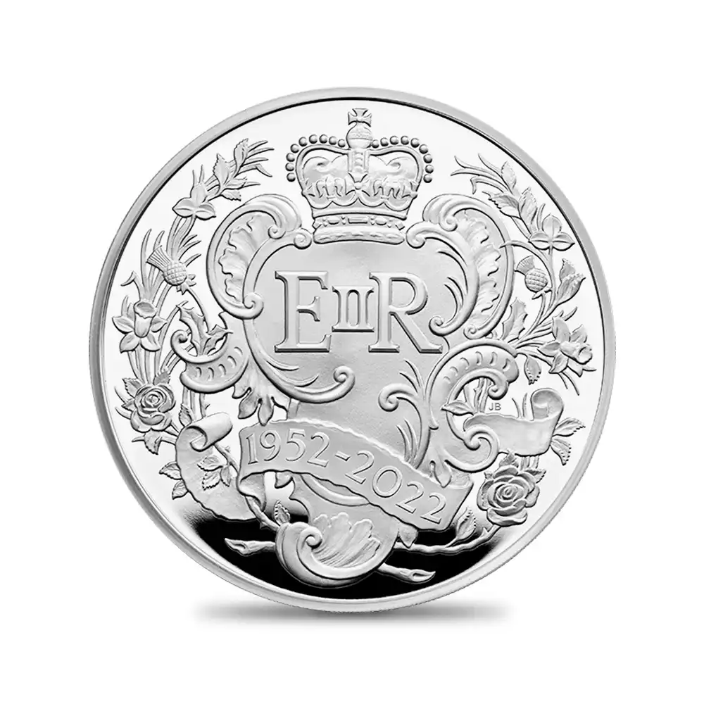 70年という前人未到の記録を樹立しつつある現英国女王エリザベス2世ですが、その非現実的とも思える事象をコイン上に現実的に体現することは至難の業です。しかしこの度の商品ラインアップのリストを見てみますと、この捉えどころの無い程に偉大なる功績が見事に視覚化されている点に驚かされます。中でも今回ご紹介させて頂く10ポンドから1000ポンドまでの限定版ゴールドとシルバーコインのデザインはプラチナジュビリーならではの特別仕様で、かつてリリースされたジュビリー関連のコインと比較しても遜色の無いものとなっています。この21世紀屈指の傑作の生みの親は、ロイヤルミントの経験豊かな実力派デザイナー、ジョン・バーグダールです。伝統に敬意を表しつつも現代的感覚が感じられる完成度の高い意匠が、この空前絶後のアニバーサリーを現代の事象として捉えていると感じさせるところに好感が持てます。このバージョンのコイン表面には、1953年の戴冠記念クラウン貨と2002年のゴールデンジュビリークラウン貨で用いられていたものと思しき馬上の女王の肖像へのオマージュが掲げられています。そして裏面ですが、先ず上部に至高の英国王位を象徴する大英帝国王冠が見られ、中央にはロイヤルサイファと称する女王の王名を簡略化した紋章、さらに下部には治世の始まりの年1952から本年2022年までの西暦がそれぞれバランスよく配置されています。そしてその周囲には多種多様な花々が咲き乱れ、この超然の瞬間を華麗に彩っています。英国王室の栄光の軌跡とロイヤルミントの1000年にわたる悠久の歴史を象徴するモダンコインの大作の満を持しての解禁となります。