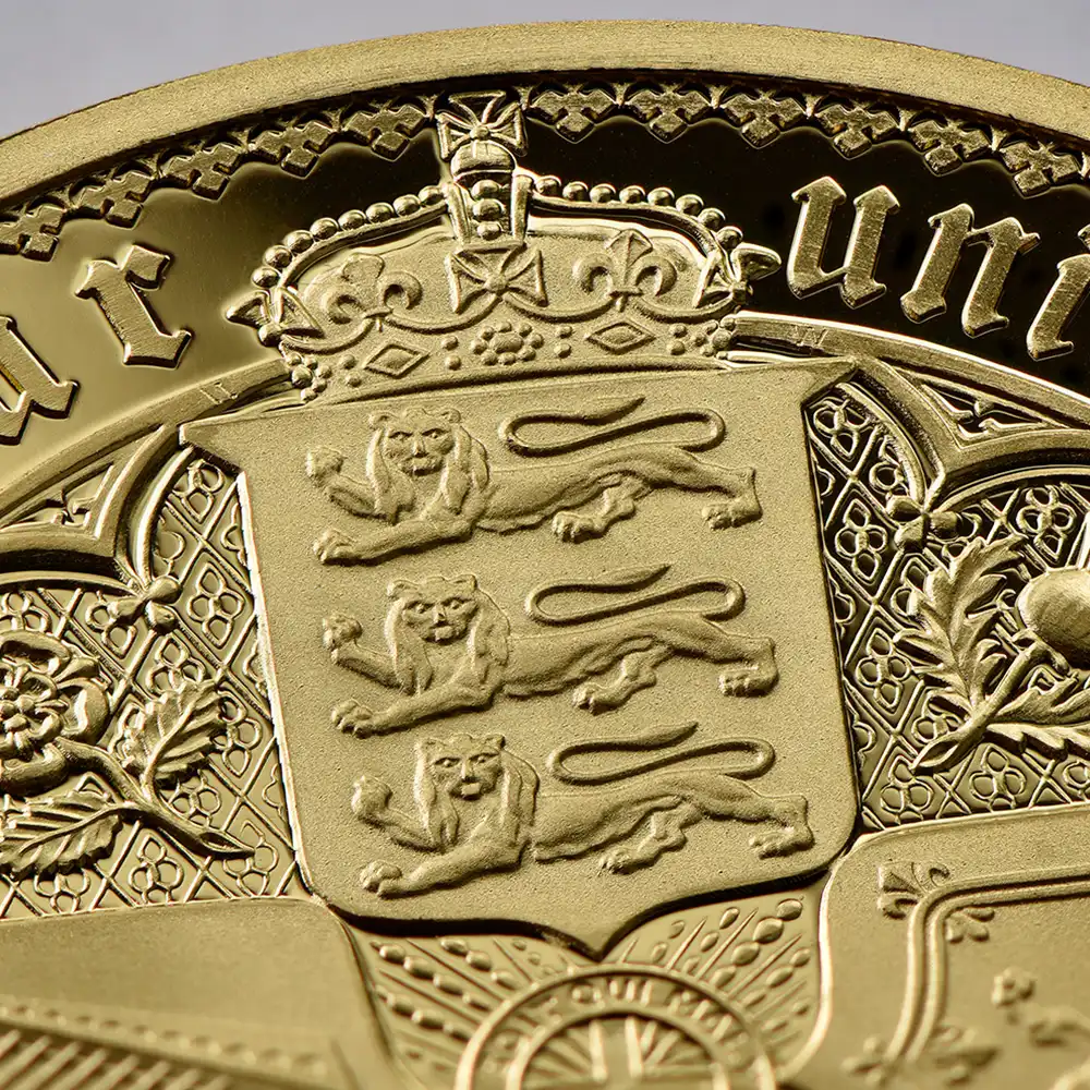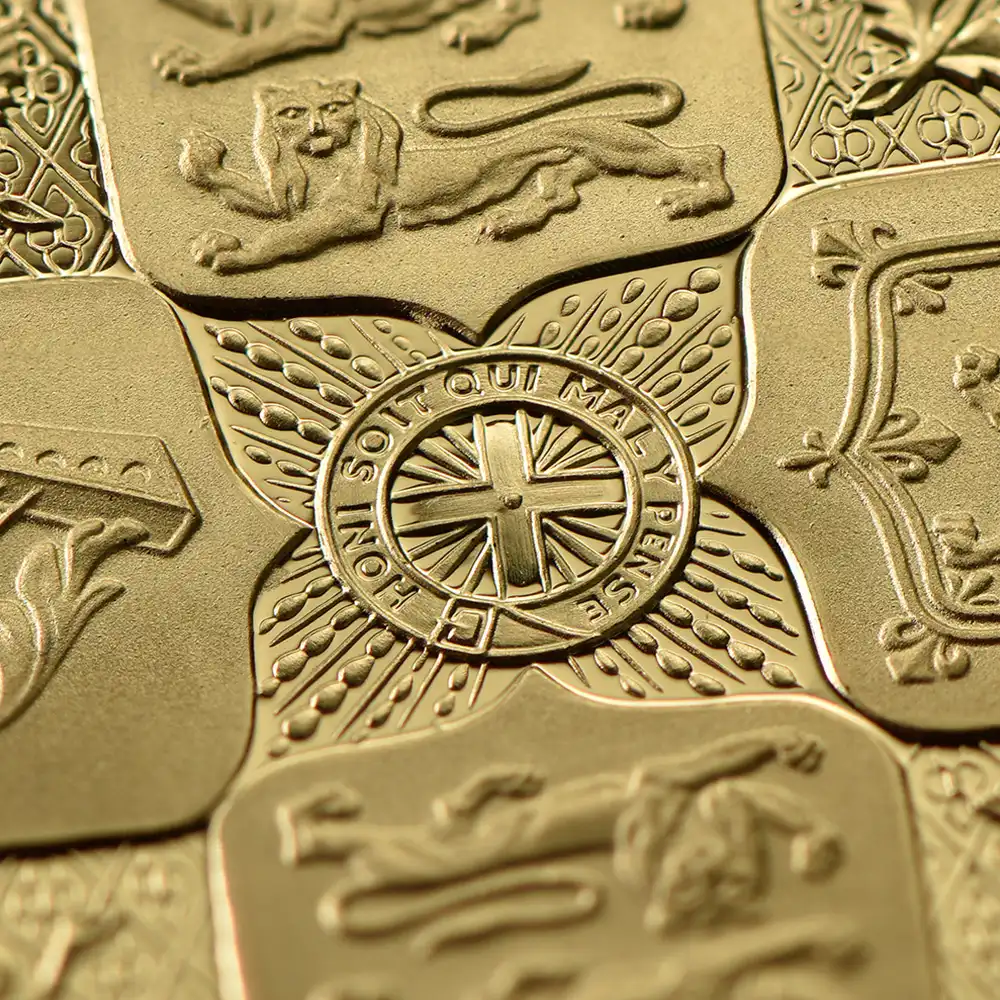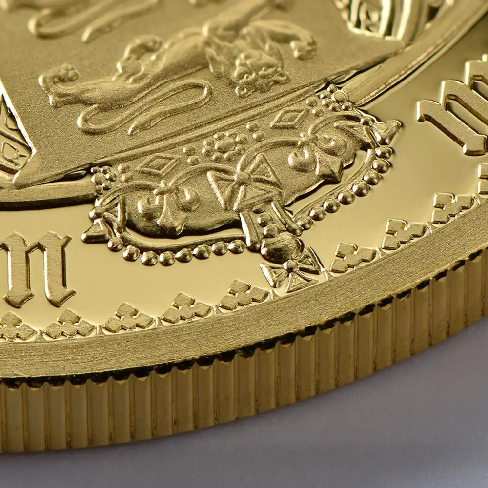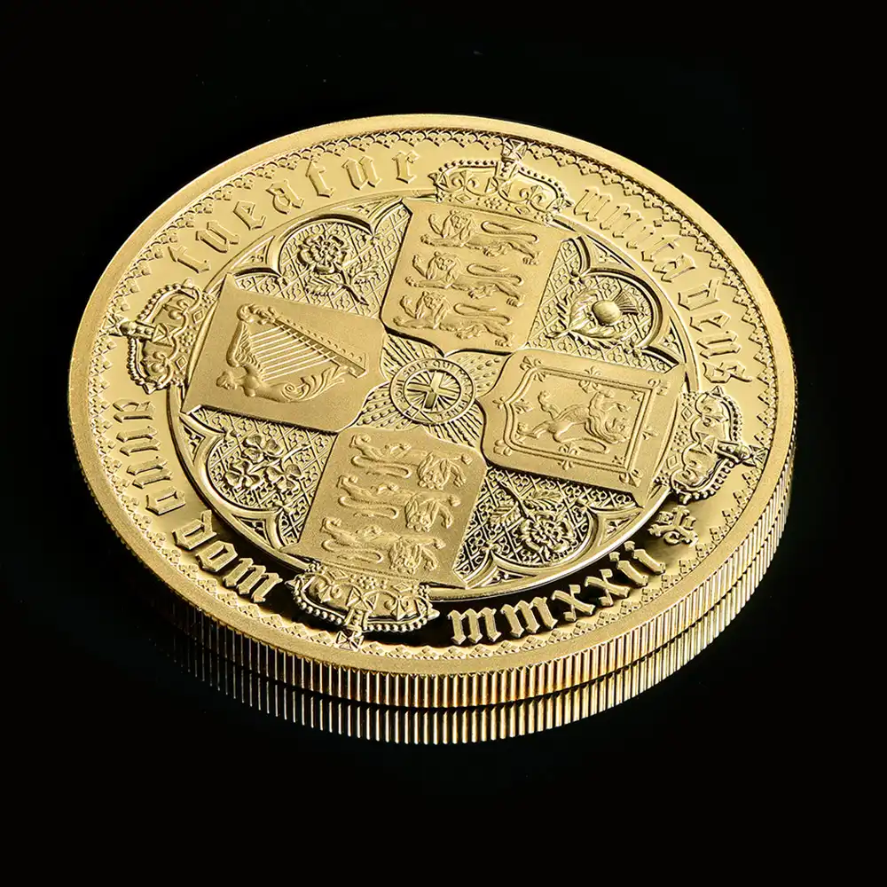 ワイオン芸術の頂点を示す「ゴチッククラウン」ですが、表面のヴィクトリア女王の肖像のみがコインの絶対的価値を高めているように思われることが多いのではないでしょうか。しかし、裏面の十字型の盾の紋章は表面のヴィクトリア女王のポートレートのスタイルとの統一感によって確固たる様式美を表出しており、このコインの付加価値となっている事実を無視することは出来ません。イングランド、スコットランド、アイルランド3国の恒久的な平和を祈念して制作されたこの紋章は、その後の大英帝国造営に向けてのイングランドの主導的立場を感じさせるものです。十字の中心には英国王室が授与する勲章の中で最高位に輝くガーター勲章の徽章が刻まれていることからも、この意匠がイングランドを中心とする連合の重要性を強調していることは明白です。今回ご紹介させて頂くモダンコインは、2022年に英領セントヘレナと東インド会社のコラボレーションによって製作された「ゴチッククラウン」裏面のデザインを踏襲する世紀のリマスター版です。リマスターされた裏面を見てみますと、リリース時のコインの西暦2022年がローマ式数字によって格調高く刻まれており、この新しいバージョン最大の特徴となっています。そして周囲の碑文はオリジナルと同じくブラックレターによって刻まれており、この十字型紋章にゴチック様式ならではの古風な趣をもたらしています。あらゆる角度からゴチック様式の美しさを表出することに成功している当コイン裏面の意匠ですが、既に不動の地位を得ている傑作コインの真に完璧な復刻のみが我々に深い感動を与えるということを例証しているようです。