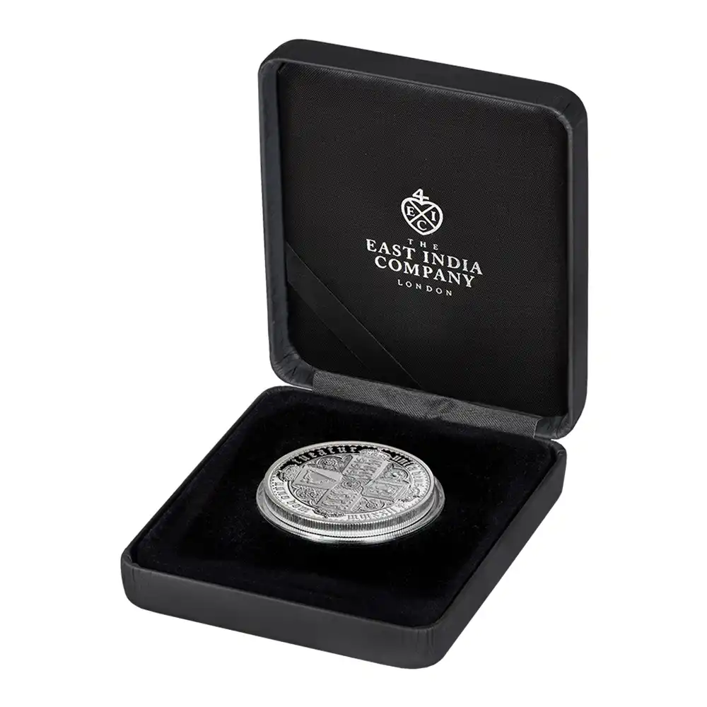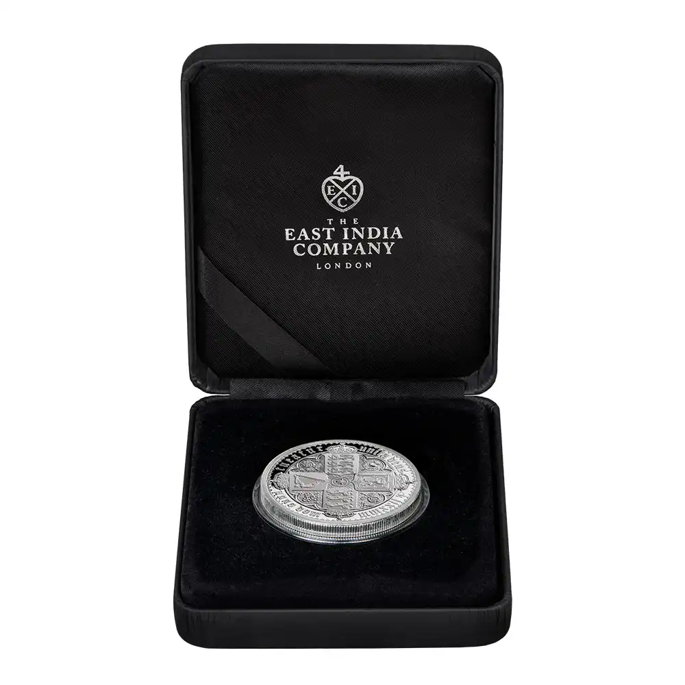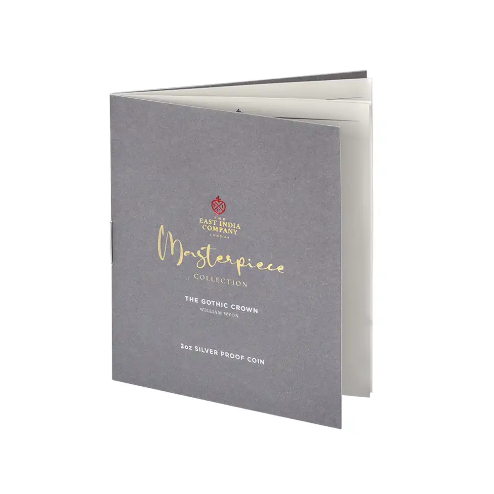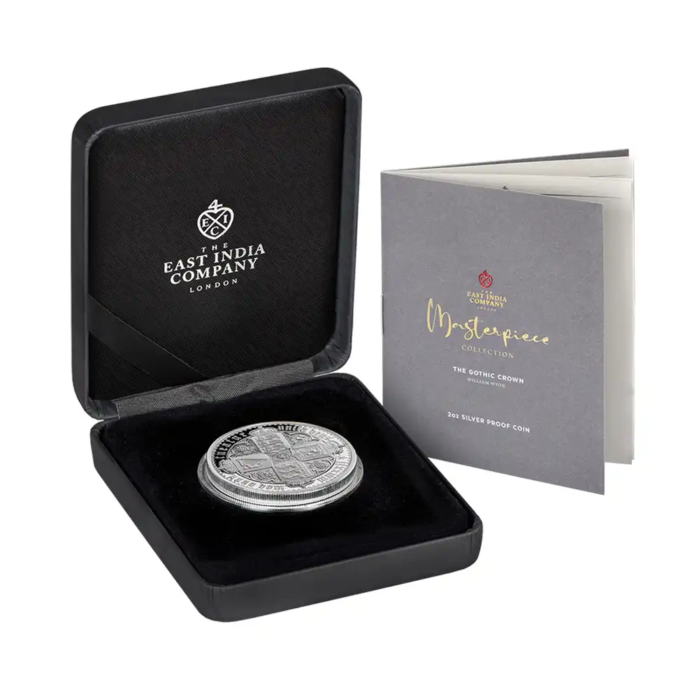ワイオン芸術の頂点を示す「ゴチッククラウン」ですが、表面のヴィクトリア女王の肖像のみがコインの絶対的価値を高めているように思われることが多いのではないでしょうか。しかし、裏面の十字型の盾の紋章は表面のヴィクトリア女王のポートレートのスタイルとの統一感によって確固たる様式美を表出しており、このコインの付加価値となっている事実を無視することは出来ません。イングランド、スコットランド、アイルランド3国の恒久的な平和を祈念して制作されたこの紋章は、その後の大英帝国造営に向けてのイングランドの主導的立場を感じさせるものです。十字の中心には英国王室が授与する勲章の中で最高位に輝くガーター勲章の徽章が刻まれていることからも、この意匠がイングランドを中心とする連合の重要性を強調していることは明白です。今回ご紹介させて頂くモダンコインは、2022年に英領セントヘレナと東インド会社のコラボレーションによって製作された「ゴチッククラウン」裏面のデザインを踏襲する世紀のリマスター版です。リマスターされた裏面を見てみますと、リリース時のコインの西暦2022年がローマ式数字によって格調高く刻まれており、この新しいバージョン最大の特徴となっています。そして周囲の碑文はオリジナルと同じくブラックレターによって刻まれており、この十字型紋章にゴチック様式ならではの古風な趣をもたらしています。あらゆる角度からゴチック様式の美しさを表出することに成功している当コイン裏面の意匠ですが、既に不動の地位を得ている傑作コインの真に完璧な復刻のみが我々に深い感動を与えるということを例証しているようです。