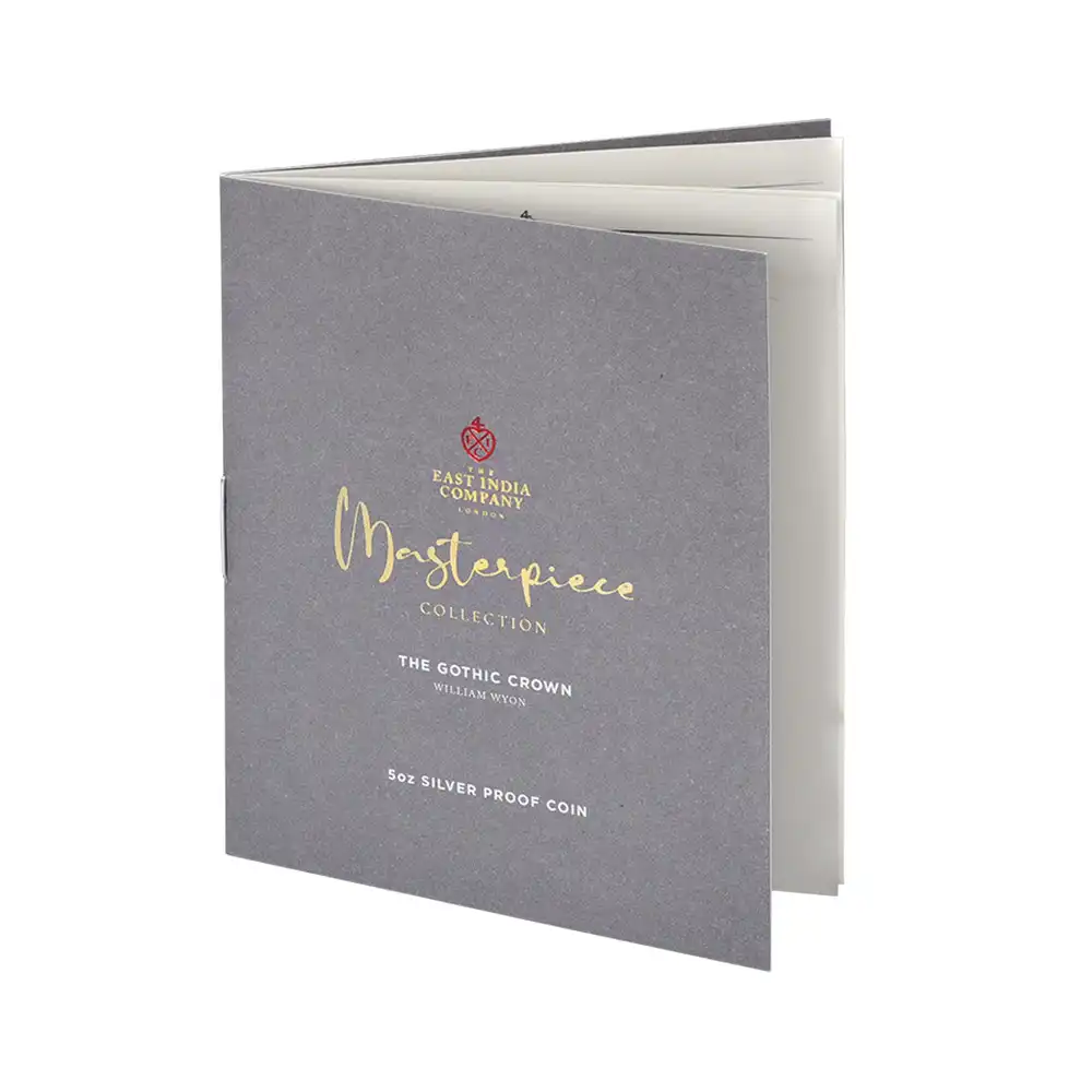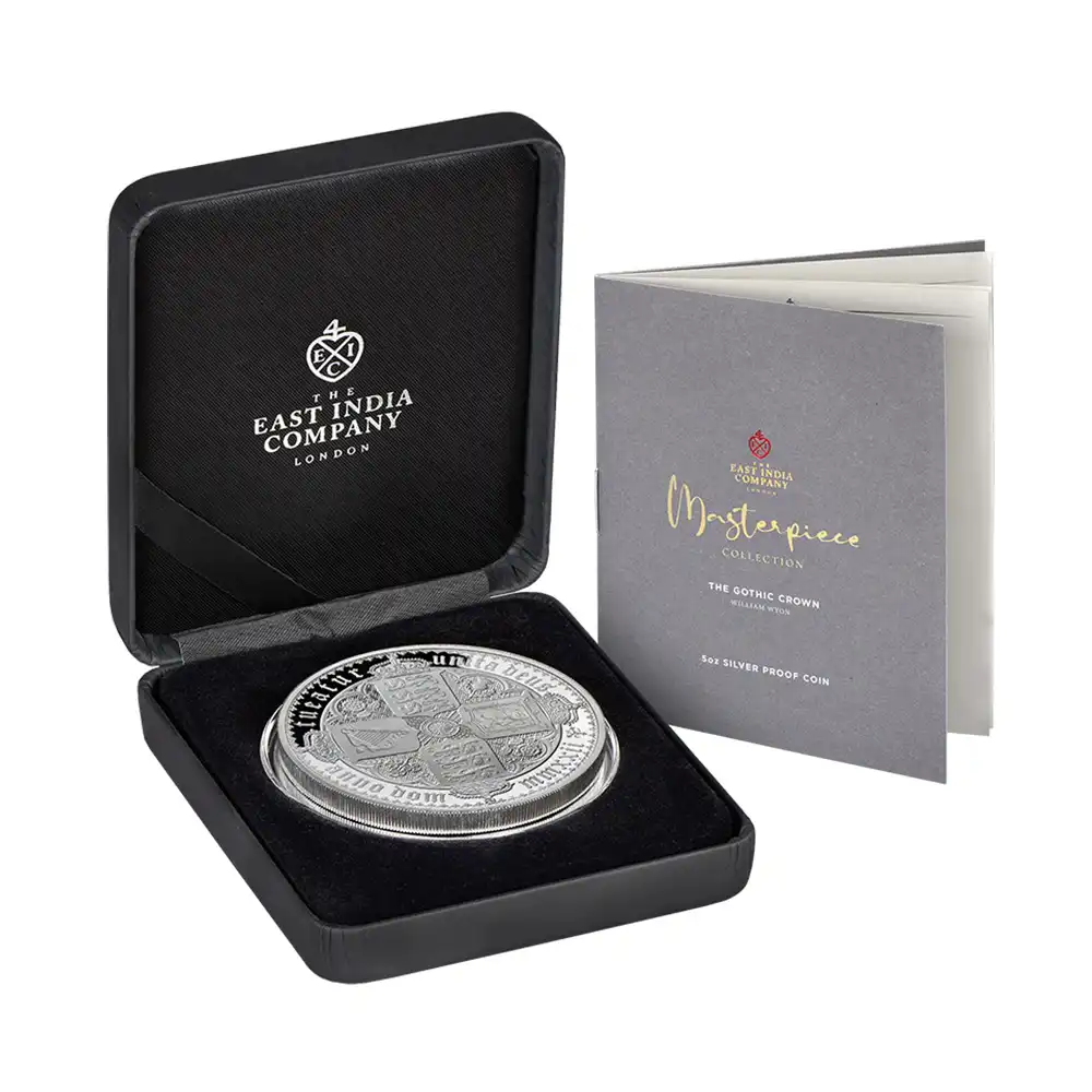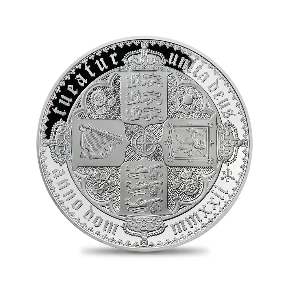 ワイオン芸術の頂点を示す「ゴチッククラウン」ですが、表面のヴィクトリア女王の肖像のみがコインの絶対的価値を高めているように思われることが多いのではないでしょうか。しかし、裏面の十字型の盾の紋章は表面のヴィクトリア女王のポートレートのスタイルとの統一感によって確固たる様式美を表出しており、このコインの付加価値となっている事実を無視することは出来ません。イングランド、スコットランド、アイルランド3国の恒久的な平和を祈念して制作されたこの紋章は、その後の大英帝国造営に向けてのイングランドの主導的立場を感じさせるものです。十字の中心には英国王室が授与する勲章の中で最高位に輝くガーター勲章の徽章が刻まれていることからも、この意匠がイングランドを中心とする連合の重要性を強調していることは明白です。今回ご紹介させて頂くモダンコインは、2022年に英領セントヘレナと東インド会社のコラボレーションによって製作された「ゴチッククラウン」裏面のデザインを踏襲する世紀のリマスター版です。リマスターされた裏面を見てみますと、リリース時のコインの西暦2022年がローマ式数字によって格調高く刻まれており、この新しいバージョン最大の特徴となっています。そして周囲の碑文はオリジナルと同じくブラックレターによって刻まれており、この十字型紋章にゴチック様式ならではの古風な趣をもたらしています。あらゆる角度からゴチック様式の美しさを表出することに成功している当コイン裏面の意匠ですが、既に不動の地位を得ている傑作コインの真に完璧な復刻のみが我々に深い感動を与えるということを例証しているようです。