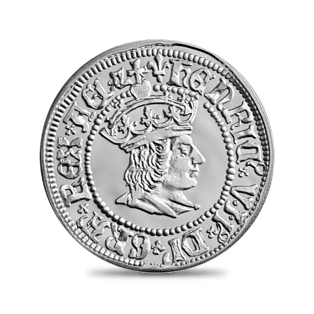 2022年に英国ロイヤルミントによってリリースされる「英国君主コレクション」と銘打たれた新しいコインシリーズは、歴代英国国王とその栄光の在位にスポットを当てる夢の企画です。過去にロイヤルミントが成功させた数々のコインシリースは年1回のリリースが大半でしたが、当シリーズは今後5年間にわたり年4,5回の発行が計画されており、2026年に誕生100周年を迎えられる現英国女王エリザベス2世のコインの発行によって華々しく完結する見込みです。15世紀に開かれたテューダー朝から始まり、ステュアート朝、ハノーヴァー朝、サックス・コバーグ・ゴータ朝、そして現在のウィンザー朝へと連なる英国王室の悠久の歴史を雄弁に物語る当コインシリーズは、ソブリン貨を中心とするそれぞれの君主の治世を代表する名貨のデザインを採用し、21世紀に蘇らせます。コレクターを始めとするコイン関係者を唸らせるに十分なこの壮大なるプロジェクトは、背景となる英国史に対する社会的興味を増幅させ、個々の王朝に対する理解を深めるという大義を果たすべく誕生しました。この待望のコレクションの第1弾として、テューダー朝の始祖ヘンリー7世のデザインの採用が決定しましたが、同国王の治世を代表する精緻を極めたコイン・ポートレートが今、500有余年の歳月を経て我々の時代に再現されることは誠に喜ばしいことです。ウェールズ王家の血統を受け継ぐヘンリー7世の波乱に満ちた治世は、英国におけるルネッサンス期の幕開けを象徴する画期的な時代として記憶されています。絶対的王権の保持者を自認していたヘンリー7世は、決して近世以降の立憲君主のような象徴のみの存在ではありませんでした。馬に跨って戦塵の巷で陣頭指揮を取り、国家に確実な勝利をもたらす手腕を発揮する真の勇者としての資質が浮かび上がってきます。また宿敵ヨーク家の王女エリザベスとの婚姻によって15世紀初頭のイングランドを翻弄した薔薇戦争を終結され、その後の英国の対外的権威の確立を実現し、王権の強化を体現したヘンリー7世の驚異的な存在感は、王の長子であるヘンリー8世によって受け継がれテューダー朝の最盛期を構築します。現代最先端のコイン製造技術によって蘇るのは、ヘンリー7世の治世下に発行されたグロート貨(4ペンスに相当)表面のポートレートで、このテューダー朝の創設者の生前の有り余る権威を表出するのみならず、15世紀のハンマー打ちコインならではの不完全な魅力と独特の古色を忠実に再現しています。