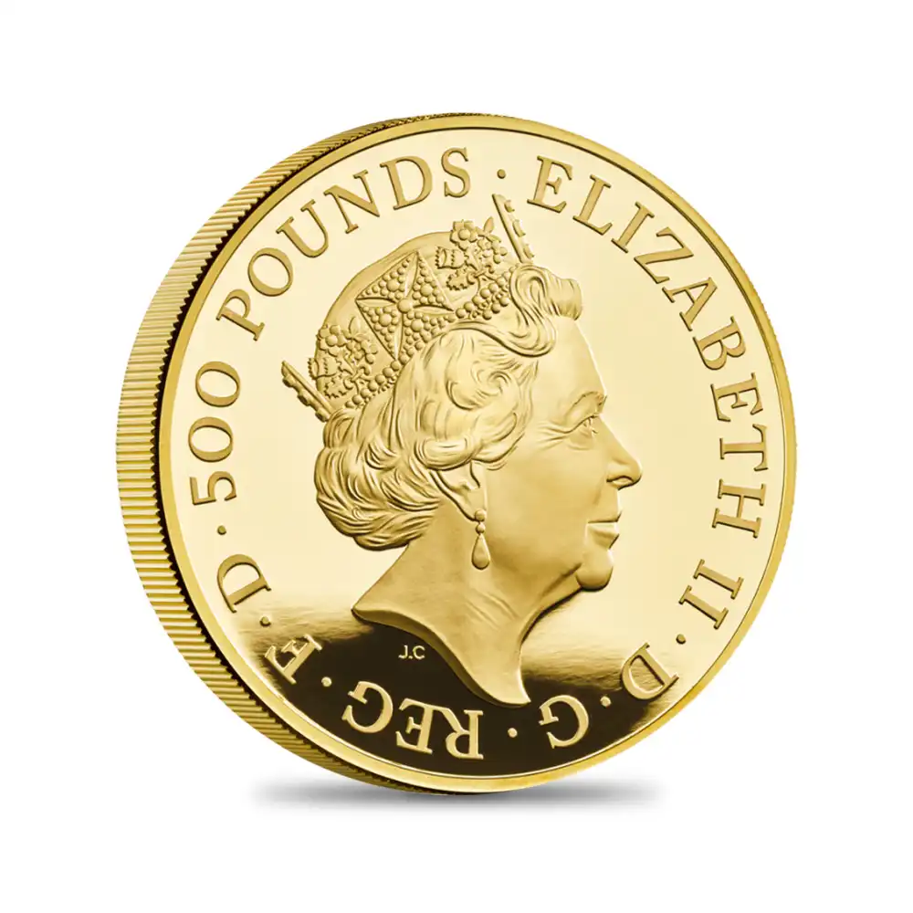 常に英国王室と共に存続し、歴代王朝を守護してきた「イングランドのライオン」ほどに、長大なる英国史において重要な役割を果たしたシンボルは他に存在しません。ヘンリー8世による採用以降、歴代王朝の君主に捧げられたその堂々たる表象は、現在のウィンザー朝の当主エリザベス2世へと受け継がれ、女王の君主としての尊厳を余すところなく表出することに一役買っています。当コイン表面に掲げられたエリザベス2世の「第5肖像」は、ロイヤルミントの若き才人ジョディー・クラークが才能の限りを尽くして生み出したコイン肖像の最高傑作として知られています。女王の頭上に輝くのは、世紀の至宝「ジョージ4世のステート・ダイヤモンド・ダイアデム」です。1821年に行われたジョージ4世の戴冠式に間に合うようにロンドンの宝石商が制作したこの秘伝の宝飾品は、その後ウィリアム4世の王妃アデレードが相続して以来君主としての女王、もしくは歴代英国王妃、と女性の高位王族のみによって受け継がれて来た例外的な名品でもあります。現在の所有者であるエリザベス2世がことのほか愛し、過去に発行された公式コインポートレートにおいても2度にわたって描かれたことによって、その歴史的価値を強く印象付けました。本年2022年2月6日に在位70周年を迎えられたばかりの女王陛下ですが、その超然の在位に彩を与える「イングランドのライオン」の表象を盾として、今後も偉大なる治世を継続されることを願わんばかりです。ヘンリー8世の治世から現在の女王陛下の治世に至るまでの500年以上にわたる王位の継承に、英国の国家としての本質を垣間見る思いがします。そして待望の裏面のデザインですが、百獣の王ライオンの獰猛かつ勇壮な肢体を感動的に浮かび上がらせており、背筋の伸びる思いがするほどです。ライオンが胸に掲げるシールドにはハンプトンコート宮殿の主であったヘンリー8世と王の寵愛を一身に集めた王妃ジェーン・シーモアの紋章を複合したテューダー朝独自の紋章が刻まれています。テューダー朝の栄華を物語る壮麗豪華なハンプトンコート宮殿のモートブリッジ上で一際光彩を放つ「イングランドのライオン」の彫像ですが、一国を統治する運命を担う君主の孤高の存在感を他のどの動物よりも濃厚に漂わせてずっと立ち尽くし、そこを訪れるものに強烈な印象を与えています。それはあたかも英国国家に捧げられた女王陛下の前人未到の治世70年の高徳を象徴しているかの如くです。当コインは英国の永遠の君主制に捧げられるために創造された、限りなく愛国的なモダンコインの極致です。