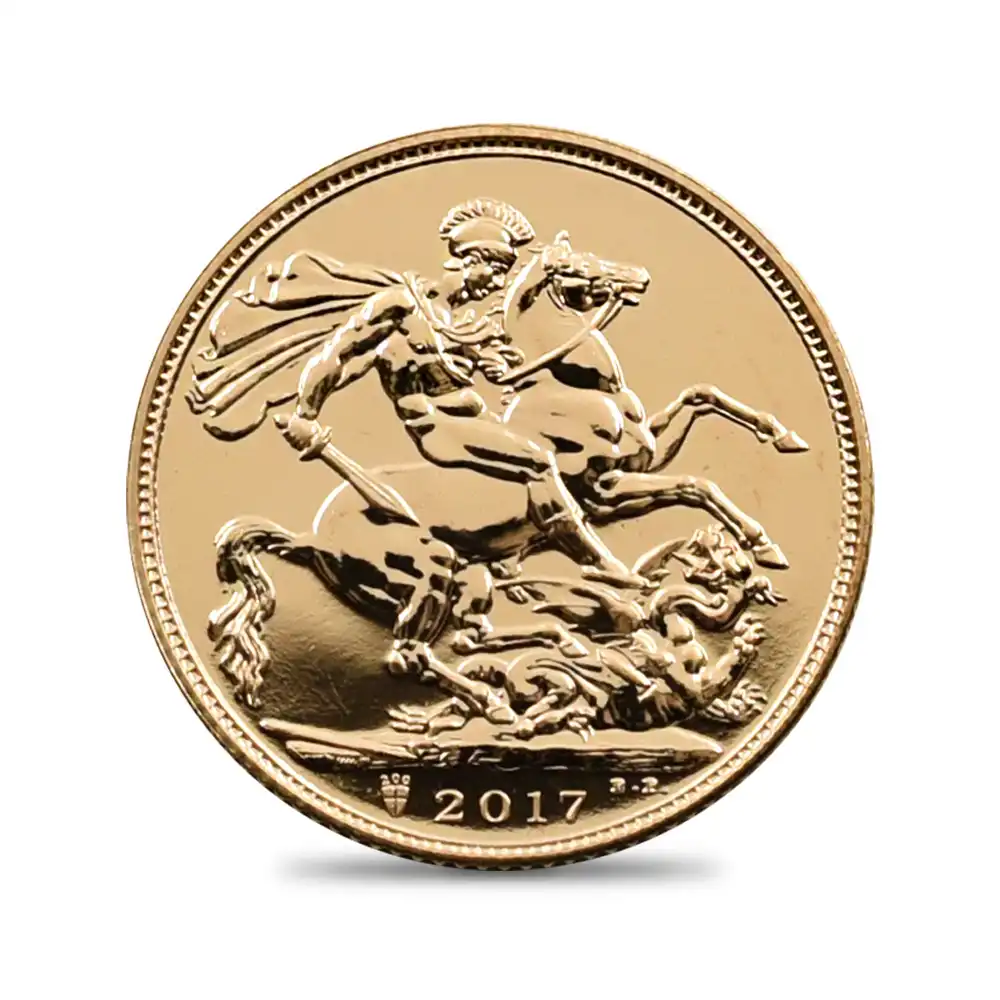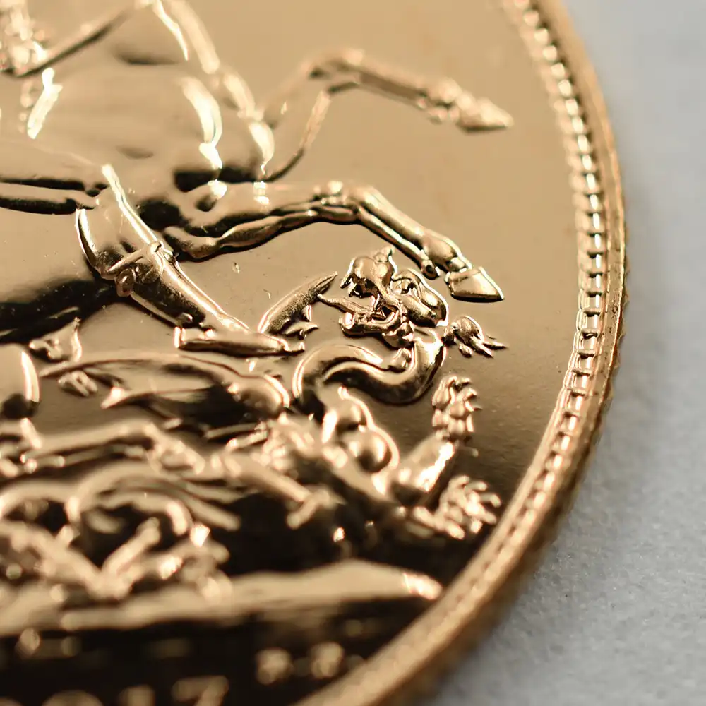 1816年に制定された新貨幣法の下に、翌年に日の目を見た新しいソブリン金貨の時代が始まってから2017年で200周年を迎えます。当地金型金貨は、この記念すべき200周年を祝して英国ロイヤルミントが世に贈る英国貨幣の古典に対する究極のオマージュです。コイン裏面のデザインは、1817年のオリジナル・ソブリン金貨の裏面に描かれていた「聖ジョージの竜退治」の名場面です。1815年のナポレオン戦争の終結後にイングランドにわたり、ロイヤルミントにて職を得て英国を終生の地と定めた天才イタリア人制作家ベネデット・ピストゥルッチ(1783年-1855年)の生涯最大の傑作です。ローマ帝国時代に実在したと伝えられる聖ジョージことゲオルギウスですが、悪の象徴であるドラゴンを退治するその勇壮なシーンは古来数多くの芸術家の創造意欲を刺激し、造形芸術の各ジャンルにおいて人気を獲得し続けて来ました。また悪に対峙する善の象徴としての聖ジョージの姿は、国家を代表する王室の権威をシンボライズする表象として重用され、現在に至ります。特に馬上の聖ジョージの英雄的な姿は英国君主の理想像であり、なぜこのデザインが初登場以降、歴代英国君主の肖像を刻むコインの表面に対し、その裏面を飾るに相応しいものであったかを如実に物語っています。