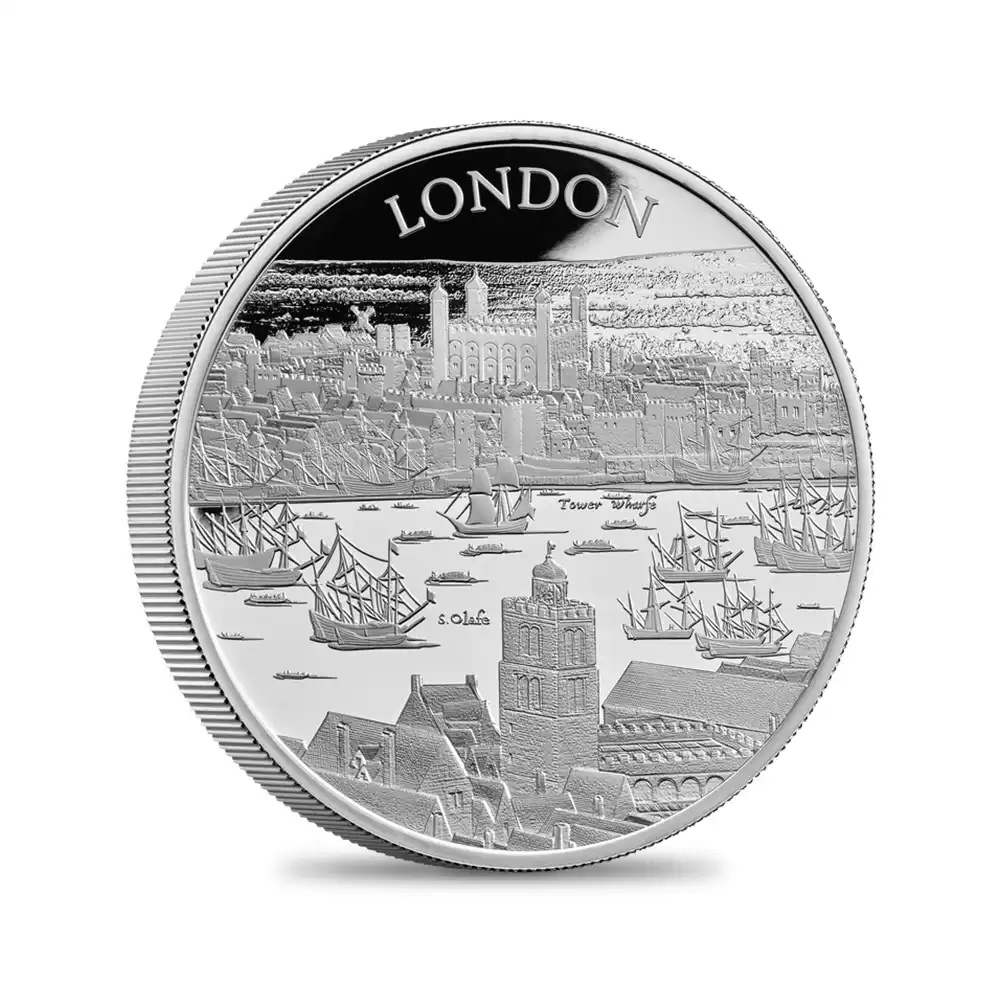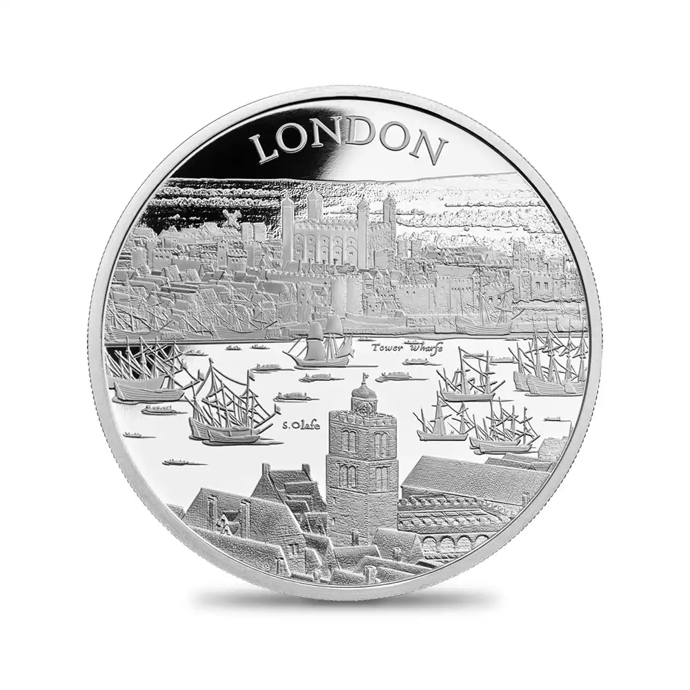 同コレクションの第1弾を飾るこのコイン裏面には、17世紀初頭のロンドンの世にも美しい景観が描かれています。テムズ川沿いに広がる見事な景色の魅力を伝えるこのデザインは、ステュアート朝の創設者ジェームズ1世の治世下のロンドンで頭角を現したボヘミア出身の芸術家、ウェンセスラウ・ホラーの風景画をオリジナルとしてコイン上に写し描いたものです。テムズ川の向こう岸には歴史的なロンドン塔の建築群が見えますが、中世期以降常にイングランド史の変遷を見続けて来たこの建物以上に同コレクションの第1弾に相応しい題材は無いことと思われます。都市を防御する要塞として誕生したロンドン塔ですが、その後、身分の高い政治犯の収監先として機能したため、その血なまぐさい記憶はイングランド史の負の遺産として現在に至るまで語り継がれています。1970年代以降ウェールズに居を構える英国ロイヤルミントですが、9世紀のアルフレッド大王の治世下に王自身によって設立されたとされる同ミントの発祥地としても知られるロンドン塔は、過去1000年以上にわたる英国貨幣鋳造の変遷を見届けて来ました。歴代王朝を代表するコインの殆どすべてがその敷地内で制作されたとされるロンドン塔は、英国アンティーク・コインの故郷であると言えます。現在もロンドンのランドマークとして全世界の注目を集めるロンドン塔を描く当コインは、未来の若い世代に受け継がれる真の文化遺産としての価値を持つものであり、英国の過去をその外観によってシンボライズしています。そしてコインの中央を流れるテムズ川の情景は永遠の首都ロンドンの悠久の歴史を物語っており、水運の歴史とともに発展を遂げた川と都市との繋がりを視覚化する優美なデザインは、コレクション価値を有する新コインシリーズの幕開けに相応しい独自性を窺わせるものです。さらにコイン表面には英国を代表する人物であるエリザベス2世の肖像が描かれていますが、ロンドンに生まれ、ロンドンと共に生きた女王のこの街に対する限りない愛情を感じさせる秀逸なポートレートが裏面の美しい景観との見事な調和を醸し出しています。当コインは、英国とその長大なる歴史をこよなく愛する真の英国コインファンに贈られるべき永遠の文化遺産に他なりません。