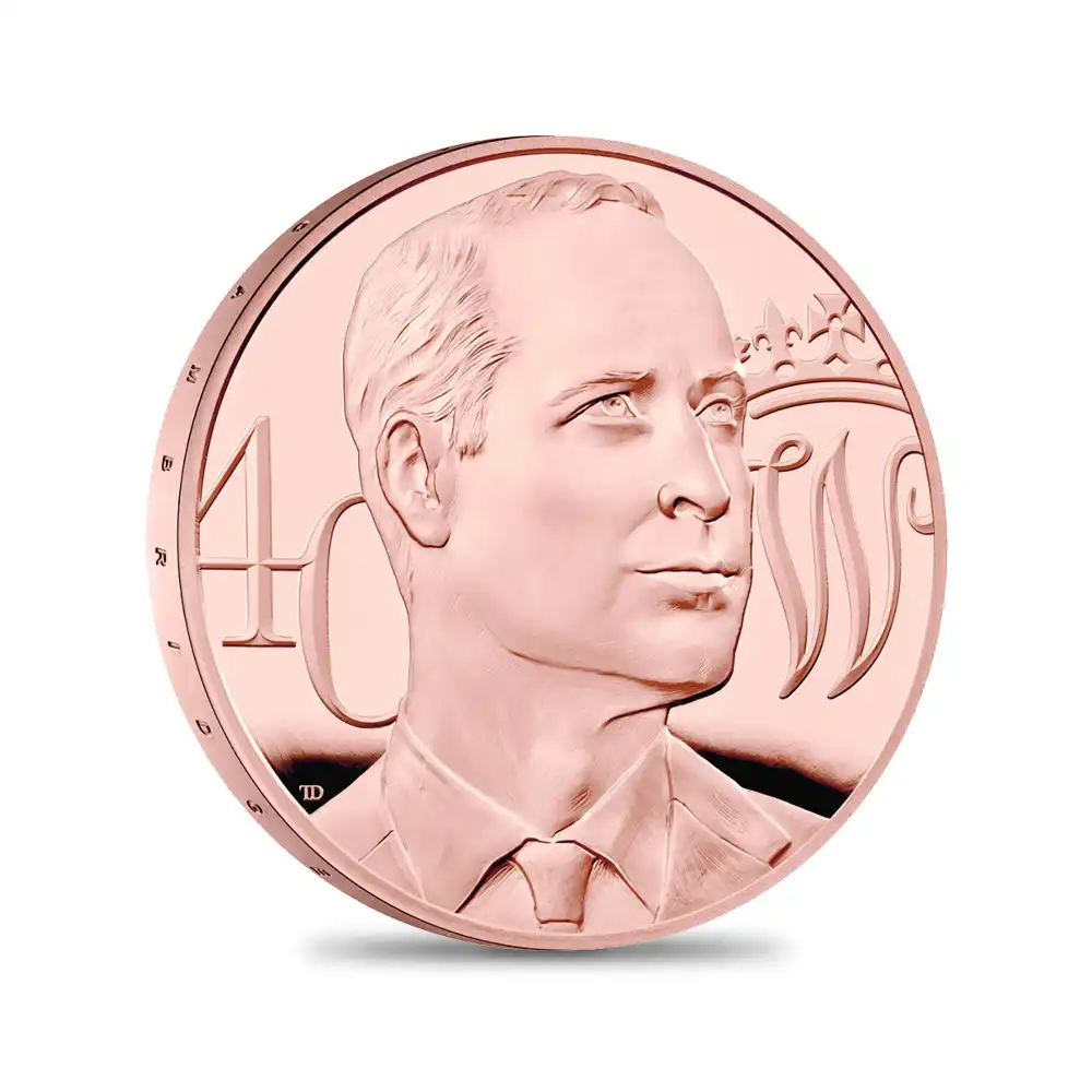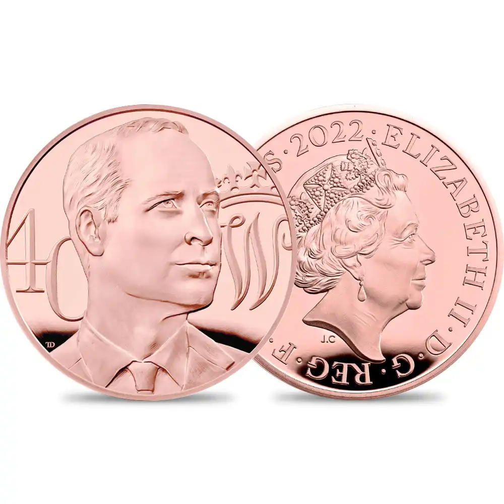ケンブリッジ公爵こと現在のウィリアム王子の多忙な公務活動を影で支えているのは夫人のキャサリン妃に他なりません。資産家の令嬢ではあったものの、王室とは何ら関係のない一般家庭に生まれ育ったキャサリン妃と、生まれながらの王族であるウィリアム王子の結婚は英国民から期待され、温かく迎え入れられました。現在のキャサリン妃は、エリザベス女王に次いで最も人気の高い女性王族としての地位を確立しつつあるほどです。家庭生活を生活の基盤とする王族として知られているウィリアム王子ですが、ジョージ王子、シャーロット王女、そしてルイ王子の父親として家庭生活と公務を見事に両立されている様子は過去にもニュースで度々取り挙げられてきました。「次代の英国君主にはチャールズ皇太子をスキップして直接ウィリアム王子を」と言われ、国民からの敬愛を一身に受ける人気の高いウィリアム王子ですが、本年2022年には満40歳の誕生日を迎えられます。父のチャールズ王太子に次いで王位継承権第2位の保持者ということで英国の期待を背負うウィリアム王子ですが、今回ご紹介させていただく記念コインは、英国ロイヤルミントが王室の未来を担う王子の40回目の誕生日に際して贈る真心のこもったプレゼントであると言えます。またこの記念コインは王子の誕生を祝うのみならず、過去に王子が遂行されてきた数々の公務の重要性を強調するものでもあります。その中でも取り分け重要な公務として、父チャールズ王太子の影響を受けて推進してきた環境問題や、精神病患者が引き起こす数々の社会問題に関する取り組みなどが挙げられます。コイン表面に描かれているのは、孫である王子を心から愛する祖母エリザベス2世の有名な「第5肖像」です。これまでにも王子は、王族としての大先輩でもある女王から如何にして王族としての務めを果たし社会に貢献するかを学んでこられました。そしてコイン裏面には40周年を迎えられた後も依然として若々しいウィリアム王子の颯爽たるポートレートが刻まれています。王子の肖像の左には40歳を意味する数字の40が刻まれ、右には王子の名ウィリアムのイニシャルであるWが印象深く刻まれています。未来の英国君主の誕生40周年の記念としては余りにもシンプル過ぎるのではないかという声が聞こえて来そうなこのポートレートですが、良き夫にして家庭人である王子の飾り気のない存在感を見事に表現している点が今後最高度の評価を生むことでしょう。英国における永遠の君主制の象徴と解釈することもできるこのコインですが、子々孫々と受け継がれて行く英国王位の尊厳を余すところなく伝えるモダンコインの秀作としての地位を確立することでしょう。