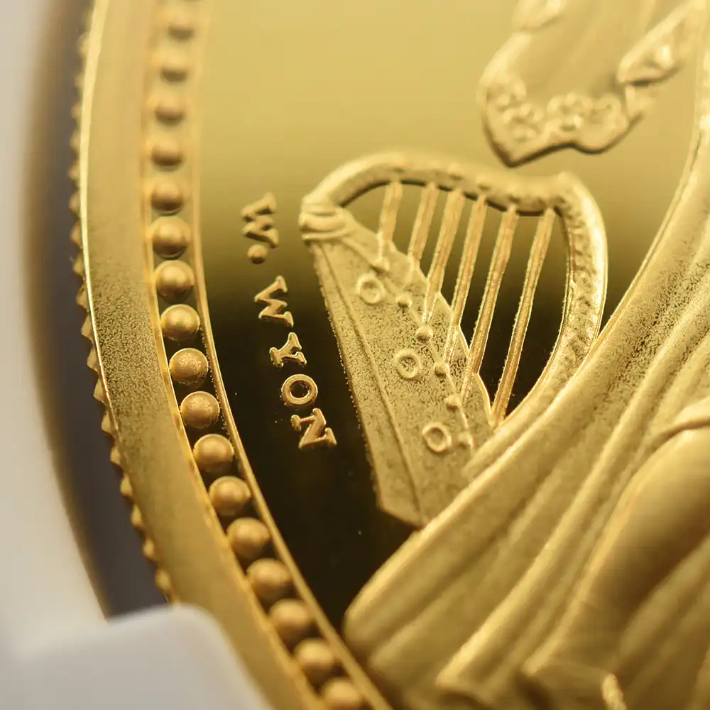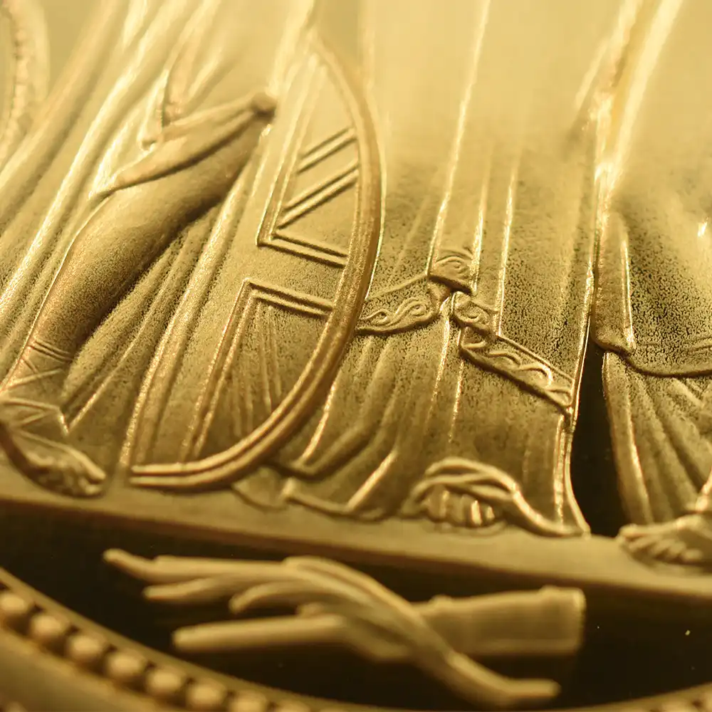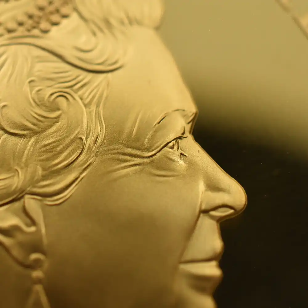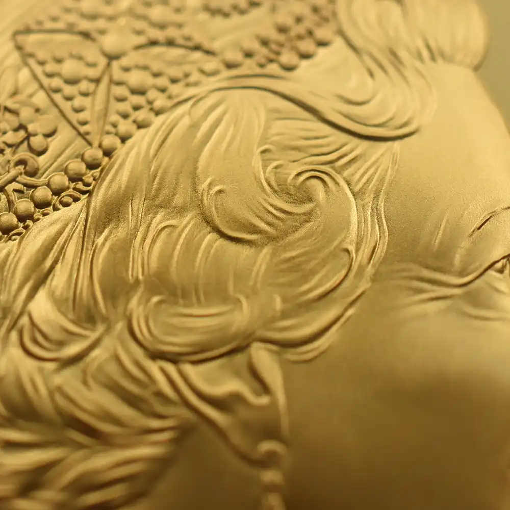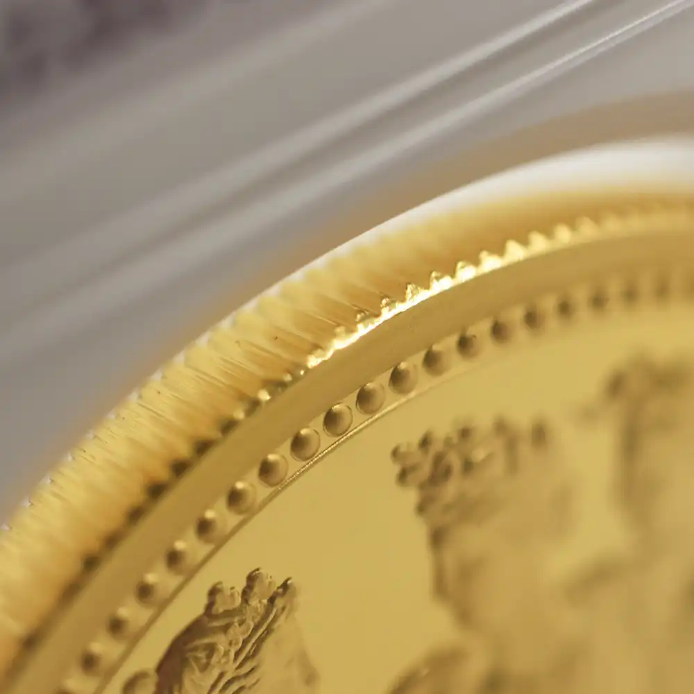 ウィリアム・ワイオンの代表作として名高い「スリーグレーセス」のデザインですが、2020年のロイヤルミントによるリマスター版の発行によってコインデザインの永遠の主題となりました。当金貨表面に刻まれているのはロイヤルミントの主力デザイナー、ジョディ―・クラークによるエリザベス二世の「第5肖像」です。緩やかに流れるような曲線を描く女王の白髪と深く刻まれた皺は、頭上のダイアモンド・ダイアデムの輝かしさを感動的に引き立てています。裏面の三美神はギリシャ神話の最高神ゼウスの娘達で、それぞれ若さ、歓喜、そして気品を象徴すると伝えられています。壮大なるギリシャ神話の世界を新古典様式の意匠によって再現する「スリーグレーセス」は、この度のリマスターによって21世紀の古典として受け継がれて行く永遠の生命を得ました。