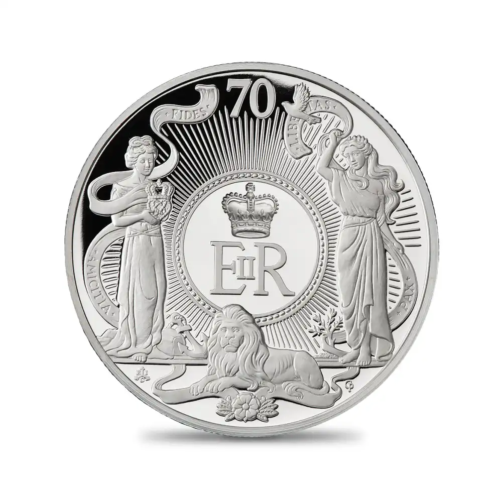 過去にも数えきれないほどの魅力的な記念コインの発行によってコレクターを始め、世界中の熱烈なるコイン愛好家の注目を集めてきたセントヘレナ島。この度もまた歴史的に名高い東インド会社とのコラボレーションによって秀麗な美しさを誇る一枚のアニバーサリーコインがリリースされることになりました。エリザべス2世の超然のプラチナジュビリーを記念する当コインの発行は、女王が国家に捧げて来られた70年間に及ぶ献身と、戦後の英国が体現した奇跡的復興の真価を、古典的かつ斬新なデザインによって具象化する壮大なるプロジェクトです。表面には英領諸国においてリリースされるコインの象徴とも言えるエリザベス女王の「第5肖像」の胸像版が刻まれています。頭上に「ジョージ4世のステート・ダイアモンド・ダイアデム」を戴く女王の威厳のある風貌は、胸元を飾る「ヴィクトリア女王のコロネーションネックレスとイヤリング」を伴ってこの肖像画の真骨頂を発揮しています。そしてコイン裏面には、この度のプラチナジュビリーの特別版としてコイン・デザイナー、キアーラ・プリンチペの創造による豪華絢爛たる意匠が披露されています。裏面中央にはエリザベス2世のシンボルでもある「ロイヤルサイファ」が王冠と共に刻まれ、英国王室の尊厳を十全にアピールしています。そしてその下には力と勇気の象徴でもある百獣の王ライオンが鎮座し、その左奥には海洋覇権国家としてかつて隆盛を誇った大英帝国の末裔であるイギリス連合王国を象徴する錨が見られます。左手には忠誠心と友愛を擬人化した女性像、さらに右手には平和と自由をシンボライズする女性像が神々しく描かれています。背後から立ち上がる無限を感じさせる太陽光とリボンの襞の絶妙な装飾性がデザイン全体にえも言われぬ崇高感を与え、観る者の心に安らぎを与えます。この優れたデザインを創造したプリンチペ氏に最大級の讃辞を贈ると共に、英国王室の未来永劫の繁栄を祈念するこの秀逸なコインの今後の高評価を確信するばかりです。