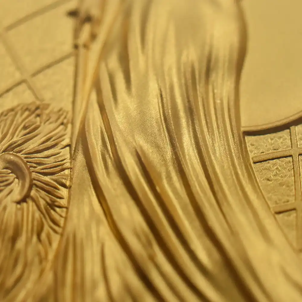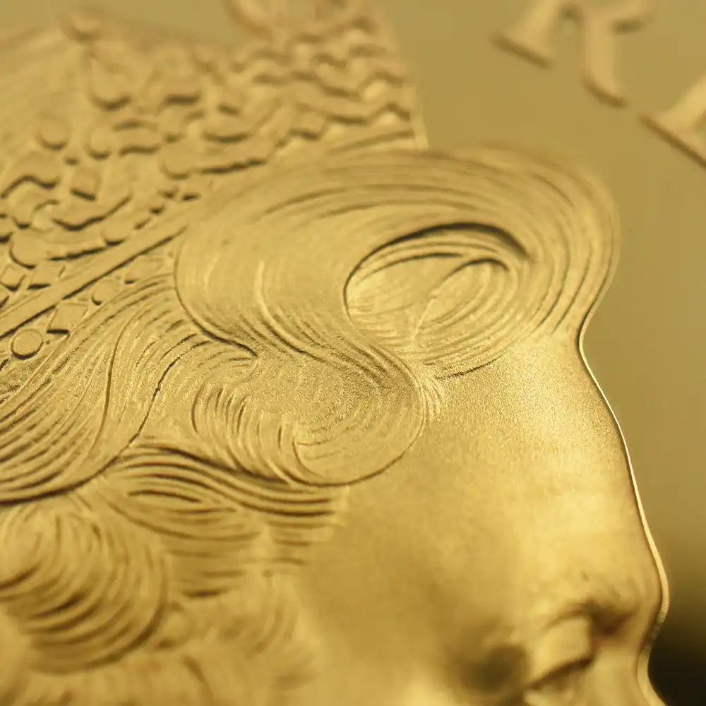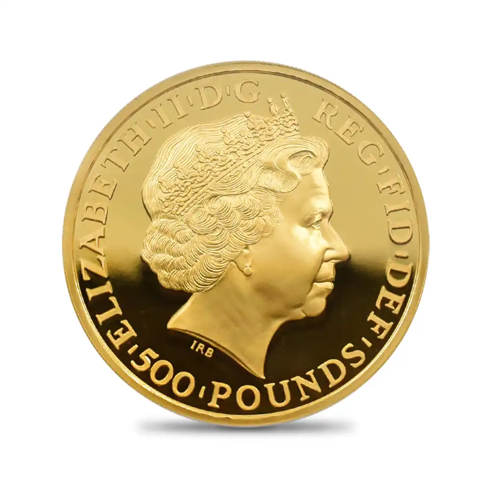 2014年に英国貨幣の発行元であるロイヤルミントがデザインした当ブリタニア500ポンド5オンス金貨は、21世紀に生きるブリタニアの国際性を強調するデザインによって不変の価値を有するものです。チャールズ2世の治世下の1672年にブリタニア像がコイン上に復活してからはや300年以上の時が経過していますが、1980年代以降、世界を魅了し続けている一連のブリタニアコインは、現代的で洗練された魅力的なデザインもさることながらゴールドを始めとするマテリアルと種々のサイズのラインアップによって熱狂的なコインマニアのみならず英国コインのファンの注目を集め続けて来ました。当2014年度版の裏面に描かれているブリタニアは頭上にコリント式の兜を戴き、両手にはトライデントと盾を携えた典型的なブリタニアが描かれていますが、ほぼ8頭身に近い絶妙なプロポーションは女神の崇高性を強調すると共に永遠の女性美の極致を表出していると言えます。ブリタニアの足元に跪く大きなライオンは、ヴィクトリア期のコインの傑作「ウナとライオン」を想起させるものであり、このコイン最大の注目点となっています。さらにその背後には大きな地球が描かれており、かつて地球の陸地面積の大半を収めた大英帝国を思わせる広大なる世界が広がっています。元来海を象徴する存在であるブリタニアですが、ここではそれのみならず、大英帝国の仮の姿であるイギリス連合王国の象徴である英国君主を想起させます。そしてコインの表面を見てみますと、現英国女王エリザベス2世の荘厳なる絵姿が裏面の意匠の正統性を物語っているかの如く、その微笑みと共に圧倒的存在感を誇示しています。英国を代表する彫刻家イアン・ランク・ブロードリーの大作であり、普遍的なコイン肖像の傑作でもあるこの「エリザベス女王の第4肖像」は、70代に差し掛かった英国女王の崇高な面持ちを写実的に描く英国貨幣史上の奇跡であると言っても過言ではありません。女王の頭上に輝くのは、英国王室屈指の秘宝「大英帝国とアイルランドの少女たちのティアラ」です。女王が最も愛する宝飾品としても知られているこの名品は、かつてヴィクトリア期に後のジョージ5世とメアリー王妃の婚礼に際してアイルランドの女性活動団体が基金を募って王妃に献上したもので、その後、1947年に現女王が夫のフィリップ殿下との婚礼に際して祖母のメアリー王妃から受け継いだものとされています。ハイレリーフ仕様が浮き彫りにするコイン表裏のデザインはどちらも英国君主の威厳と優美極まりない女性美に捧げられるものであり、当金貨に生命力溢れる存在感を与え、見るものを恍惚とさせる表現力を併せ持ちます。
