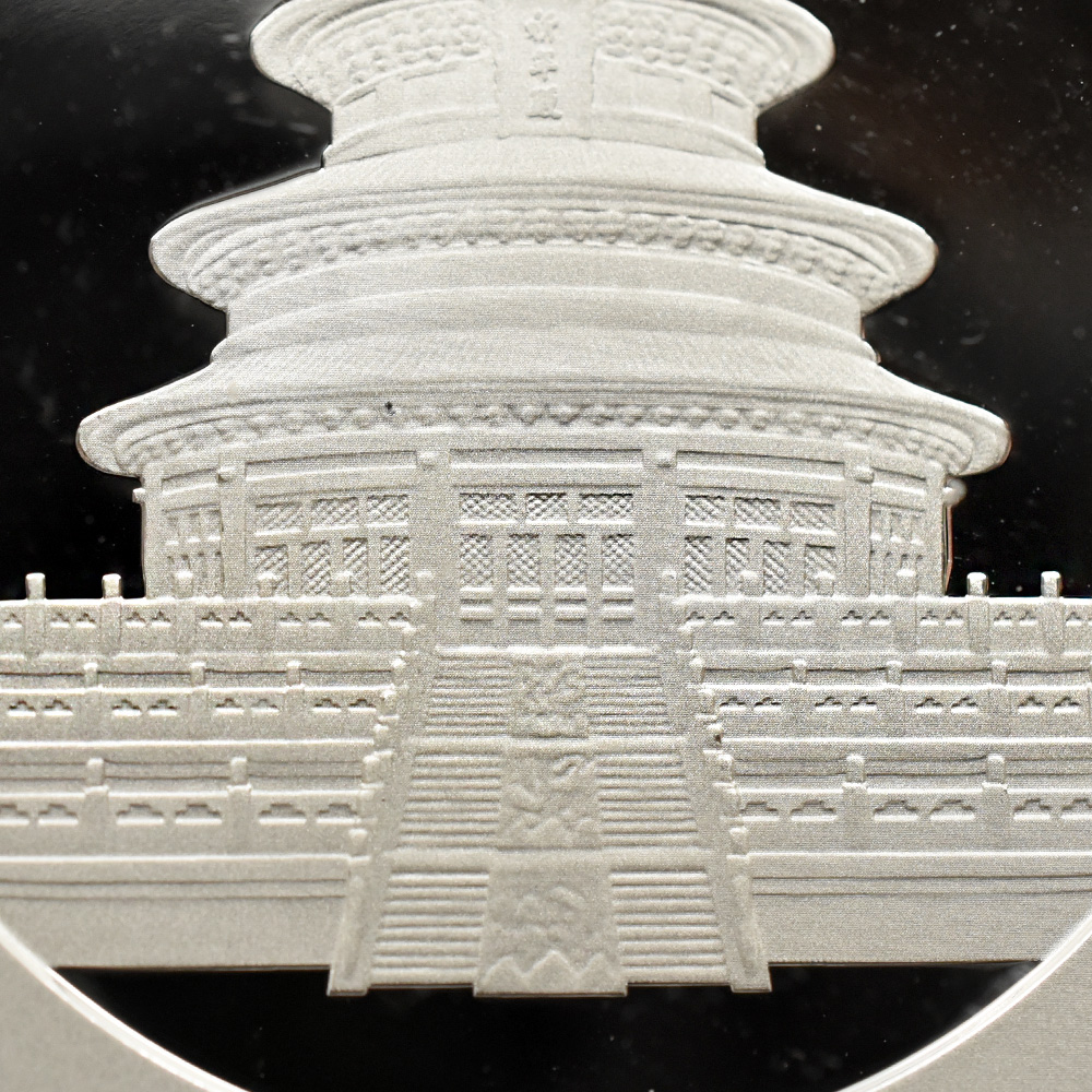 当コイン表面には、北京の代表的な建造物である「天壇」が描かれています。「天壇」は、明朝(1368-1644)および清朝(1644-1912)各王朝時代に、皇帝が天を祀る場所として創建した建造物として知られ、1988年に世界遺産として登録された北京最大のシンボルの一つです。