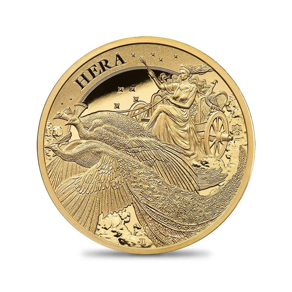 南大西洋に浮かぶ絶海の孤島セントヘレナは、これまで英領国家として、英国本国に先駆けて数多くの魅力的な記念コインとコインシリーズを発表し続けてきました。それらの中でも近年最も大きな成功を収めたのが、ギリシャ神話に登場する女神たちにスポットを当て、コインデザインとして紹介する「女神シリーズ」です。今回は、ギリシャ神話の最高神ゼウスの妻にして最高位の女神であるヘラを取り挙げます。古代ギリシャ語で貴婦人や女主人を意味する名を持つヘラは、結婚と母性、貞節を司る女神として知られており、これまでにも「結婚の」「縁結びの」等、数々の形容詞を伴って世界に紹介されてきました。ギリシャ神話おいてオリュンポス山の山頂に住まうと伝えられる「オリュンポス十二神」の一柱に数えられるヘラは一般的に「神々の女王」として認知されており、威厳を湛えた天界の女主人として絶大な権力を握るとされ、常に権威の象徴としての宝冠と王笏を携えています。また聖鳥は孔雀、郭公、鶴であり、聖獣は牝牛とされています。加えて、百合、ザクロ、リンゴ、松明等を象徴とし、ローマ神話界においてはユーノー(ジュノー)と呼ばれていることから6月の象徴とされています。この故事から、6月はヘラに因んで結婚に最も適した季節とされ、「ジューン・ブライド=6月の花嫁」なる語が派生したと伝えられています。結婚を司る女神であることから一見平和主義を掲げているように思われるヘラですが、実は嫉妬の女神としての顔をも持ち合わせており、浮気性の夫ゼウスの浮気相手の女神達やその子供たちに対しては徹底して復讐する嫉妬の女神としても名を馳せています。ヘラの母乳は飲んだ者の肉体を不死身に変える力があると信じられており、ヘラクレスも幼児期にこれを飲んだために驚異的な怪力を発揮したと言われています。その時に母乳を吸う力があまりにも強かったため、ヘラはヘラクレスを突き飛ばし、その際に飛び散ったヘラの母乳が天の川になったとの伝承が残っています。ヘラクレスはヘラの子では無かったものの、この故事にちなんで「ヘラの栄光」を意味する「ヘラクレス」の名を与えられました。人間に置き換えることも可能な程に生命力溢れる神々たちが登場するギリシャ神話の世界ですが、とりわけそこに登場する女神たちのみに焦点を当てる当コインシリーズは、「神々の世界に女あり」の感を抱かせるほどに劇的で奥の深い世界感をコイン上にて視覚化する意欲的なコインシリーズであることは間違いありません。