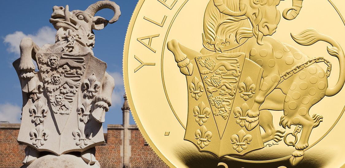 コイン裏面には「クイーンズ・ビースト・コレクション」の時とはまた違った魅力を持つ全く新しいイェール像が見られ、改めてその神秘的な姿に心惹かれる思いがします。イェールが胸に掲げる盾には、ヘンリー7世の唯一の後継者としてテューダー家と命運を共にし、同王朝の最盛期を築き上げた偉大なる国王ヘンリー8世の最愛の妻、ジェーン・シーモアの紋章が刻まれています。ロイヤルミントの気鋭デザイナー、デビッド・ローレンスによる才気あふれる造形美は当コイン裏面に遺憾なく発揮され、「クイーンズ・ビースト」で既にお馴染みのイェールを異なる角度から見事に再現しています。