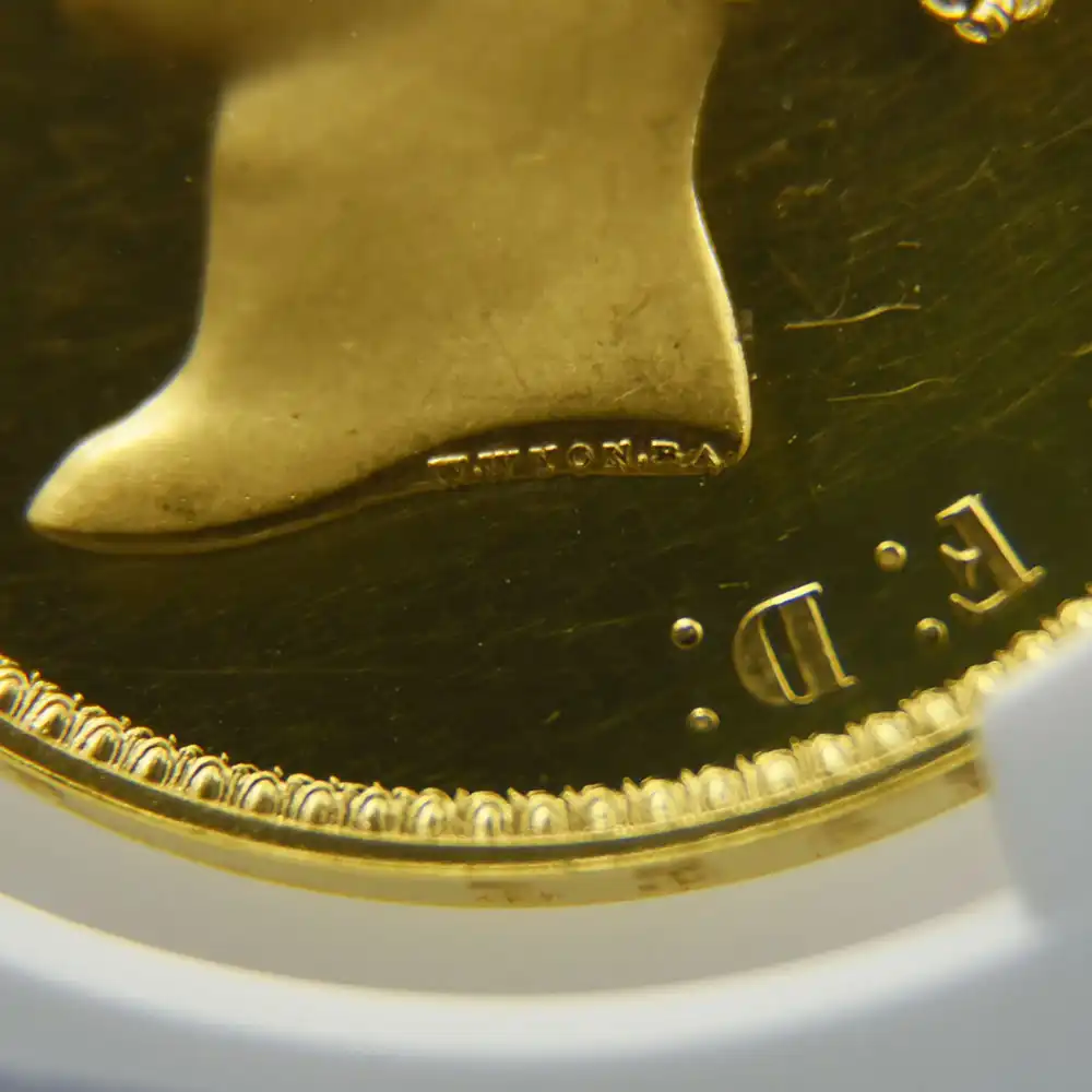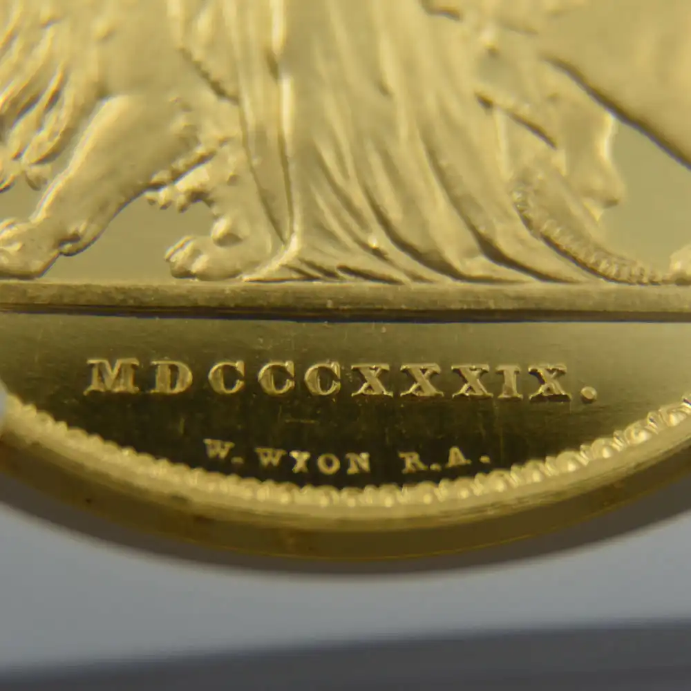 「大英帝国」の名の下に史上最大の帝国を築きつつあった1830年代の英国に君主として即位した若き日のヴィクトリア女王。若干18歳の君主は、その余りにも壮大なスケールを誇る捉えどころの無い国家を生来の威厳と自己修練によってその後63年間もの長きにわたって統治します。その長大なる治世は後に「ヴィクトリア期」と呼ばれ、歴史上における英国の近代の幕開けと見なされるようになります。女王に相応しい風格を身に付けたヴィクトリアは夫アルバート公爵の助言の下、絶えず膨張し続ける帝国の宗主として国家と命運を共にしました。即位の翌年1838年にロンドンのウェストミンスター寺院にて挙行された新女王の戴冠式を記念して発行されたコイン表面に初めて描かれた「ヤングヘッド」の愛称を持つ治世初の公式肖像は、即位当初のヴィクトリアの瑞々しい美しさを表出するコインポートレートの歴史的大作としてその後、高い評価を獲得します。ヴィクトリア自身もことのほかこの肖像を気に入っていたと伝えられており、作者のウィリアム・ワイオンの豊かな芸術性を讃える言葉が数多く残されているほどです。女王は「ワイオン氏ほどに私を私が描いて欲しいように描いてくれるアーティストは他にいません」と絶賛し、その後、60代半ばに至るまで決して公式コイン肖像を新しいものに変更する許可を与えなかったと言われています。若々しさと共にそこに表現されている見逃すことのできない要素は、史上最大の帝国の未来を背負うことになった使命感漲る新国王の真摯な気迫であり、女王の治世を代表する名コインポートレートとして歴史的評価を確立するに至ります。ジョージ王朝時代末期のコイン界にて頭角を現し、ウィリアム4世の治世を経て、ヴィクトリア朝初期にはロイヤルミントの彫刻部門主任を務めていたワイオンの天賦の才能は、同ポートレートの制作によって開花したと言っても過言ではありません。そして女王の即位3周年の年に発行された「ウナとライオン」5ポンド金貨の表面に刻まれたことにより、同ポートレートはその後180年以上にわたって「ヤングヘッド」の愛称と共に英国貨幣史上におけるコイン肖像の最高傑作としての名声を欲しがままにしています。