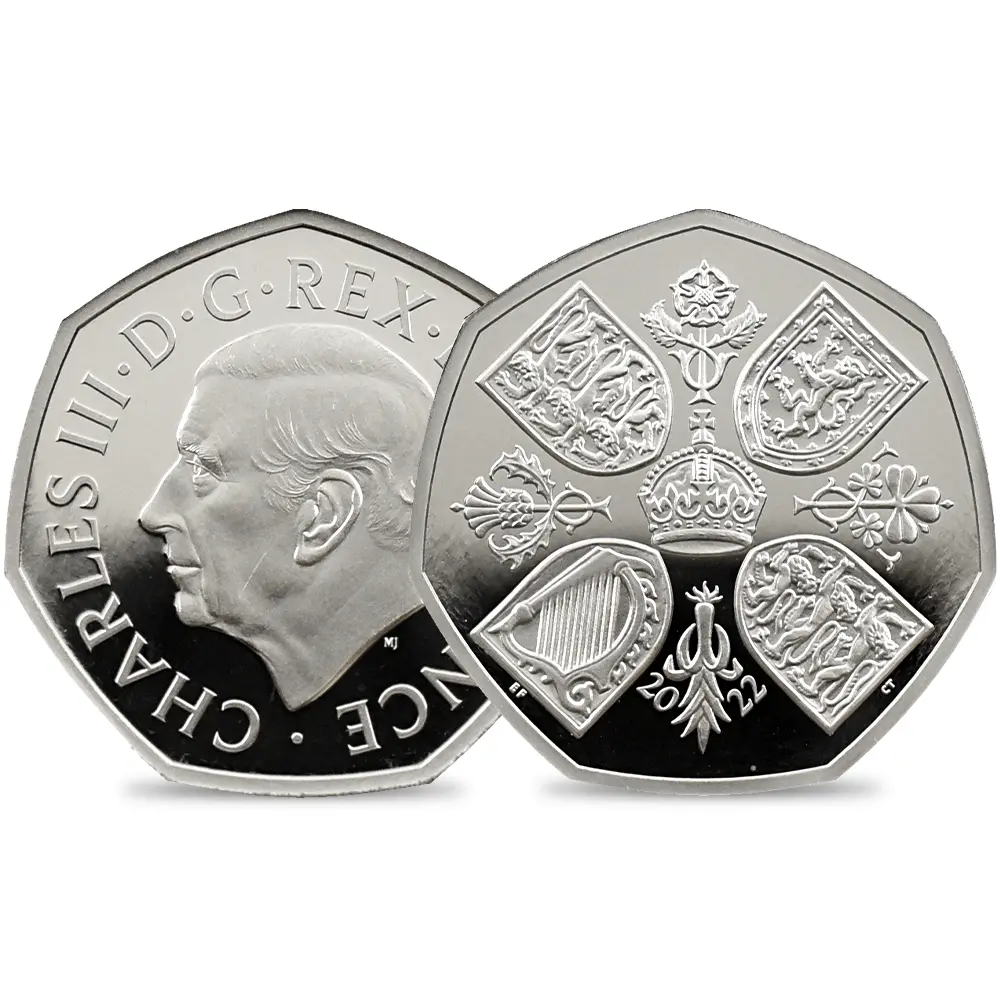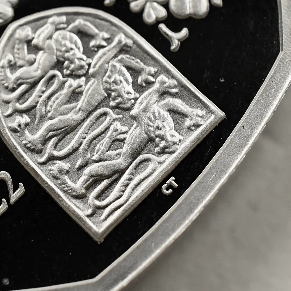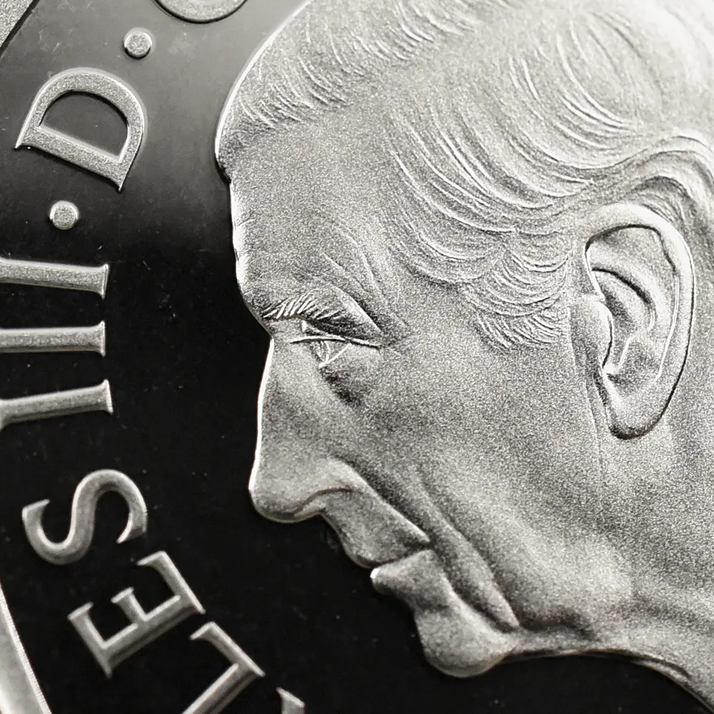 エリザベス2世の崩御を受けて73歳で英国王位を推戴された新英国王チャールズ3世。偉大なる帝王の治世の後に王位を継承するのは並大抵のことではないはずですが、チャールズ新国王はこれまでにも数えきれないほど多くの社会貢献を果たしてきた行動派の王族としてもよく知られていますので、先ずは盤石の継承であると言えます。王自身によって設立された「Prince’sTrust」は、未就業の若者に職業訓練の機会を与え、英国社会が慢性的に抱える社会問題の抜本的な解決を促し、雇用機会を飛躍的に向上させました。環境問題に対しての積極的な発言で名高い王は、自身が運営するハイグローブの農園における有機農法の実践でも知られており、また温暖化に対する懸念を積極的に表明した最初の英国王室の一員としても人望を集めて来ました。広い見識の下に社会に注がれた王の深い愛情が実を結ぶ時がやって来たように思われます。今回ご紹介させていただくコイン表面には、チャールズ3世の慈愛溢れる左向き肖像が描かれています。精妙極まりない写実性を最大の特徴とするこのポートレートは、現代ロイヤルミントを代表する実力派デザイナー、マーティン・ジェニングスが世界に贈る会心の傑作です。そしてその周囲の碑文に着目しますと、国王の王名「チャールズ」が英語で表記されている事実に隔世の感を抱かずにはいられません。と言いますのも、17世紀の英国に君臨したチャールズ1世や2世の治世下においては、コイン上の国王の名はチャールズのラテン語名「Carolus」と表記されていたからに他なりません。今回は王名に続く文言「神の恩寵による国王・忠誠の守護者」の文言のみがラテン語表記となり、伝統は部分的に継承されることになりました。そして期待の裏面デザインは、前国王エリザベス2世の70年間にわたる驚異的な治世に捧げられます。イングランドを始めとするイギリス連合王国4国の国章を模った盾形の4つの紋章の間にはそれぞれの国家を象徴する花(バラ、アザミ、シャムロック・ネギ)が描かれ、百花繚乱の趣を添えています。そして中央には英国王位の永遠の象徴である宝冠が描かれ全体を引き締めています。この宝冠の紋章は、1953年のエリザベス2世の戴冠式に際して紋章画家のエドガー・フラーがデザインしたもので、今回のコイン発行に際してセシル・トマスが再現したものです。7角形が特徴的な当コインは、新国王チャールズ3世が君臨する新しい英国を象徴すると共に、英国王室の偉大なる過去と前進し続ける現在に捧げられる完成度の高い芸術品に他なりません。