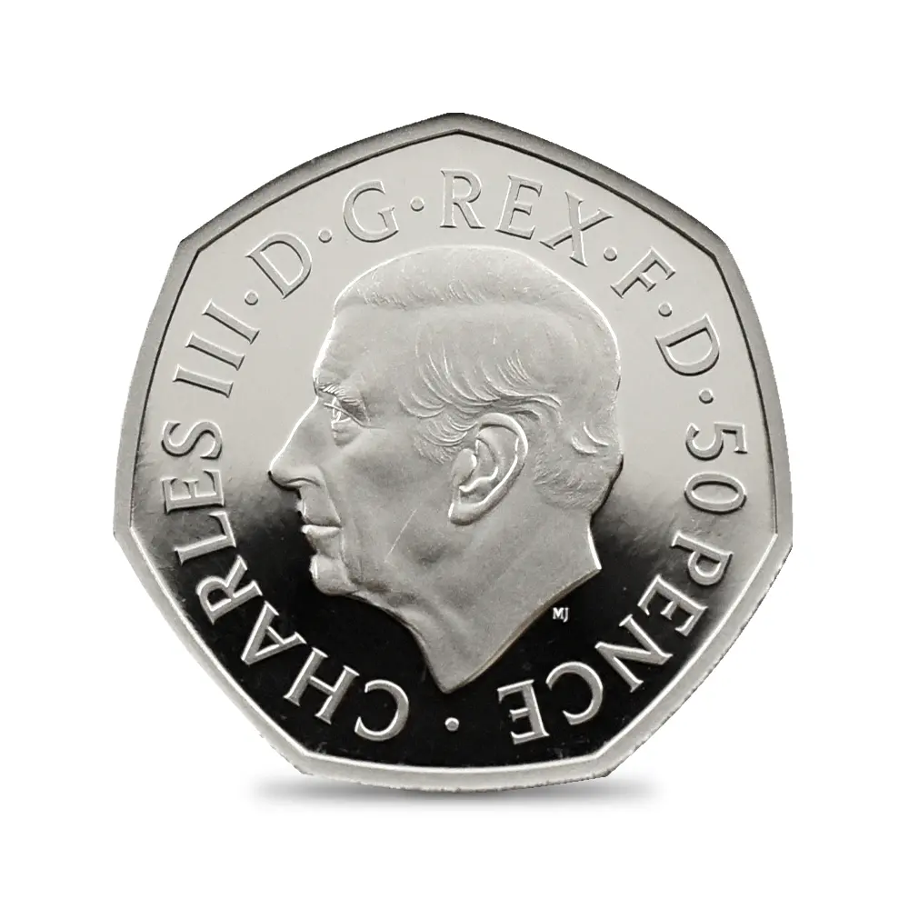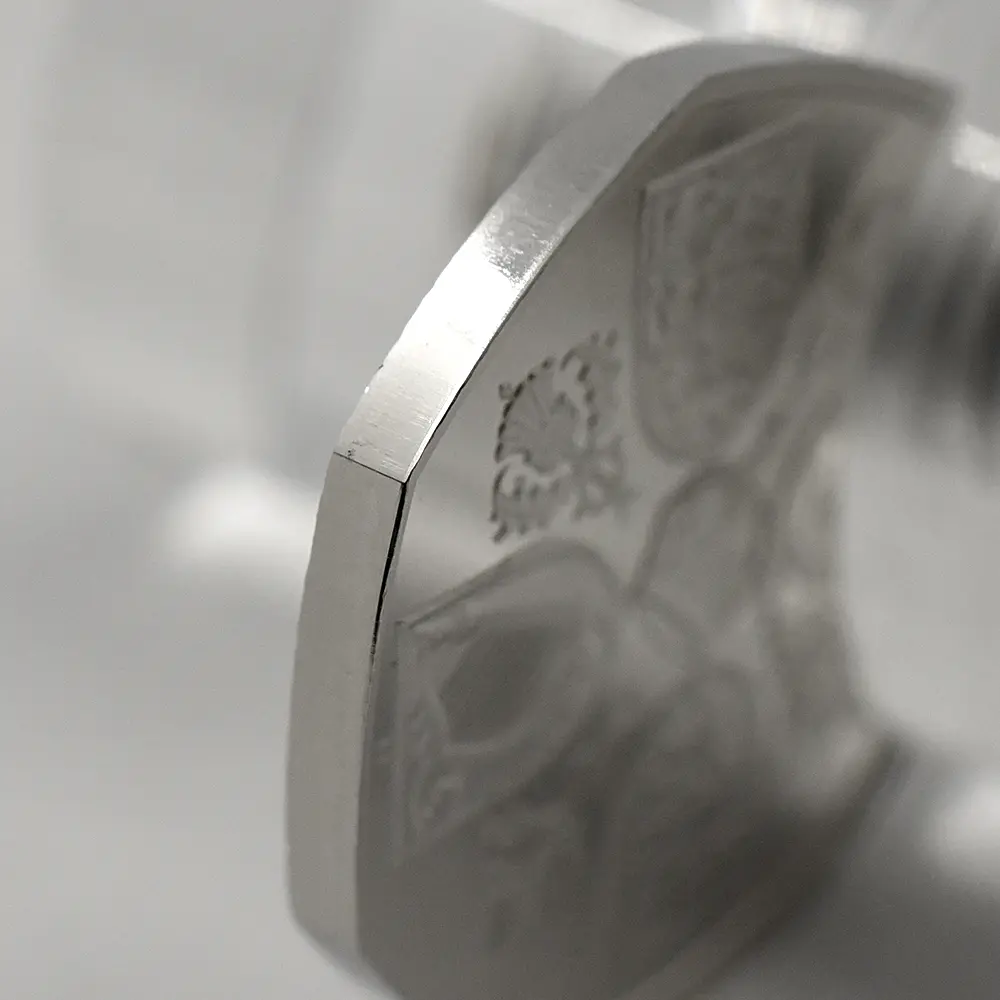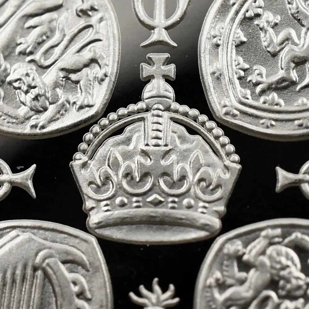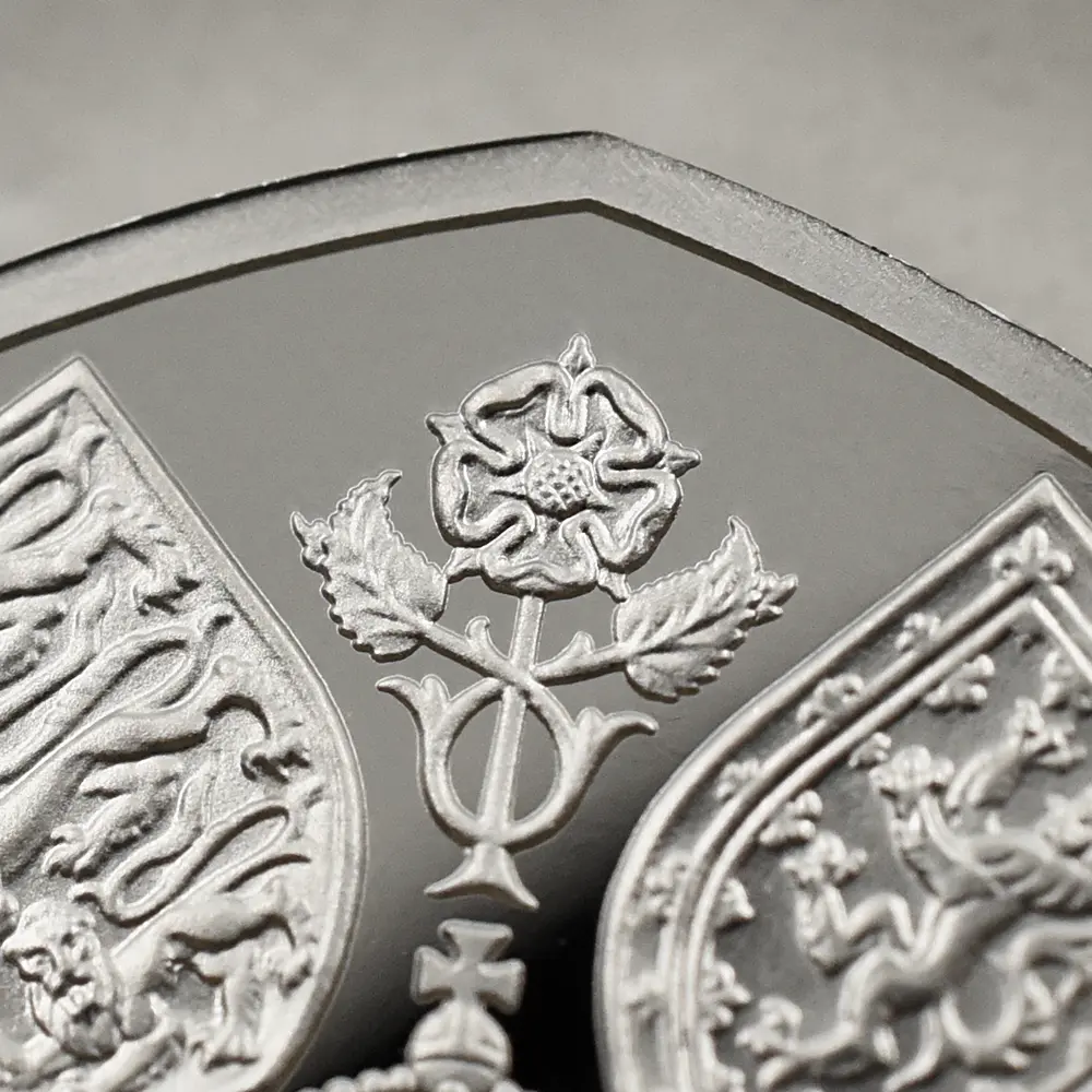 エリザベス2世の崩御を受けて73歳で英国王位を推戴された新英国王チャールズ3世。偉大なる帝王の治世の後に王位を継承するのは並大抵のことではないはずですが、チャールズ新国王はこれまでにも数えきれないほど多くの社会貢献を果たしてきた行動派の王族としてもよく知られていますので、先ずは盤石の継承であると言えます。王自身によって設立された「Prince’sTrust」は、未就業の若者に職業訓練の機会を与え、英国社会が慢性的に抱える社会問題の抜本的な解決を促し、雇用機会を飛躍的に向上させました。環境問題に対しての積極的な発言で名高い王は、自身が運営するハイグローブの農園における有機農法の実践でも知られており、また温暖化に対する懸念を積極的に表明した最初の英国王室の一員としても人望を集めて来ました。広い見識の下に社会に注がれた王の深い愛情が実を結ぶ時がやって来たように思われます。今回ご紹介させていただくコイン表面には、チャールズ3世の慈愛溢れる左向き肖像が描かれています。精妙極まりない写実性を最大の特徴とするこのポートレートは、現代ロイヤルミントを代表する実力派デザイナー、マーティン・ジェニングスが世界に贈る会心の傑作です。そしてその周囲の碑文に着目しますと、国王の王名「チャールズ」が英語で表記されている事実に隔世の感を抱かずにはいられません。と言いますのも、17世紀の英国に君臨したチャールズ1世や2世の治世下においては、コイン上の国王の名はチャールズのラテン語名「Carolus」と表記されていたからに他なりません。今回は王名に続く文言「神の恩寵による国王・忠誠の守護者」の文言のみがラテン語表記となり、伝統は部分的に継承されることになりました。そして期待の裏面デザインは、前国王エリザベス2世の70年間にわたる驚異的な治世に捧げられます。イングランドを始めとするイギリス連合王国4国の国章を模った盾形の4つの紋章の間にはそれぞれの国家を象徴する花(バラ、アザミ、シャムロック・ネギ)が描かれ、百花繚乱の趣を添えています。そして中央には英国王位の永遠の象徴である宝冠が描かれ全体を引き締めています。この宝冠の紋章は、1953年のエリザベス2世の戴冠式に際して紋章画家のエドガー・フラーがデザインしたもので、今回のコイン発行に際してセシル・トマスが再現したものです。7角形が特徴的な当コインは、新国王チャールズ3世が君臨する新しい英国を象徴すると共に、英国王室の偉大なる過去と前進し続ける現在に捧げられる完成度の高い芸術品に他なりません。