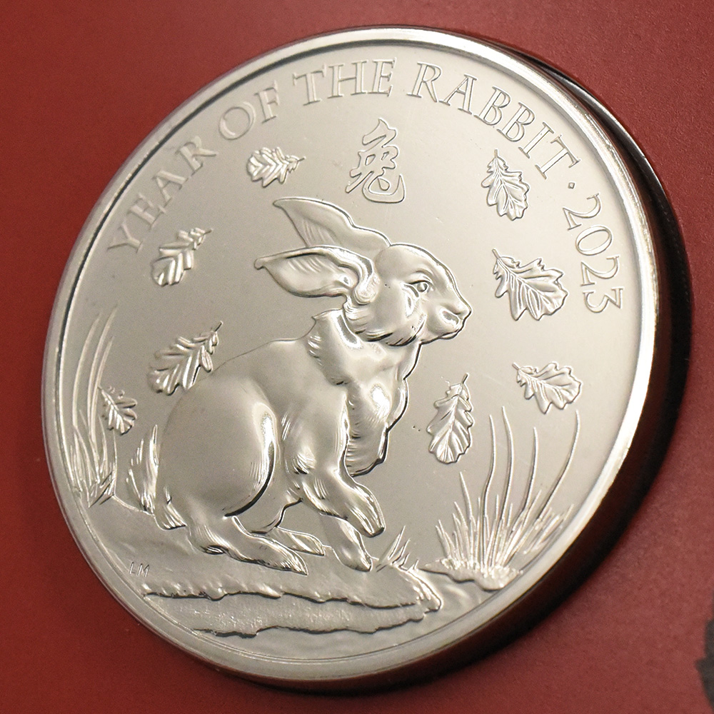 干支を構成するそれぞれの動物が一人の人間の人生を象徴し、また具体的な意味づけをすると言う解釈は、大変興味深いものであると言えます。例えば、穏やかで従順なイメージを醸し出す兎は、古来「安全」の象徴とされてきました。また、兎が持つしなやかな跳躍力は、「飛躍・向上」を意味することから、未来に向けての無限の可能性を暗示しているとも解釈することが可能です。中国をはじめとするアジア圏の伝統的概念によりますと、卯年生まれの人の性格を表す言葉として「知性」「優美」「慎重」「温和」等が当てはまります。また、敵をつくらない平和主義と困難にも立ち向かう強固な意志を持ち合わせ、目的を成就するタイプであることを特徴とします。英国ロイヤルミントが手掛けた「十二支シリーズ」が、古代中国を源流とする十二支の概念を世に広め、アジアの伝統文化の架け橋としての役割を担っていることは称賛に価するものです。それぞれの動物が象徴する概念は、新年を迎える国家や国民に希望や勇気を与えるものであり、その後1年間の運勢を決定づける重要な要素でもあります。今回ご紹介させていただく2023卯年記念コインですが、裏面中央に描かれている黄金の兎は未来を見つめ、2023年の飛躍を願うかのような躍動感を醸し出しています。また、兎の柔らかい毛並みが見事に表現されており、「優美」や「温和」を象徴すると同時に、デザイナーの秀逸なセンスと技術の高さが見受けられます。コイン表面に描かれた明るく華やかな黄金の光を放つエリザベス2世のポートレートには、英国をはじめとする世界各国における飛躍と安寧への願いが込められているように感じられます。コロナパンデミックや数々の紛争、多発する自然災害、そして分断や格差の拡大などによる先の見えない不安定性に満ちた今日において、平和や協調、そして飛躍を象徴する兎をデザインとした当コイン発行の意義は極めて大きく、当コインの発行元、英国ロイヤルミントの功績は特筆に価します。十二支に選ばれた動物たちがコインデザイン上に圧倒的な生命感を持って表現され、これまでのリリースにおいて輝かしい成功を収めてきた干支シリーズですが、シリーズ第10弾となる当コインは、金と銀のラインアップによる限定記念コインとして発表されました。現代ロイヤルミント屈指の才人の一人とされるコインデザイナー、Louie Maryon氏による兎の特徴を生き生きと表現したデザイン技術は、英国と中国の両文化を見事に融合させ、各界における高い評価を獲得しました。これらの理由により、今後も続くラインアップの価格推移が大いに期待できる秀逸な芸術作品であることは間違いありません。そして当コインに描かれた躍動感溢れる兎が、シャンパンゴールドや白銀の輝きをともなって卯年2023年全体を照らし出すことでしょう。