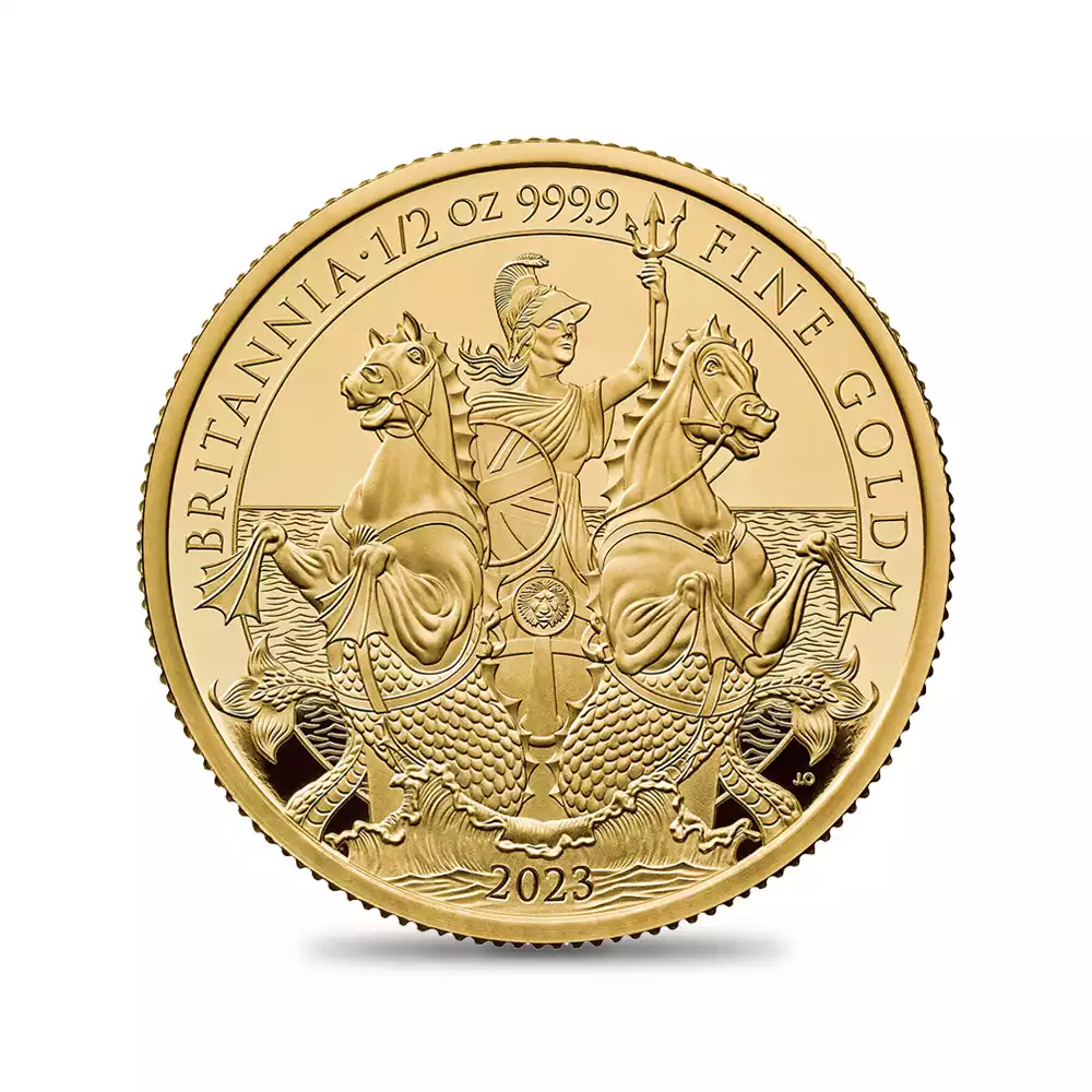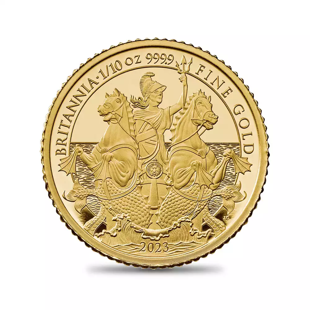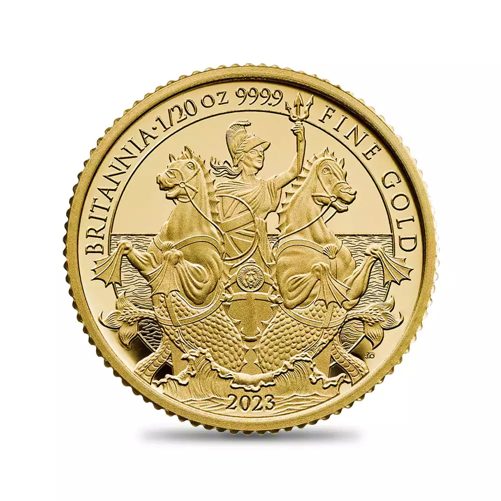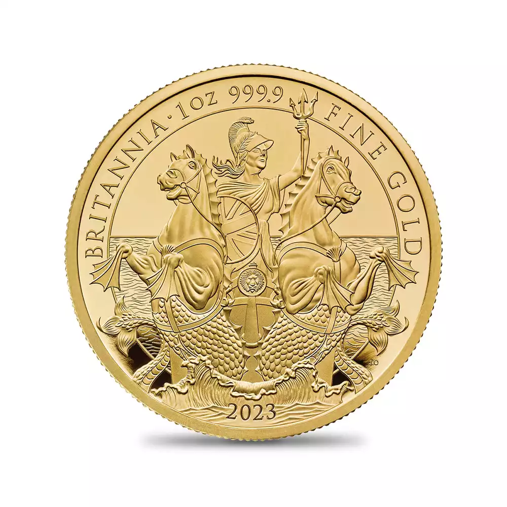 古代ローマ時代より受け継がれた女戦士としての外観はそのままに、毎年発表される新しいデザインによって生まれ変わるコイン上に描かれたブリタニアの肖像。今やモダンコインシリーズの最高傑作の一つと認知されているブリタニア・コインシリーズですが、本年2023年度のブリタニアコインは、古典性を重視した本来の女戦士としての描写への回帰が最大の特徴であり、その出来栄えは驚異的ですらあります。現代ロイヤルミントが総力を結集して生み出したこの度の作品は、昨年即位したチャールズ3世の治世下初のブリタニアコインとしても特筆に値するものです。表面には昨年末の英国貨幣界を騒然とさせたチャールズ3世のコイン肖像が刻まれています。ロイヤルミントの実力派デザイナー、マーティン・ジェニングスによるこの新国王の肖像は、先ず何よりも精密な写実性を特徴とするもので、齢74歳を数える新英国君主の威厳と人間味あふれる温かさを表出する現代コインポートレートの秀作に他なりません。そして期待の裏面ですが、2頭立ての「シー・チャリオット」と呼ばれる古代戦車を自由自在に操縦する武具甲冑で身を固めた女戦士ブリタニアの正面向きの肖像を全面に浮かび上がらせています。しかしこのデザインをよく見てみますと、2頭の馬の前足は水掻きを模して描かれており、胴体の下腹部には鱗が見られます。常に海と関連付けられるブリタニアの圧倒的存在感を表出する当裏面の劇的なデザインは、海と共に繁栄を極めた英国の長大なる歴史を物語っています。モダンコイン屈指の人気コインシリーズの新たな方向性を示唆する英国ロイヤルミント会心の自信作の感動的なリリースとなりました。