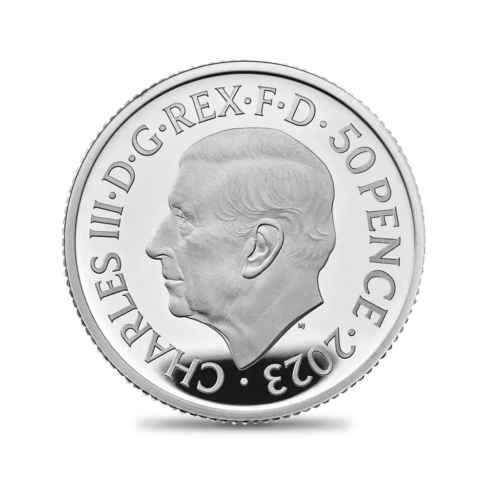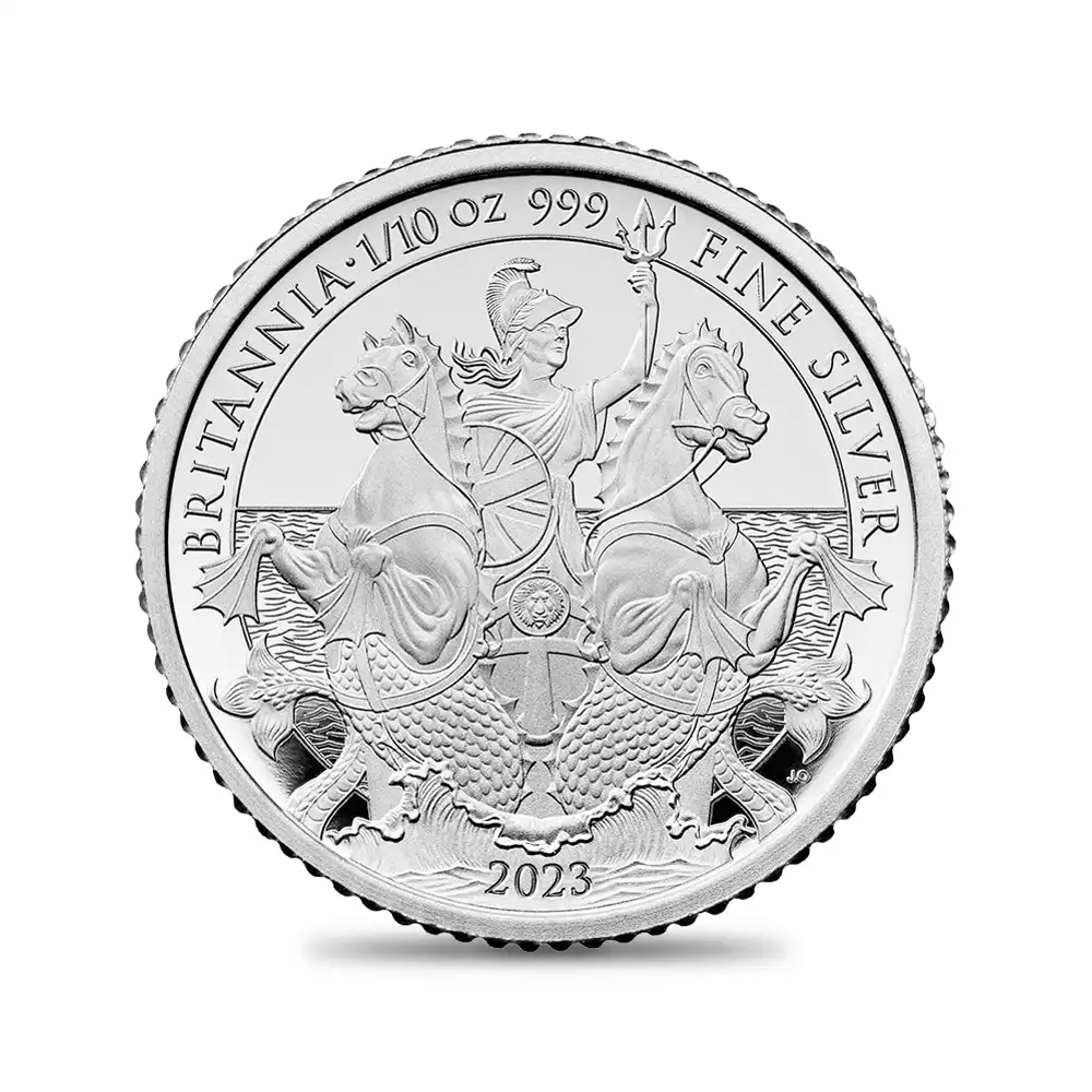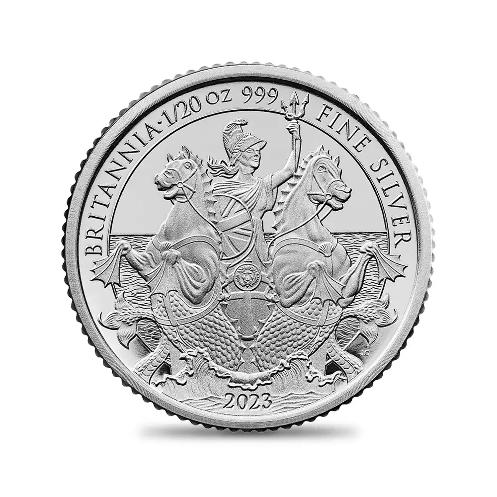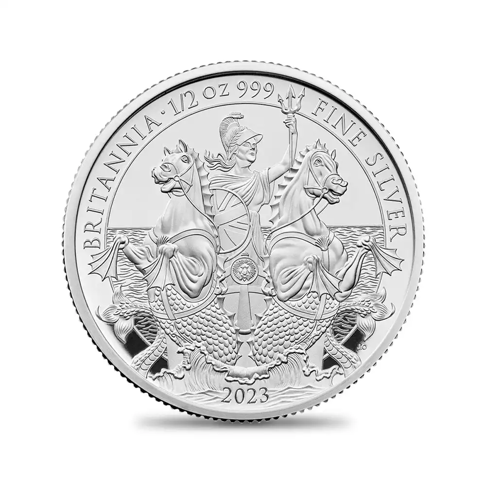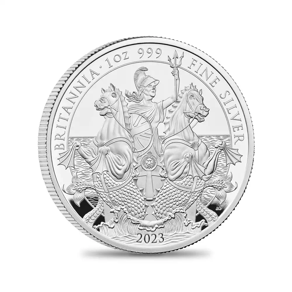 古代ローマ時代より受け継がれた女戦士としての外観はそのままに、毎年発表される新しいデザインによって生まれ変わるコイン上に描かれたブリタニアの肖像。今やモダンコインシリーズの最高傑作の一つと認知されているブリタニア・コインシリーズですが、本年2023年度のブリタニアコインは、古典性を重視した本来の女戦士としての描写への回帰が最大の特徴であり、その出来栄えは驚異的ですらあります。現代ロイヤルミントが総力を結集して生み出したこの度の作品は、昨年即位したチャールズ3世の治世下初のブリタニアコインとしても特筆に値するものです。表面には昨年末の英国貨幣界を騒然とさせたチャールズ3世のコイン肖像が刻まれています。ロイヤルミントの実力派デザイナー、マーティン・ジェニングスによるこの新国王の肖像は、先ず何よりも精密な写実性を特徴とするもので、齢74歳を数える新英国君主の威厳と人間味あふれる温かさを表出する現代コインポートレートの秀作に他なりません。そして期待の裏面ですが、2頭立ての「シー・チャリオット」と呼ばれる古代戦車を自由自在に操縦する武具甲冑で身を固めた女戦士ブリタニアの正面向きの肖像を全面に浮かび上がらせています。しかしこのデザインをよく見てみますと、2頭の馬の前足は水掻きを模して描かれており、胴体の下腹部には鱗が見られます。常に海と関連付けられるブリタニアの圧倒的存在感を表出する当裏面の劇的なデザインは、海と共に繁栄を極めた英国の長大なる歴史を物語っています。モダンコイン屈指の人気コインシリーズの新たな方向性を示唆する英国ロイヤルミント会心の自信作の感動的なリリースとなりました。