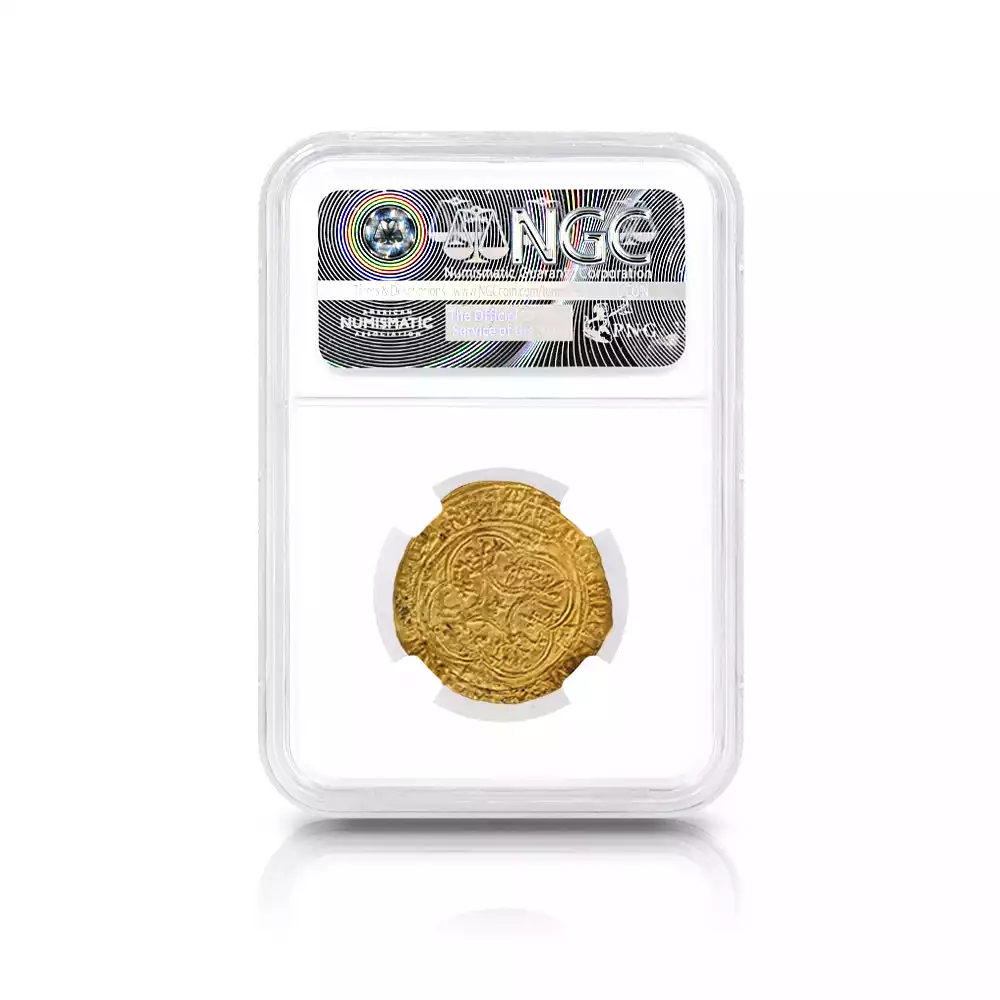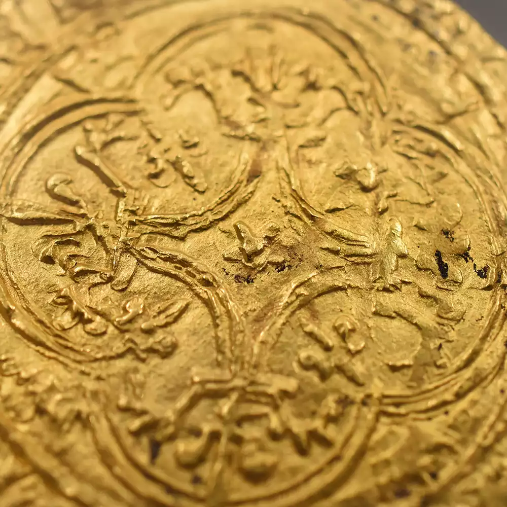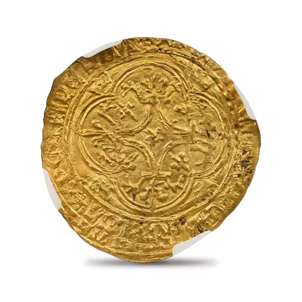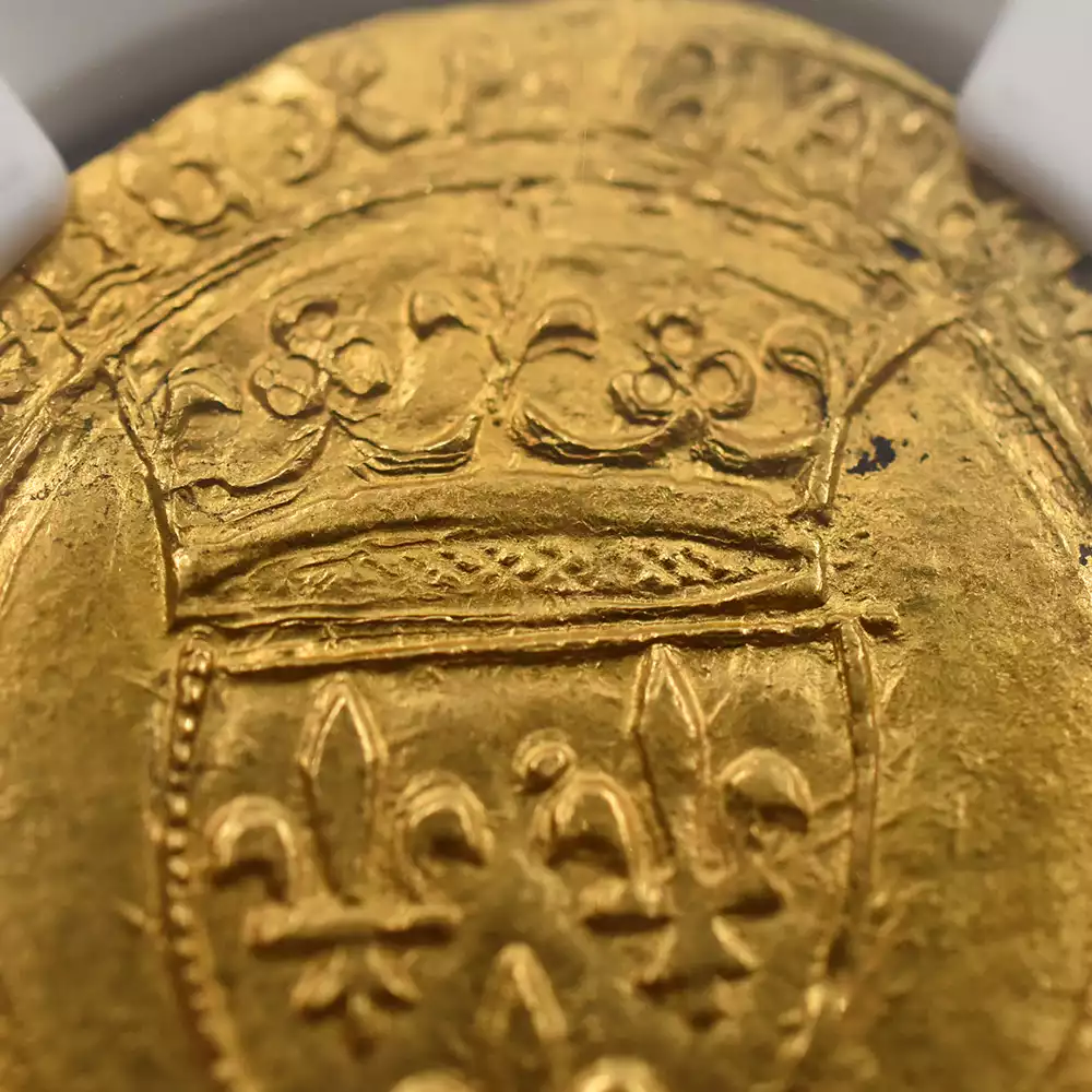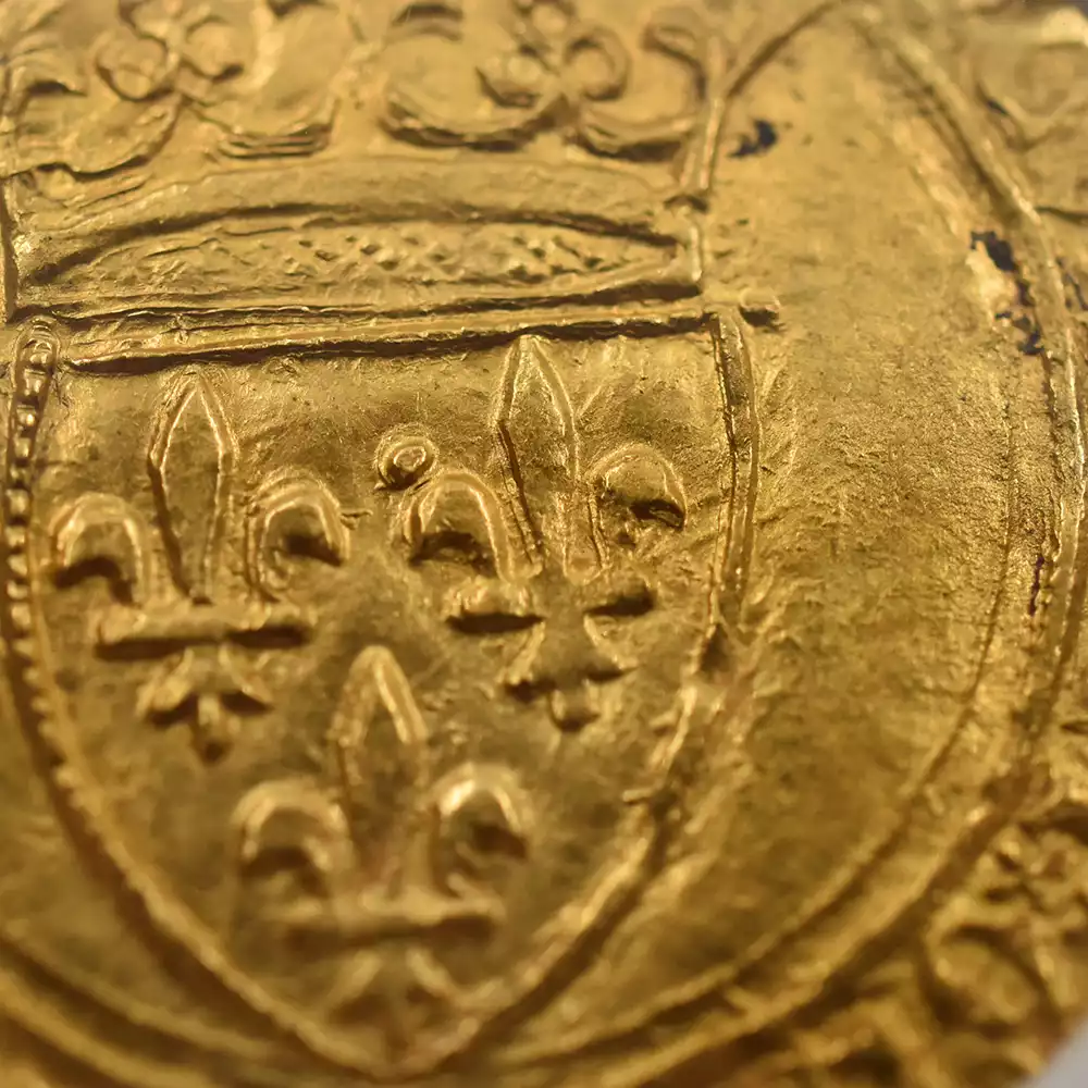 シャルル6世の治世は42年間と比較的長期であったものの、その治世の大部分は王が患っていた精神障害によって廷臣たちやイングランド王室に翻弄された時代として記憶されています。王の生涯を苛んだ病状によって非常にネガティブな印象を持たれやすいシャルル6世の治世ですが、歴史上のシャルル6世を象徴する文化遺産である「シャルル6世のタロットカード」1セットが後世に残されており、現在、パリ国立図書館が所蔵していることが確認されています。現存する世界最古のタロットカードとして知られるこの遺品に関しては、王の在世当時の宮廷の会計帳に記されていた「金色と他の色で着色された56枚の遊戯札」の記述と、それらのカード3セット分の制作費として、1392年に王室が画家ジャクマン・グランゴヌールにペルシャ硬貨6枚を支払ったという記録が残っています。シャルル6世の長期在位を象徴するもう一つの物的証拠として、今回ご紹介させていただく「エキュドール金貨」が挙げられます。精緻極まりない装飾性によって中世フランス金貨の華と謳われるこの歴史的な貨幣は、正式には「エキュ・ドール・アラ・クロンヌ=王冠を配した黄金の盾」と称され、その名称のごとく上部に王冠を戴く盾形の紋章を表面中央に描く重厚なデザインによって、中世フランスアンティークコインの中でも人気の高い逸品として知られているものです。盾の中にはフランス王位を象徴する紋章「フルール・ド・リス」が絶妙な間隔で配置されており、シャルル6世の王位の正統性を誇示しています。その周囲には「神の恩寵によるフランス国王シャルル」を意味するラテン語碑文が掲げられており、碑文の文体が当時のフランスにおける高度な貨幣鋳造技術を物語っています。裏面中央にはフルール・ド・リスを多様化した装飾的な十字紋が刻まれており、フランスコインならではの満艦飾の装いに目を奪われます。あらゆる角度から見て最高度の芸術性が顕著な当コインは、伝説の国王シャルル6世が生きた時代のフランス宮廷の栄華を我々の時代に伝える文化遺産として永遠の価値を有しています。