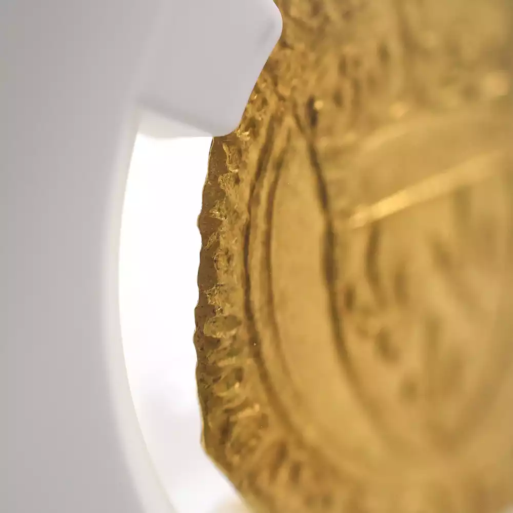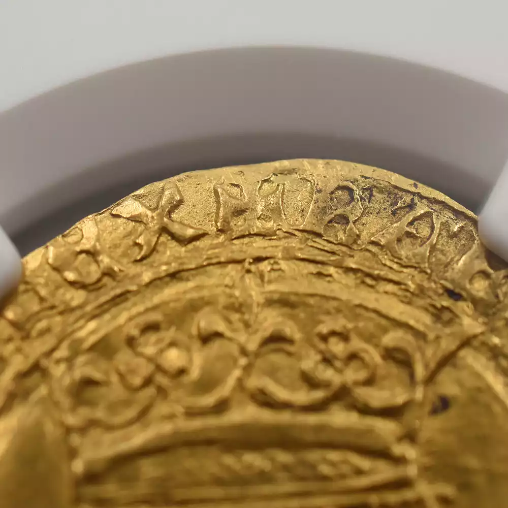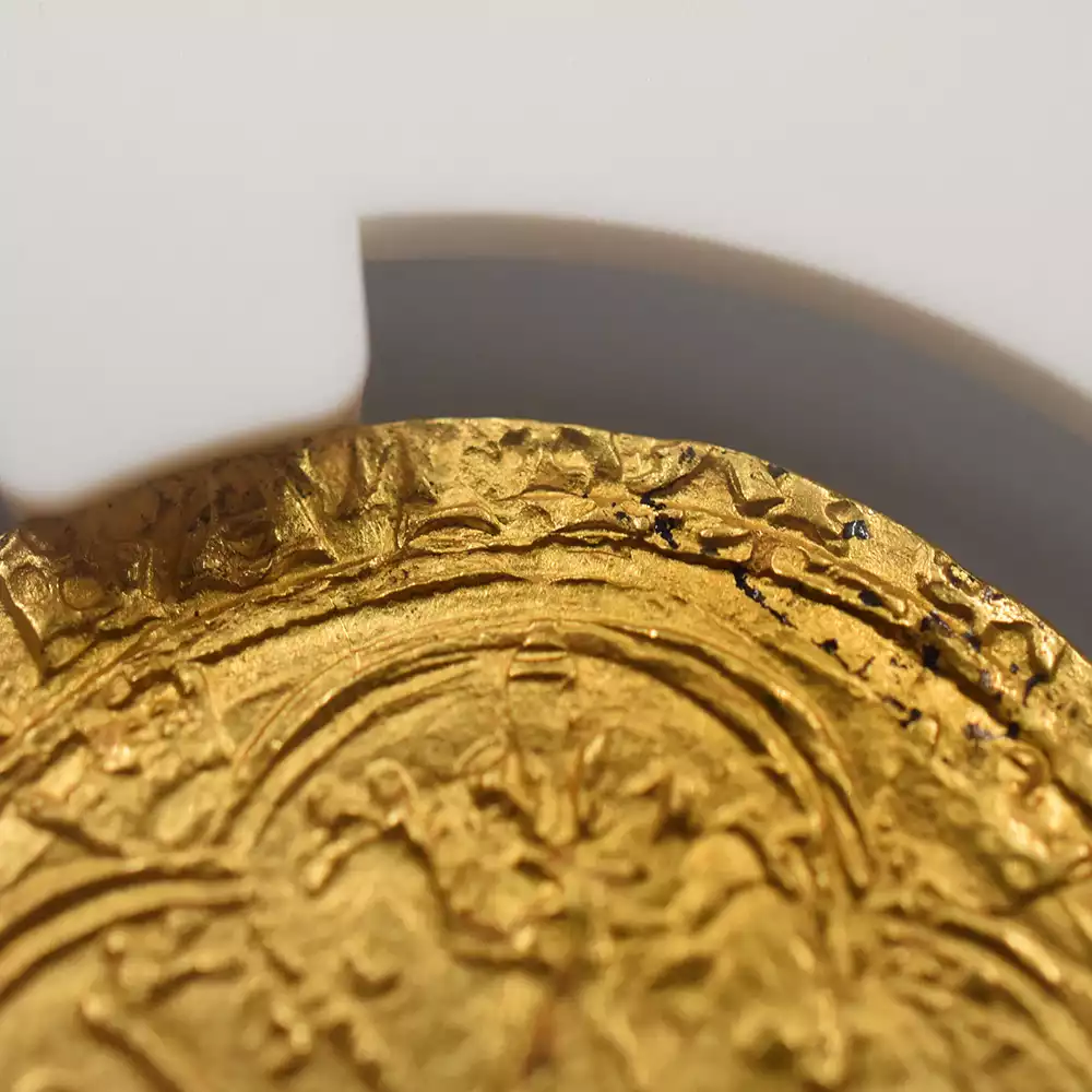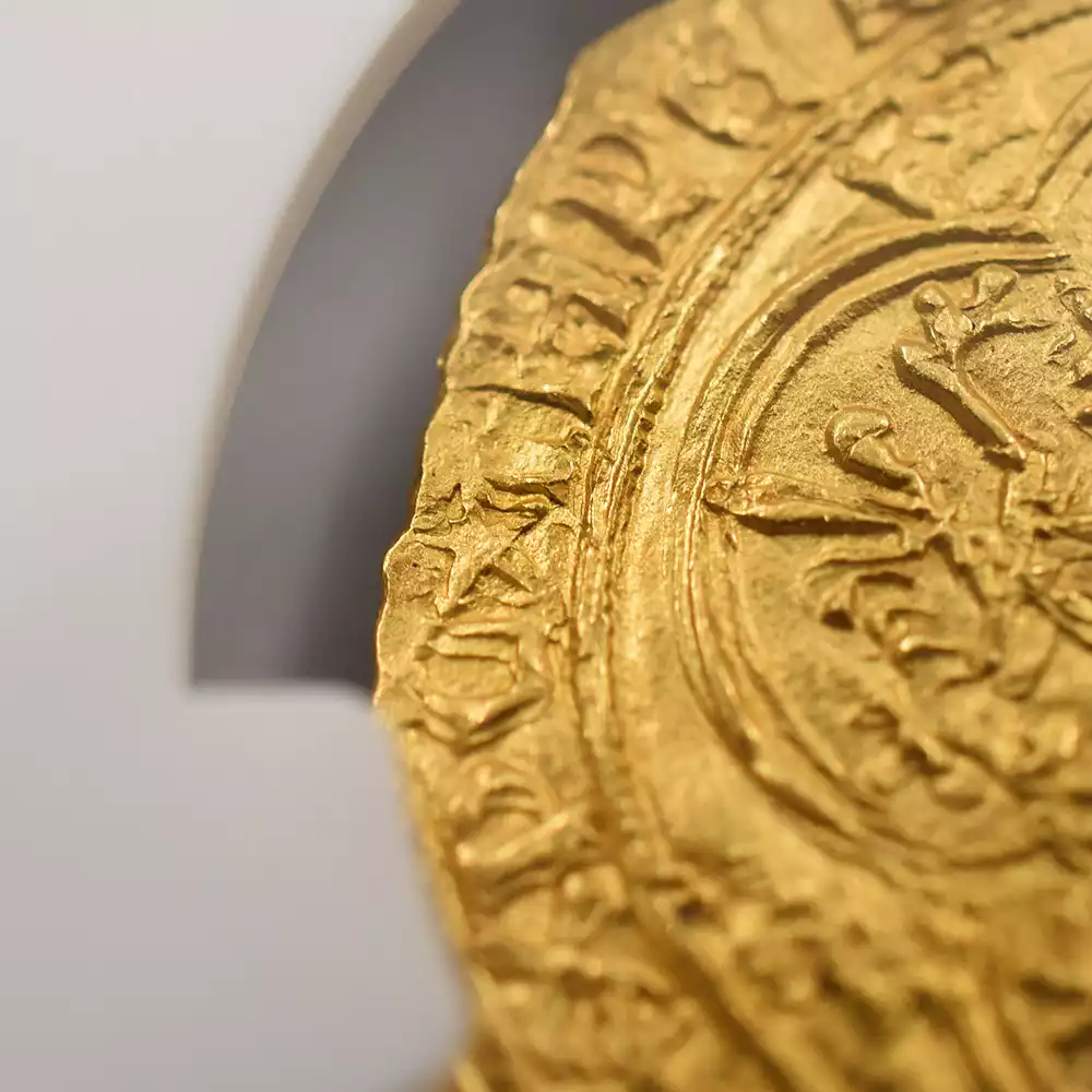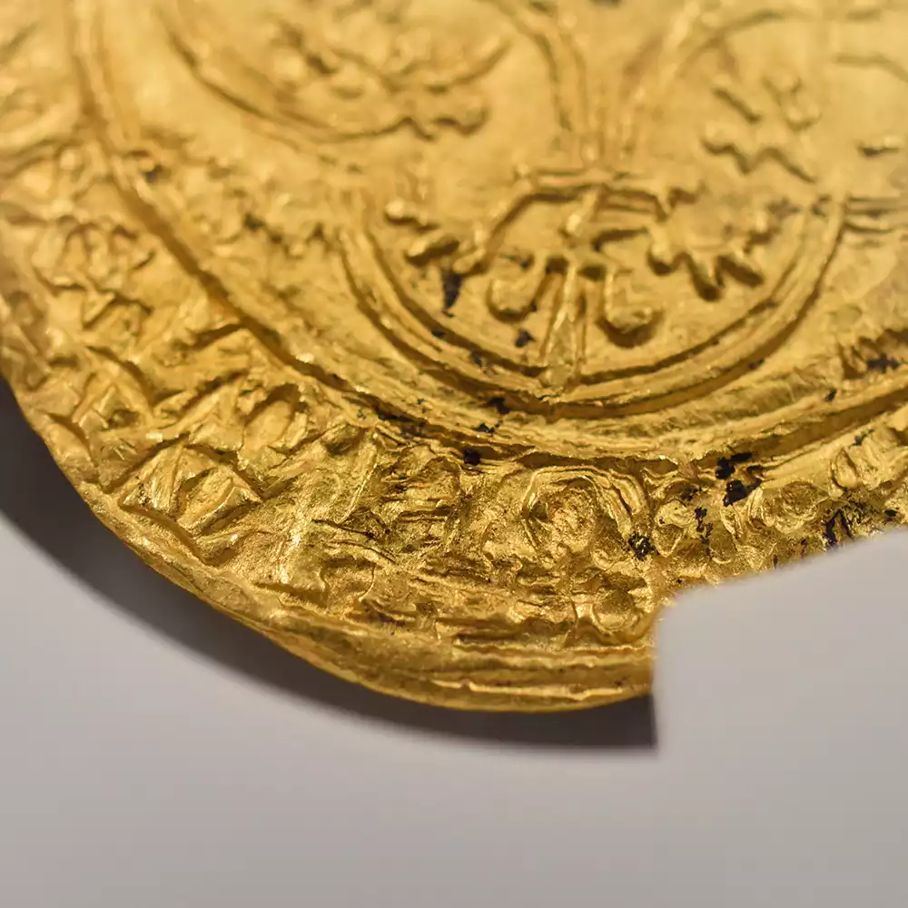シャルル6世の治世は42年間と比較的長期であったものの、その治世の大部分は王が患っていた精神障害によって廷臣たちやイングランド王室に翻弄された時代として記憶されています。王の生涯を苛んだ病状によって非常にネガティブな印象を持たれやすいシャルル6世の治世ですが、歴史上のシャルル6世を象徴する文化遺産である「シャルル6世のタロットカード」1セットが後世に残されており、現在、パリ国立図書館が所蔵していることが確認されています。現存する世界最古のタロットカードとして知られるこの遺品に関しては、王の在世当時の宮廷の会計帳に記されていた「金色と他の色で着色された56枚の遊戯札」の記述と、それらのカード3セット分の制作費として、1392年に王室が画家ジャクマン・グランゴヌールにペルシャ硬貨6枚を支払ったという記録が残っています。シャルル6世の長期在位を象徴するもう一つの物的証拠として、今回ご紹介させていただく「エキュドール金貨」が挙げられます。精緻極まりない装飾性によって中世フランス金貨の華と謳われるこの歴史的な貨幣は、正式には「エキュ・ドール・アラ・クロンヌ=王冠を配した黄金の盾」と称され、その名称のごとく上部に王冠を戴く盾形の紋章を表面中央に描く重厚なデザインによって、中世フランスアンティークコインの中でも人気の高い逸品として知られているものです。盾の中にはフランス王位を象徴する紋章「フルール・ド・リス」が絶妙な間隔で配置されており、シャルル6世の王位の正統性を誇示しています。その周囲には「神の恩寵によるフランス国王シャルル」を意味するラテン語碑文が掲げられており、碑文の文体が当時のフランスにおける高度な貨幣鋳造技術を物語っています。裏面中央にはフルール・ド・リスを多様化した装飾的な十字紋が刻まれており、フランスコインならではの満艦飾の装いに目を奪われます。あらゆる角度から見て最高度の芸術性が顕著な当コインは、伝説の国王シャルル6世が生きた時代のフランス宮廷の栄華を我々の時代に伝える文化遺産として永遠の価値を有しています。