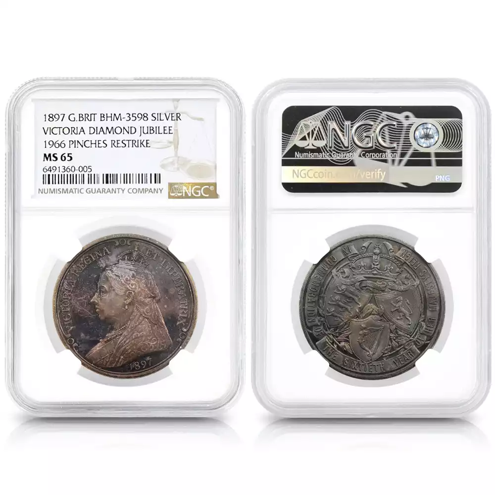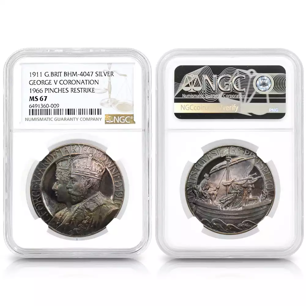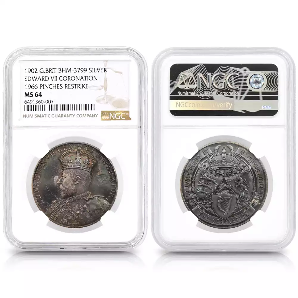 今回ご紹介させていただく7枚セットの銀メダルは、ロンドンに本拠を置くメダル制作のスペシャリスト、ジョン・ピンチェス社が1966年に制作した芸術性の高い逸品であり、過去に発表された国王と王妃の横顔を描く歴史的なメダルに付された肖像を忠実に復刻する名企画として発表された逸品です。ヴィクトリア期以降のメダル肖像の大作の数々を網羅するそのコレクションは、コインとしては存在しないメダルならではの希少価値の高いポートレートを厳選しており、素材としてのシルバーの質感がそれらの古典的なメダル・ポートレートの格調高い美しさを際立たせています。1838年に挙行されたヴィクトリア女王の戴冠式の記念に発行された「戴冠記念銀メダル」と1897年の「ダイアモンドジュビリー記念銀メダル」を始め、それ以降に日の目を見た歴代国王の戴冠式やジュビリー関連全7種のシルバーメダルを復刻する当コレクションは、それぞれのメダルの発行当時の驚異的な美しさとシルバーメダルならではの古色を忠実に再現する絶妙な手法によって、コレクション全体の歴史的価値と魅力を高めることに成功しています。1952年のエリザベス2世の即位によって新時代を迎えた英国貨幣界ですが、当メダル・コレクションは、英国王室の過去の栄光を映し出す鏡として、今後益々その真価を発揮することでしょう。