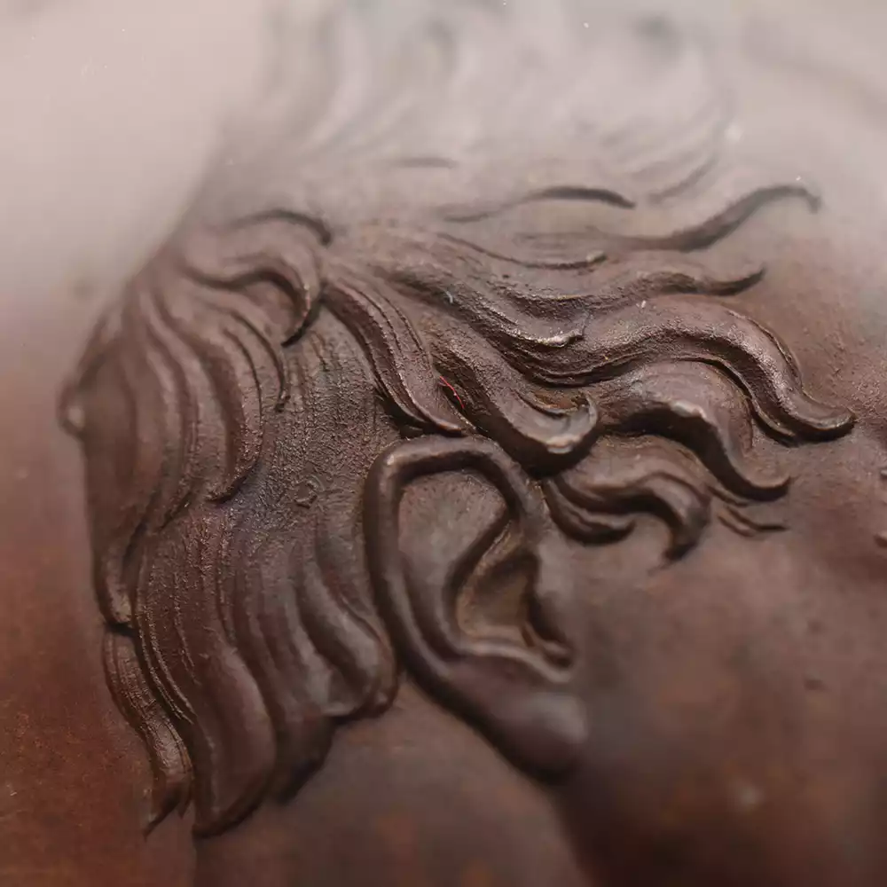1830年に即位したウィリアム4世の治世はわずか7年間と非常に短かったものの政務の面においては充実した期間であり、次のヴィクトリア期に向けての過渡期として歴史的にも重要な役割を果たしました。王の治世下に断行された数々の改革の中でも、とりわけ貧困層や若年者の就労環境の改善や教育機会の見直し等が特筆すべき功績として挙げられます。姪のヴィクトリア女王に対する親子のような愛情は特に有名で、「私はヴィクトリアが成人するまで生き永らえなければならない」というのが王の口癖であったようです。今回ご紹介させていただく作品は、王の戴冠式の年、つまり1831年に開通したロンドン橋の竣工を記念して制作されたアンティーク銅メダルの秀作です。ロンドン中心部を流れるテムズ川に架かる有名なタワーブリッジと並行して優美な姿を見せるロンドン橋は、対岸に位置する市内屈指の文化遺産であるロンドン塔と共に長らくロンドンの象徴として存在し、約2世紀にわたってテムズ川の水運を見守ってきました。当メダル表面には、発行当時66歳であった英国王ウィリアム4世の右向きの美しい肖像が掲げられています。当ポートレートのデザイナーとして知られるベンジャミン・ワイオンは、有名なウィリアム・ワイオンを筆頭とするコイン制作家一族ワイオン家の一員として知られ、19世紀初頭の英国貨幣界を支えたコインデザイナーとして重要な役割を果たしました。ポートレートの上部には王名「ウィリアム4世」がラテン語ではなく、珍しくも英語で刻まれています。そして裏面中央にはテムズ川に架かるかつて存在した旧ロンドン橋が格調高く描かれています。その下には工事の着工日である1825年6月15日の日付と、落成日1831年8月1日が堂々と刻まれています。銅貨ならではの濃厚な色彩感が当銅貨両面の古色に深みを与えており、ウィリアム4世が生きた伝説の時代と21世紀を結んでいます。空前の繁栄を誇る大英帝国の大成を目前に控えて開花しつつあった大輪の薔薇のような美しさを誇る当アンティーク銅メダルは、ウィリアム4世の栄光の治世の追憶に捧げられる歴史的遺産でもあります。