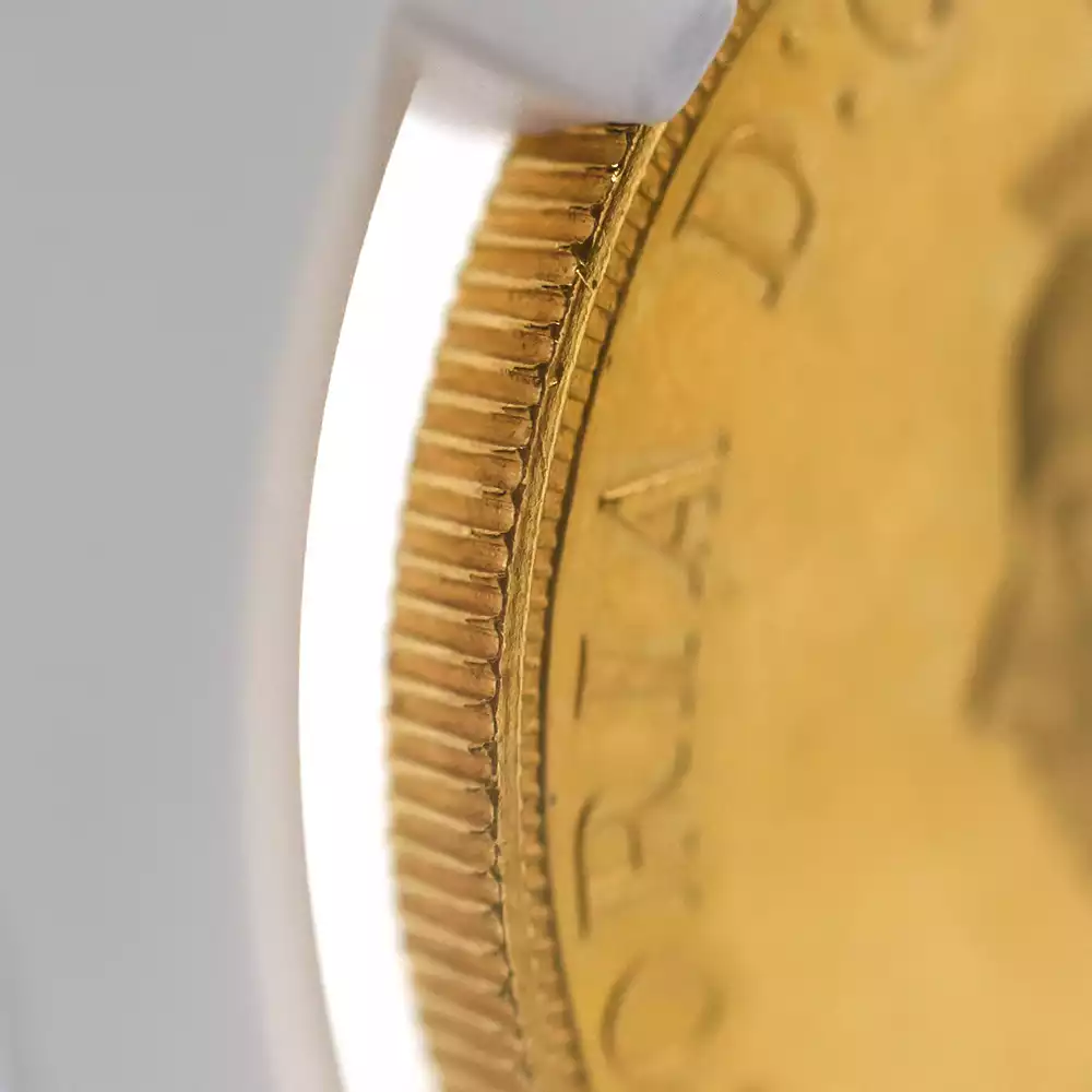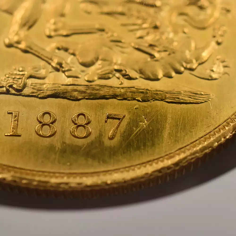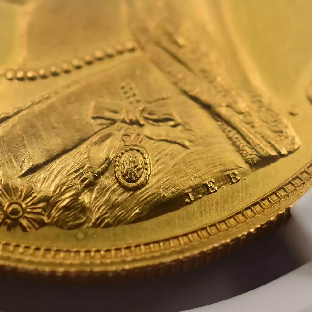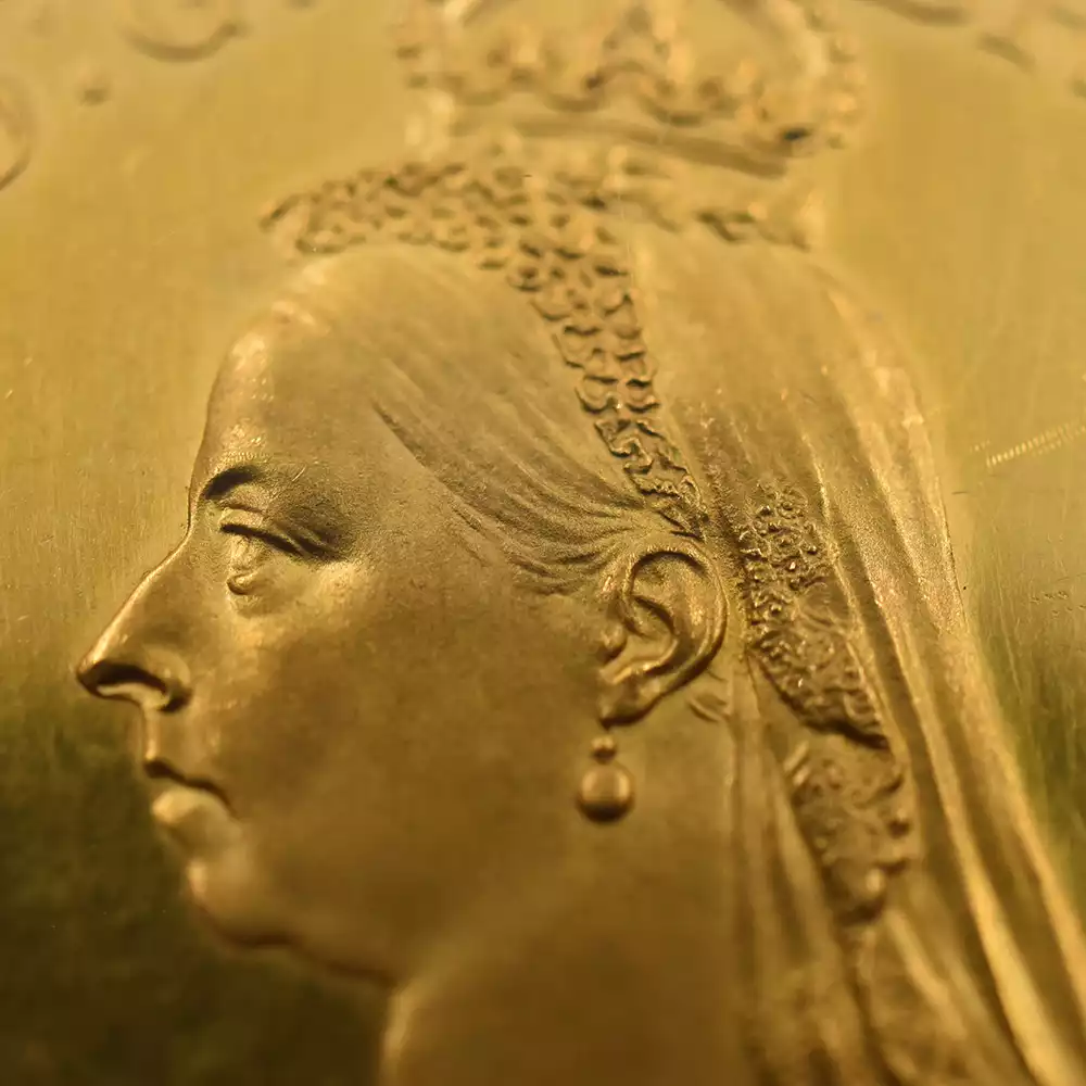 ゴールデンジュビリーのための公式コイン肖像として考案されたこの左向きのポートレートは、1887年当時の女王の風貌をゴールドコイン上に描き出す第一級の芸術品でもあります。1861年のアルバート公爵の急逝以降、1901年の自身の崩御の瞬間まで夫の喪に服していたことで知られているヴィクトリア女王ですが、このコイン肖像においてもそれは顕著であり、頭部から肩にかけてなだらかに垂れる未亡人のためのヴェールがそれを暗示しています。