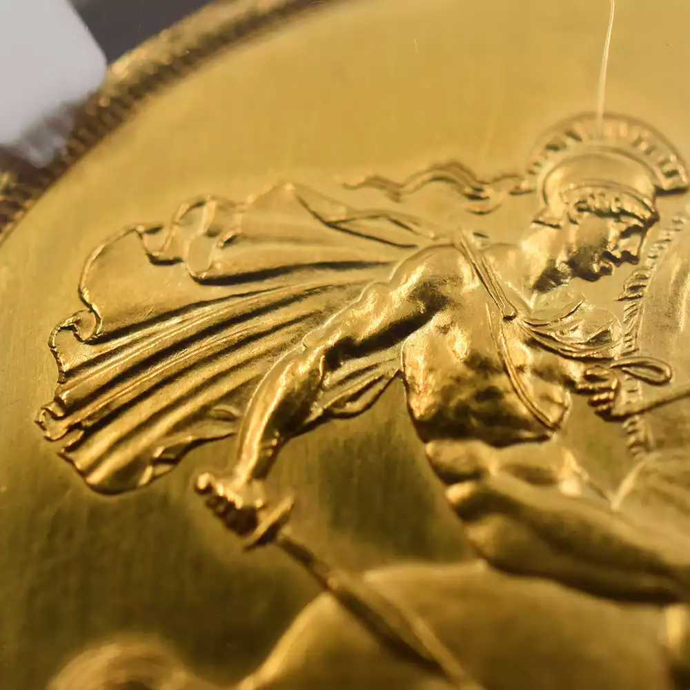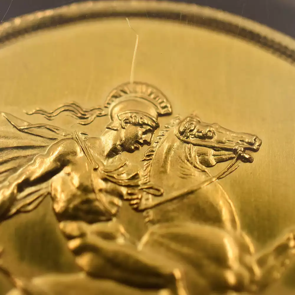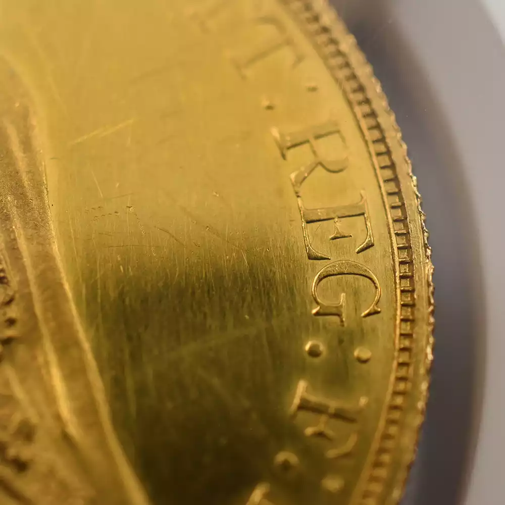 コイン裏面にはジョージ3世時代末期に名匠ベネデット・ピストゥルッチがデザインして以来、英国貨幣随一の傑作として受け継がれていた「聖ジョージの竜退治」が刻まれています。歴史上の人物としてのヴィクトリア女王の在位50周年を寿ぐ当金貨は、英国史の最盛期であった大英帝国の栄光を讃えると共に、英国貨幣史上の黄金期を象徴するこのゴールデンジュビリーを高純度のゴールドの輝きにて華麗に演出するアンティークコイン屈指の名作に他なりません。