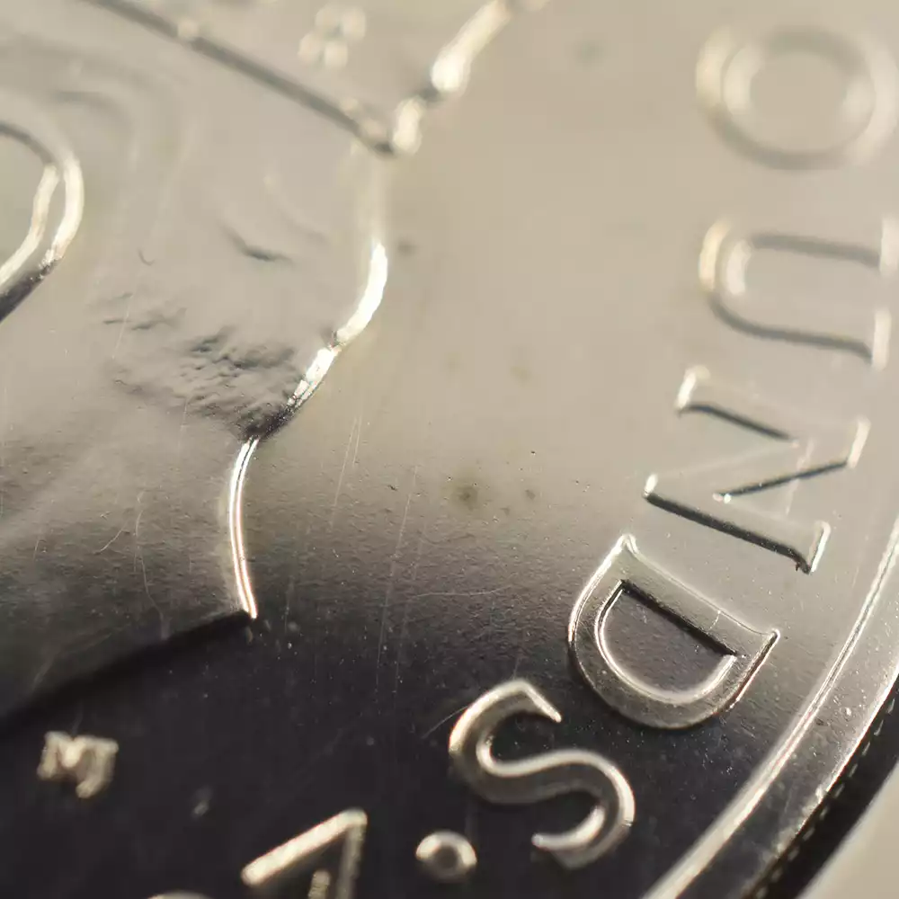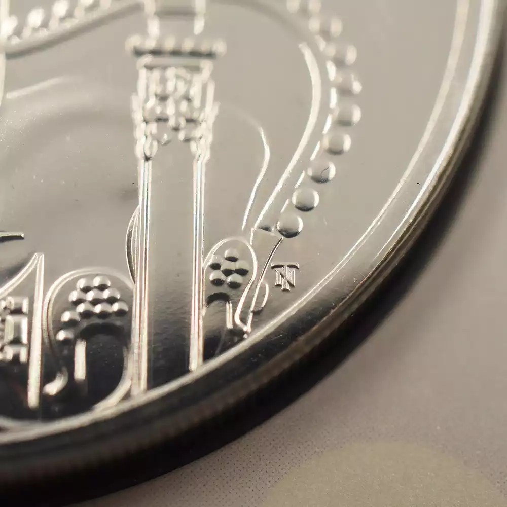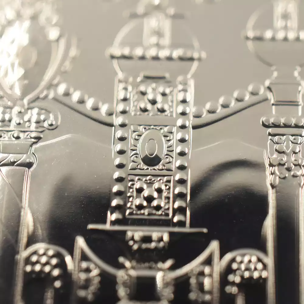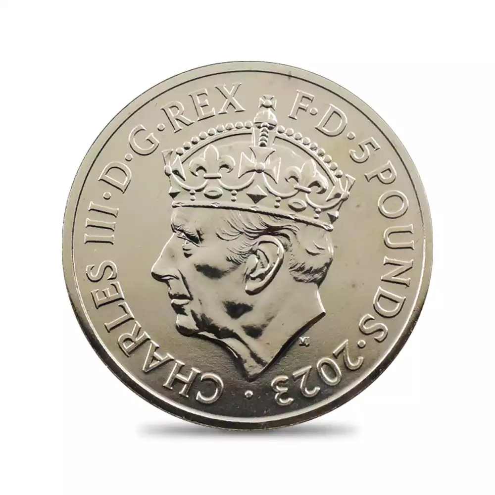 2023年5月6日、全世界が見守る中、ロンドンのウェストミンスター寺院においてイギリス連合王国の新国王チャールズ3世の戴冠式が執り行われました。新王妃となったカミラ夫人の戴冠式も同式中にて実現し、さながら一幅の王朝絵巻のごとく様相を見せる式の全貌を映し出すテレビ放映は、全くもって壮観の一語に尽きました。今回ご紹介させていただく作品は、チャールズ3世の戴冠式開催の記念に発行された新しい5ポンド貨であり、英国貨幣界が総力を結集して式の開催を恒久化する記念碑的大作に他なりません。即位後にイギリス連合王国が発行した一連の新貨幣表面にはロイヤルミントの実力派デザイナー、マーティン・ジェニングスによる新しい肖像が描かれ、その芸術性豊かな表現力とリアリズムを基調とする写実性によって各界からの好評を博しました。そしてこの度発表された当戴冠記念5ポンド貨表面のポートレートは、この記念すべき瞬間を祝して代々受け継がれてきた最重要王室祭具である「聖エドワード王冠」が新たに付け加えられ、一層の芸術的効果の充実が図られています。肖像周囲の碑文もまた趣向を凝らしたものであり、基本的には定型のラテン語碑文ではあるものの、国王の王名部分のみが通常のラテン語名の「CAROLUS」ではなく、英語名の「CHARLES」に置き換えられている点に現代社会に対する配慮が感じられます。また裏面には王冠を始めとする王室祭具三点がバランスよく配置されており、戴冠式記念貨ならではの壮麗豪華な様相を見せていて圧巻です。式の日付と共に刻まれた「国王チャールズ3世の戴冠式」の一文は、世界を歓喜の渦に巻き込んだこの千載一遇の機会をコイン上にて普遍化するに相応しい品格を感じさせます。あらゆる角度から見て祝祭感満載の当コインは、新国王と共に新たな時代を迎えたばかりの現代英国の無限の歓喜を余すところなく表出するアニバーサリーコインの極致です。