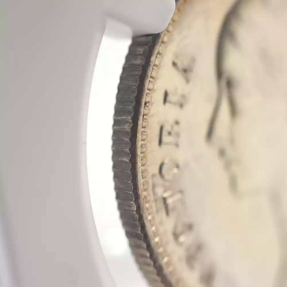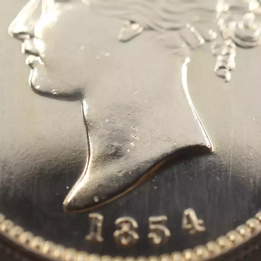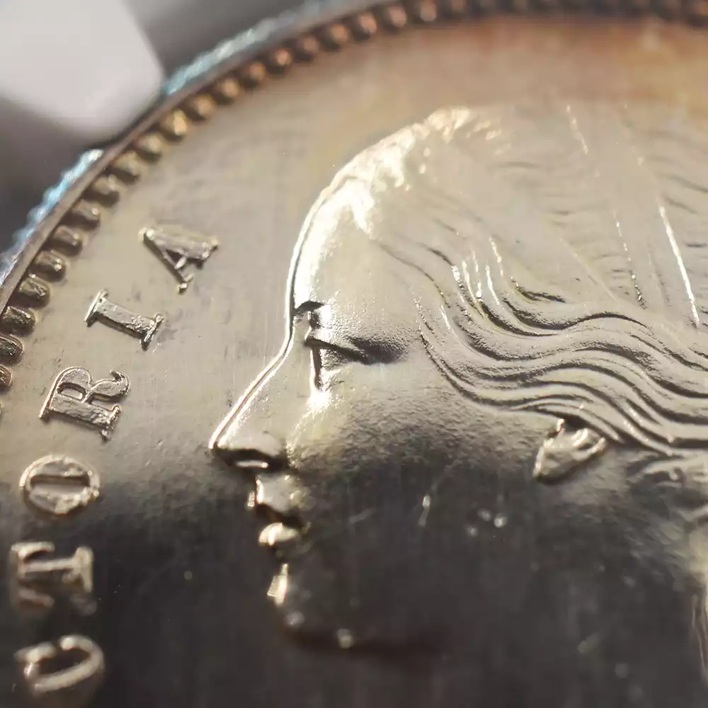 表面には大英帝国の宗主ヴィクトリア女王の公式コイン肖像として有名な「ヤングヘッド」が描かれており、古き良き時代を感じさせます。英国貨幣史上におけるコイン肖像の最高傑作の一つに数えられるこの作品は、当時を代表する天才彫刻家ウィリアム・ワイオンがキャリア最初期に制作した不朽の名作です。「ワイオン氏ほどに私を私が描いて欲しいように描いてくれる作家は他にいません」と女王自身に言わしめるほどの実力の持ち主であったワイオンは、若き日の女王の清々しい横顔を極めて正統的な写実性によってコイン上に描き出し、成功を収めました。
