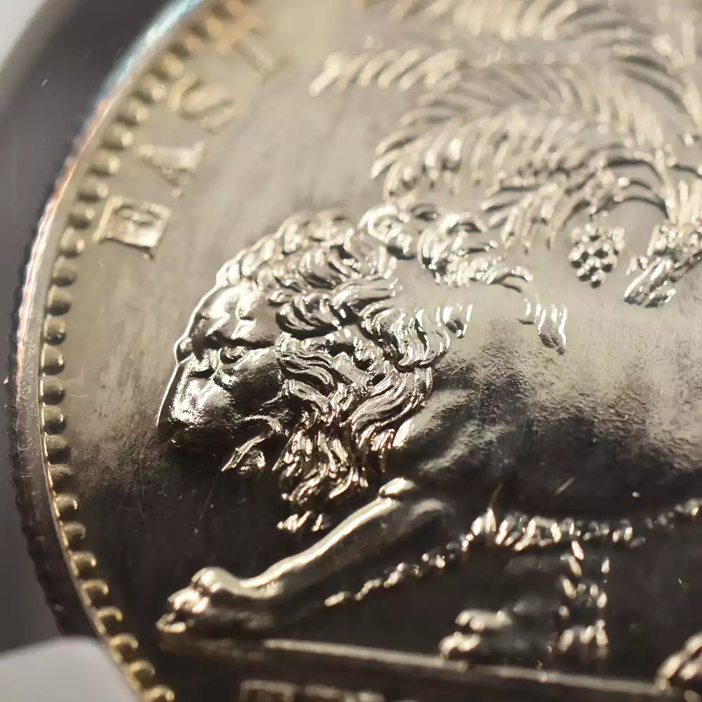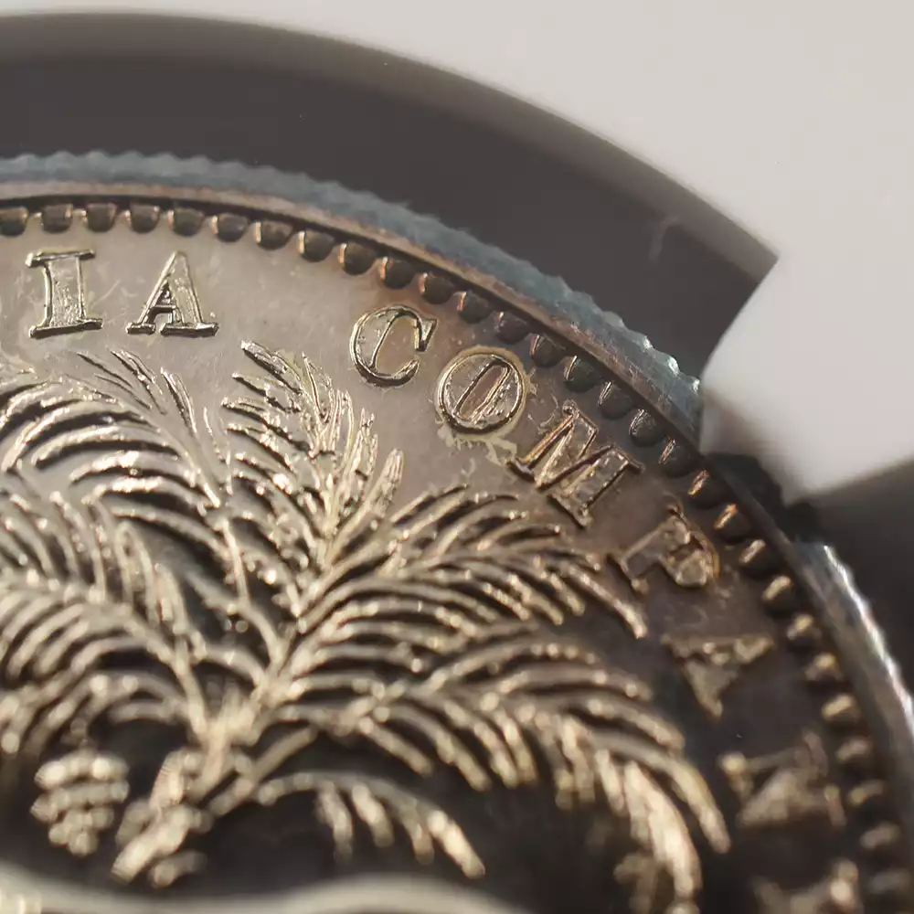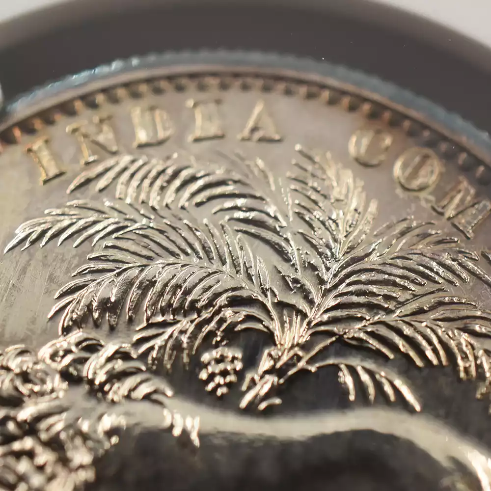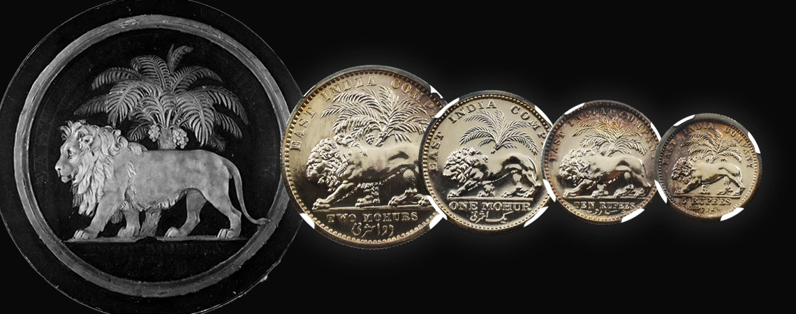 ©ウィリアム・ワイオン作モハール貨裏面モデル(左)British Museum 当コインセットに含まれる銀貨4枚のデザインはどれも同じものですが、裏面のヤシの木とライオンの意匠もまたワイオンの手による傑作として知られ、現在も依然として高い人気を誇ります。当時の英国本国の貨幣には決して見られない英領インド時代ならではのこの名デザインは、インドを中心として世界的に活躍した東インド会社の栄光の軌跡をコイン上に留めるものでもあります。貿易決済用通貨であったという性質上、具体的な発行枚数は定かではないものの、この年代の英領インドで発行された銀貨のみのセットコインと言うのは英国貨幣史を見渡しても殆ど例がなく、最高度の希少価値を持つものであることは確かです。大英帝国の頂点を極めたヴィクトリア女王の横顔を描く当コインセットからは、当時世界を舞台として活躍した東インド会社の栄光の年月の重みが現代に生きる我々にひしひしと伝わってきます。