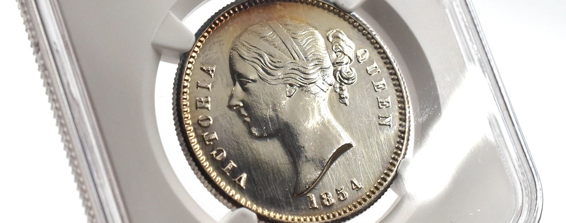 今回ご紹介させていただく作品は、インドを貿易の中間地点として隆盛を誇った東インド会社が1854年に現地で発行した4枚の銀貨から成る大変珍しいコインセットです。