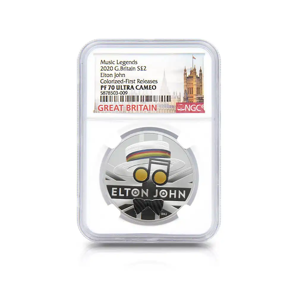 2020 エリザベス2世 ミュージックレジェンド第2弾 エルトンジョン 2ポンド銀貨 ファーストリリース NGC PF70UC(国会議事堂) 箱付き