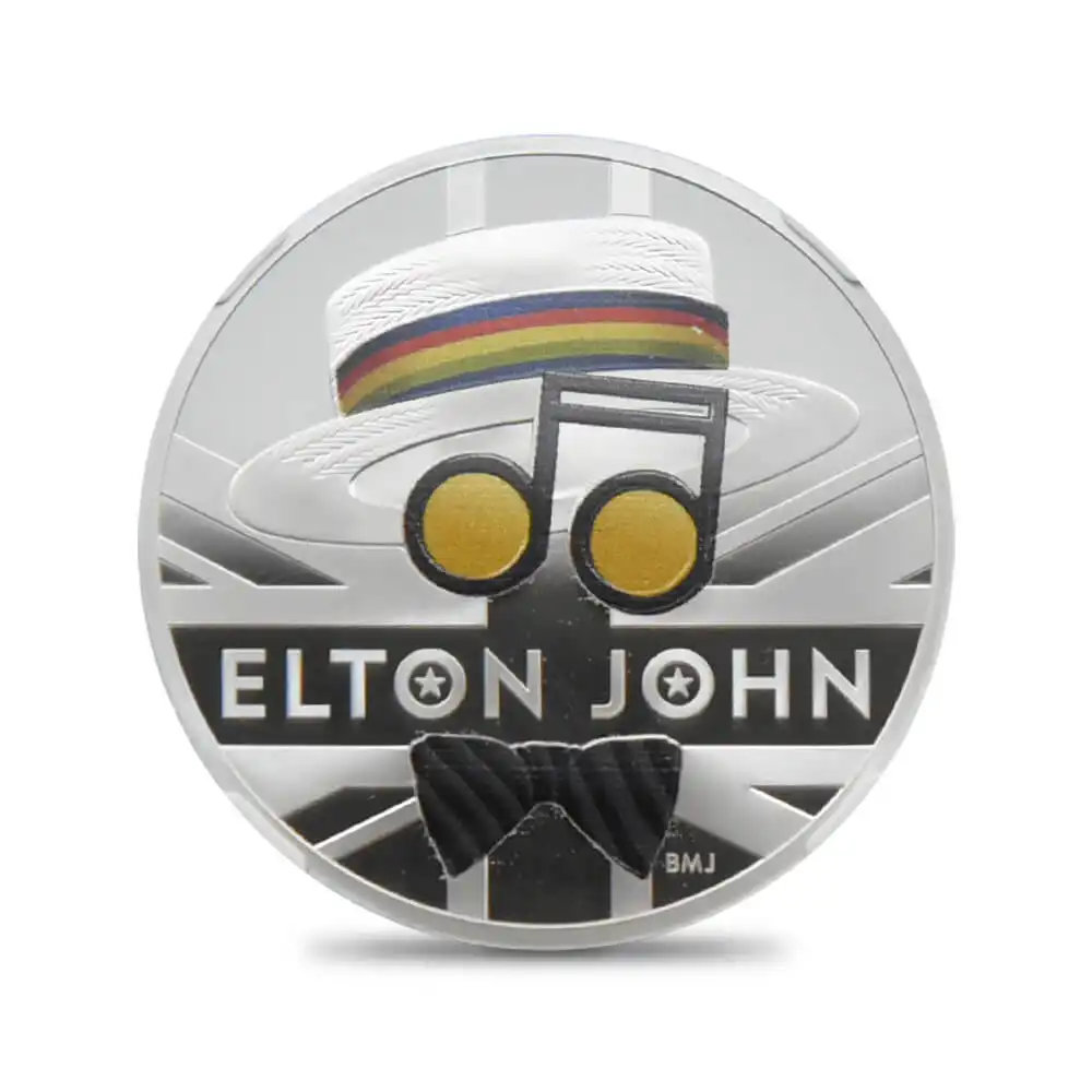 今回ご紹介させていただく当コインは、ロイヤルミントのデザインコンテストで優勝経験のある気鋭のデザイナー、ブラッドレイ・モーガン・ジョンソンが手がけたセンス溢れる芸術作品です。驚くほど緻密な技術と研ぎ澄まされたセンスによって生み出された当コインのデザインには、エルトン・ジョンのアイコンというべき麦わら帽と音符をモチーフとしたサングラス、そして蝶ネクタイが描かれており、一目でエルトン・ジョンを想起させるほどの個性を感じさせます。これらのモチーフの背景には、ユニオンジャックが刻まれており、英国を代表する偉大なミュージックアーティストをひと際輝かせています。