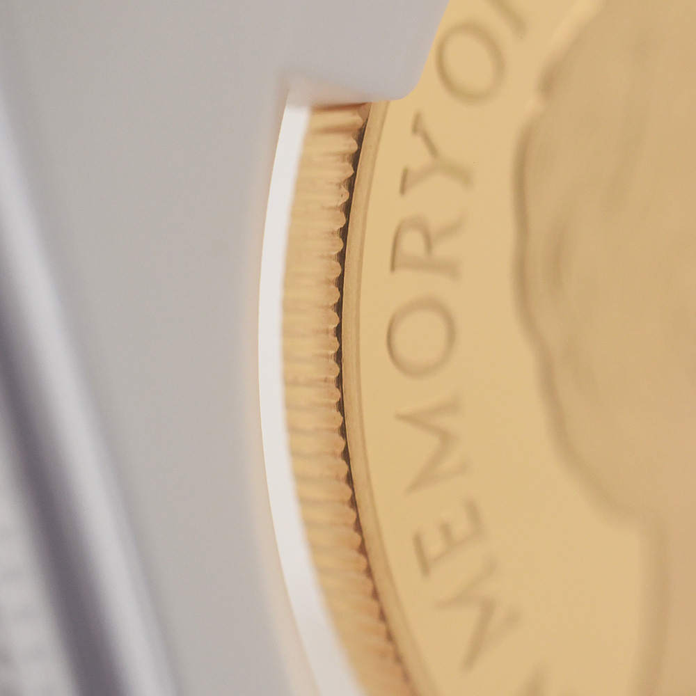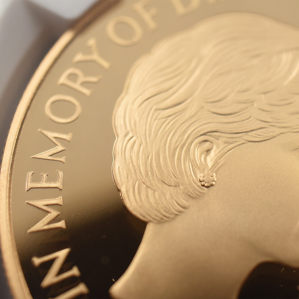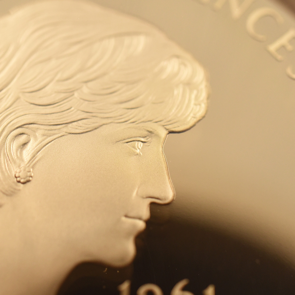 1999年、元妃の死から2年の時を経てリリースされたこの5ポンド金貨は、生前のダイアナ元妃の面影を刻む英国内で発行された唯一の記念金貨です。頭上には皇太子妃の高位を示すティアラも装飾品も見当たりません。そこにはただうつむき加減に頭を下げ、美しくも謙虚な自由人としてのダイアナ元妃の姿のみが忠実に再現されています。元妃ほど世界中で愛された人物は歴史上そう多くはないはずですが、今は亡き元妃の存在が一層生命力を帯び、元妃が掲げた利他愛が今でもこの世に生き残り、元妃の伝説と共にますますその真価を発揮しているということをこの金貨は力強く物語っています。他者に対する限りない愛情のみが永遠であるということを、コインの中の元妃の肖像はただただ無言で語りかけてくるようです。