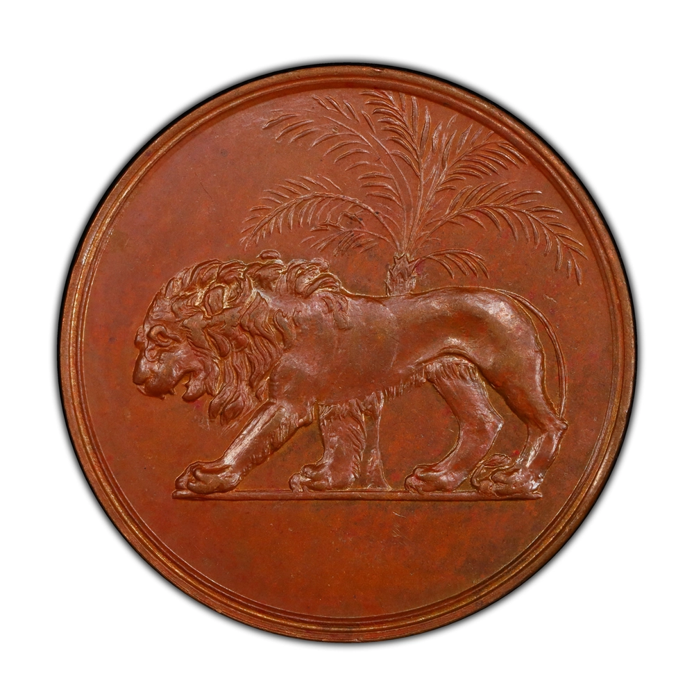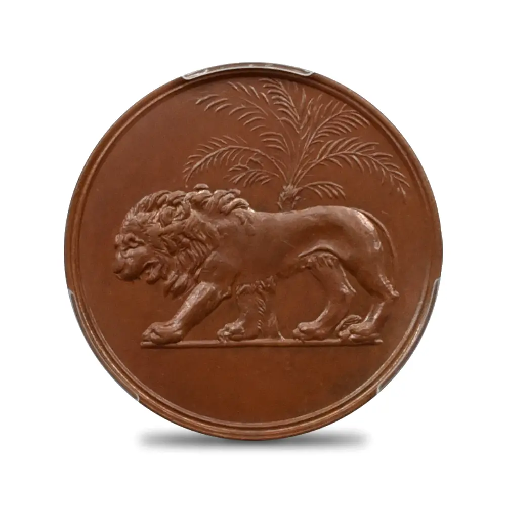 コイン表面には後年継続的に発行されていたモハール貨においても顕著で人気の高いライオンとヤシの木が描かれています。英国本国の貨幣には決して見られない野生的な美しさを見せるこの名デザインは、英国にとっての中間貿易地として繁栄を極めていた当時のインドと、史上最強の国家として隆盛を誇った19世紀の大英帝国の権威を如実に物語っています。