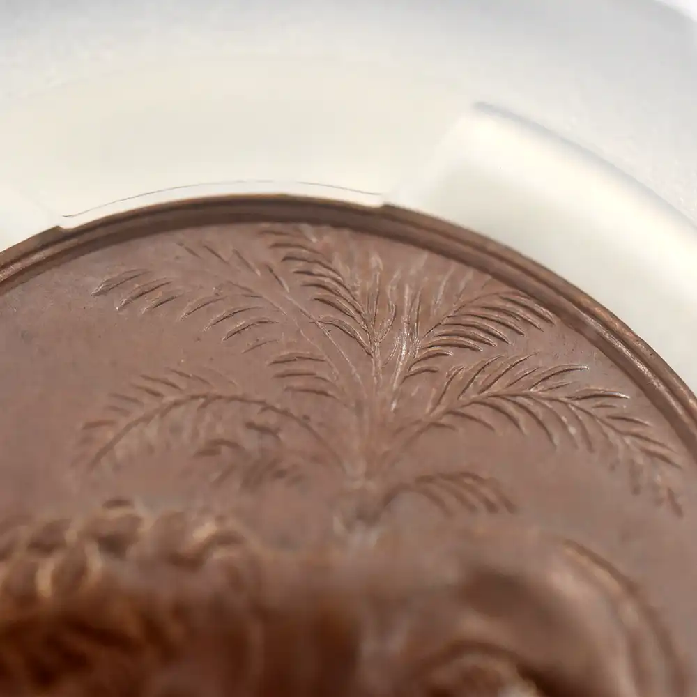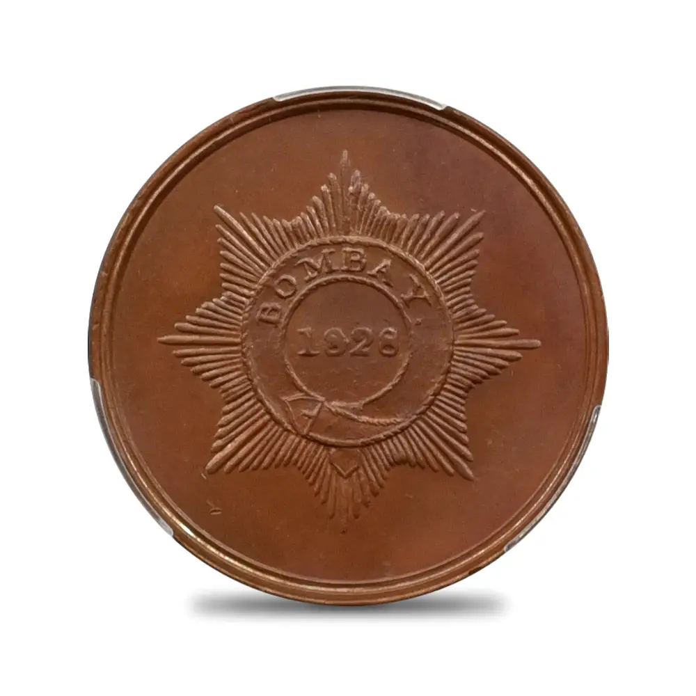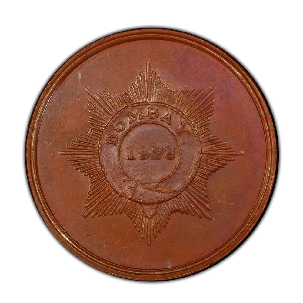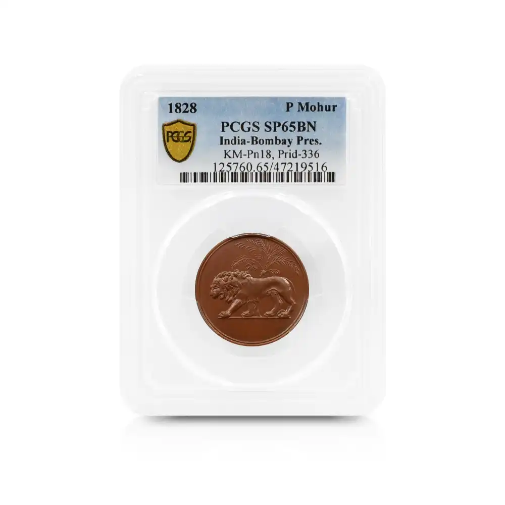 今回ご紹介させていただく作品は、ジョージ4世の治世下の1828年に英領インドのボンベイ管轄区で発行された、超絶的な希少価値を誇る試作モハール銅貨であり、この種のコインとしては最初期の例に当たります。