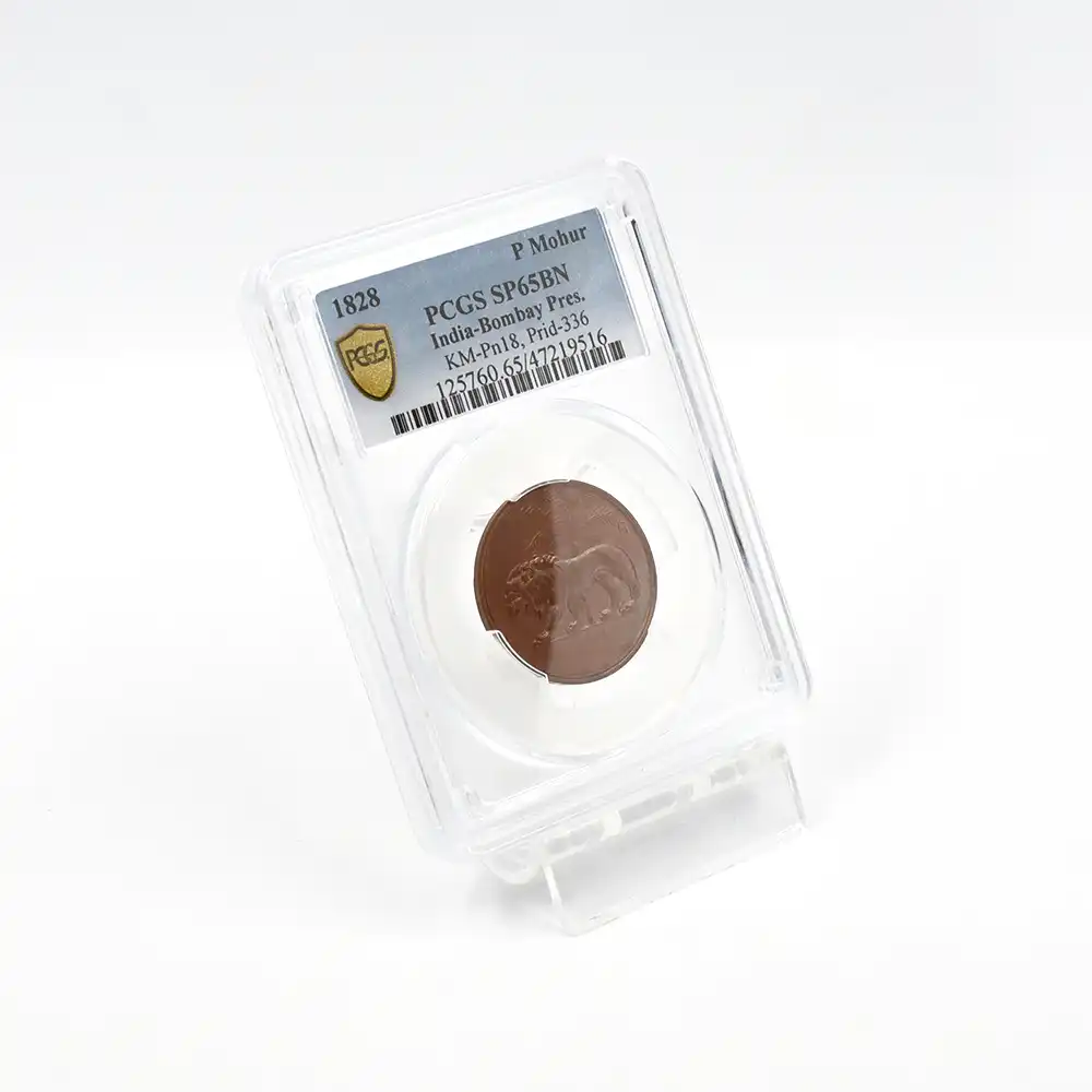 現在、この種のモハール貨は英国コインに分類され、希少価値の高いコレクターズアイテムとして珍重されています。史上初の英領インドのモハール貨が通貨として流通したのは1830年のウィリアム4世の即位以降とされていますが、当モハール銅貨は王の即位の年よりもさらに二年前の1828年に制作された歴史的なレアリティーです。モハール貨の過渡期に試作的な目的で鋳造されたと思しき極めてシンプルなデザインを特徴とする当銅貨ですが、試行錯誤を重ねているうちにジョージ4世が崩御し、新国王ウィリアム4世の時代を迎えてしまったというのが正当な解釈のようです。国王の肖像が描かれているモハール貨としてはウィリアム4世のものを筆頭に、ヴィクトリア女王、エドワード7世、そしてジョージ5世のものと4代にわたる種の存在が確認されていますが、当銅貨はそれら以前に発行された肖像なしの試作コインであり、この種のもので銅貨が存在したという事実は、今日の英国貨幣界にとって青天の霹靂であったことでしょう。